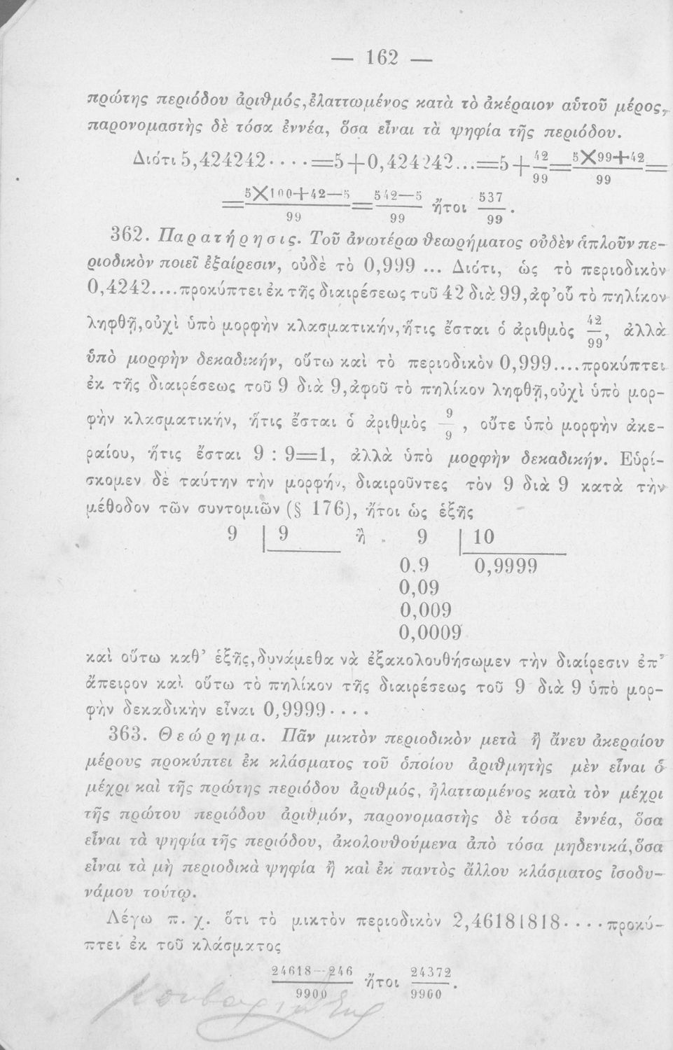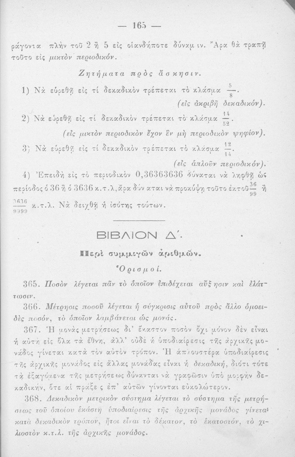 Σχολικό εγχειρίδιο Αριθμητικής για τις Α΄, Β΄, Γ΄ Γυμνασίου και τα Ανώτερα Παρθεναγωγεία που είναι χωρισμένο σε θεωρία και ασκήσεις και εστιάζει στις αριθμητικές πράξεις με κλάσματα και ακέραιους και συμμιγείς