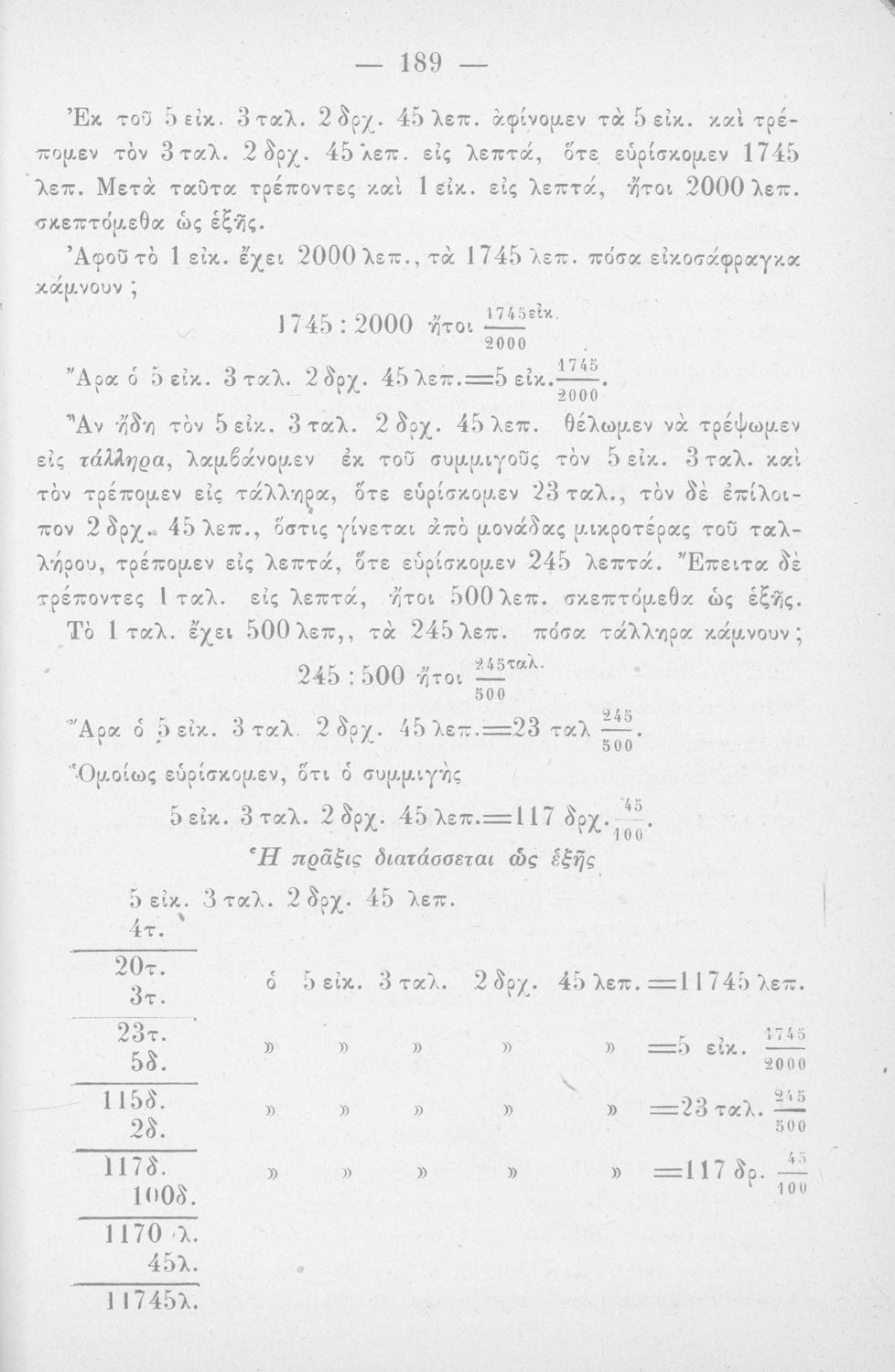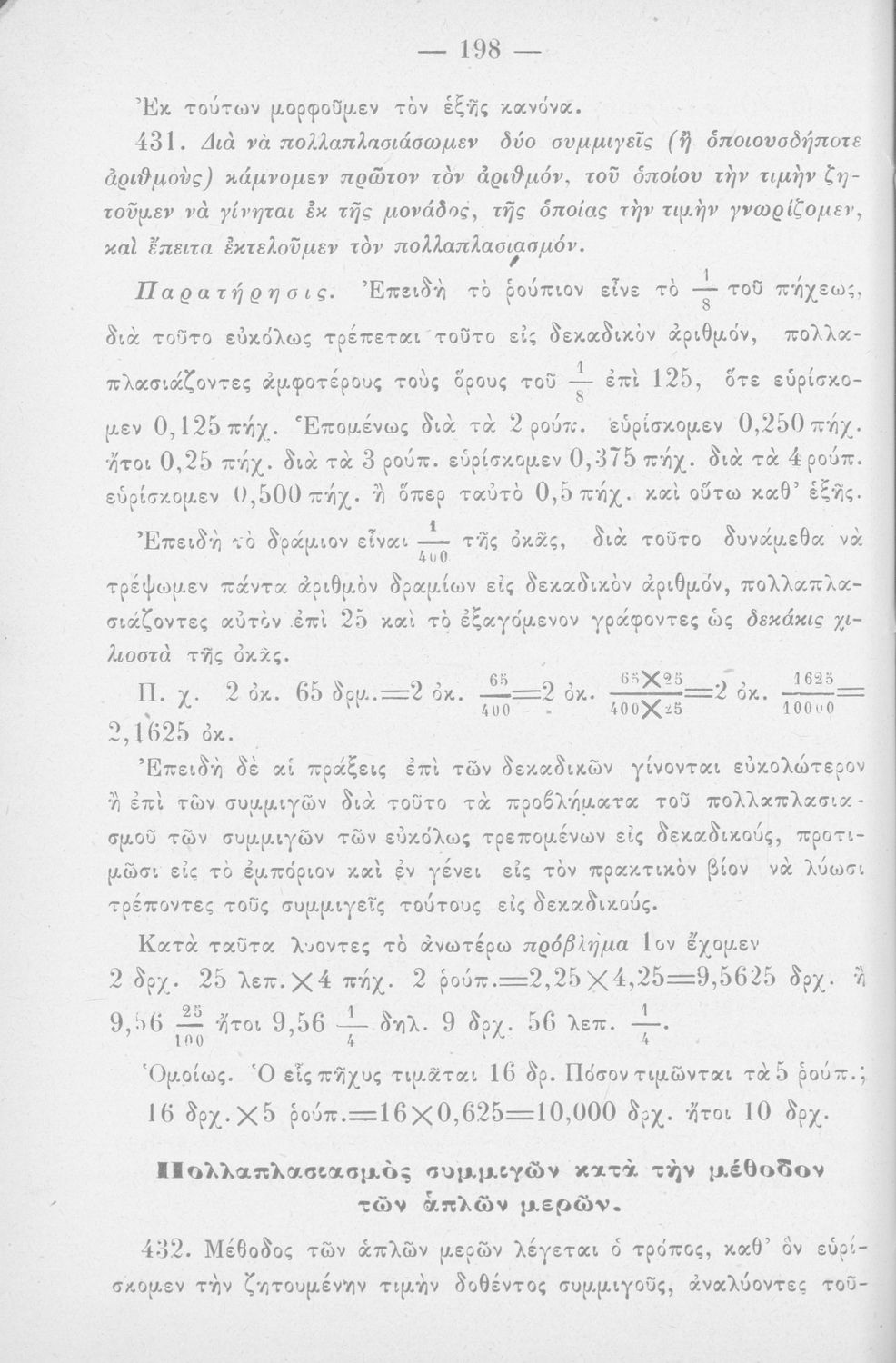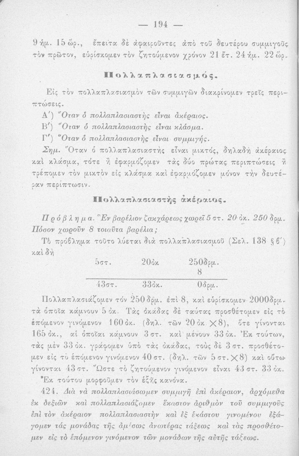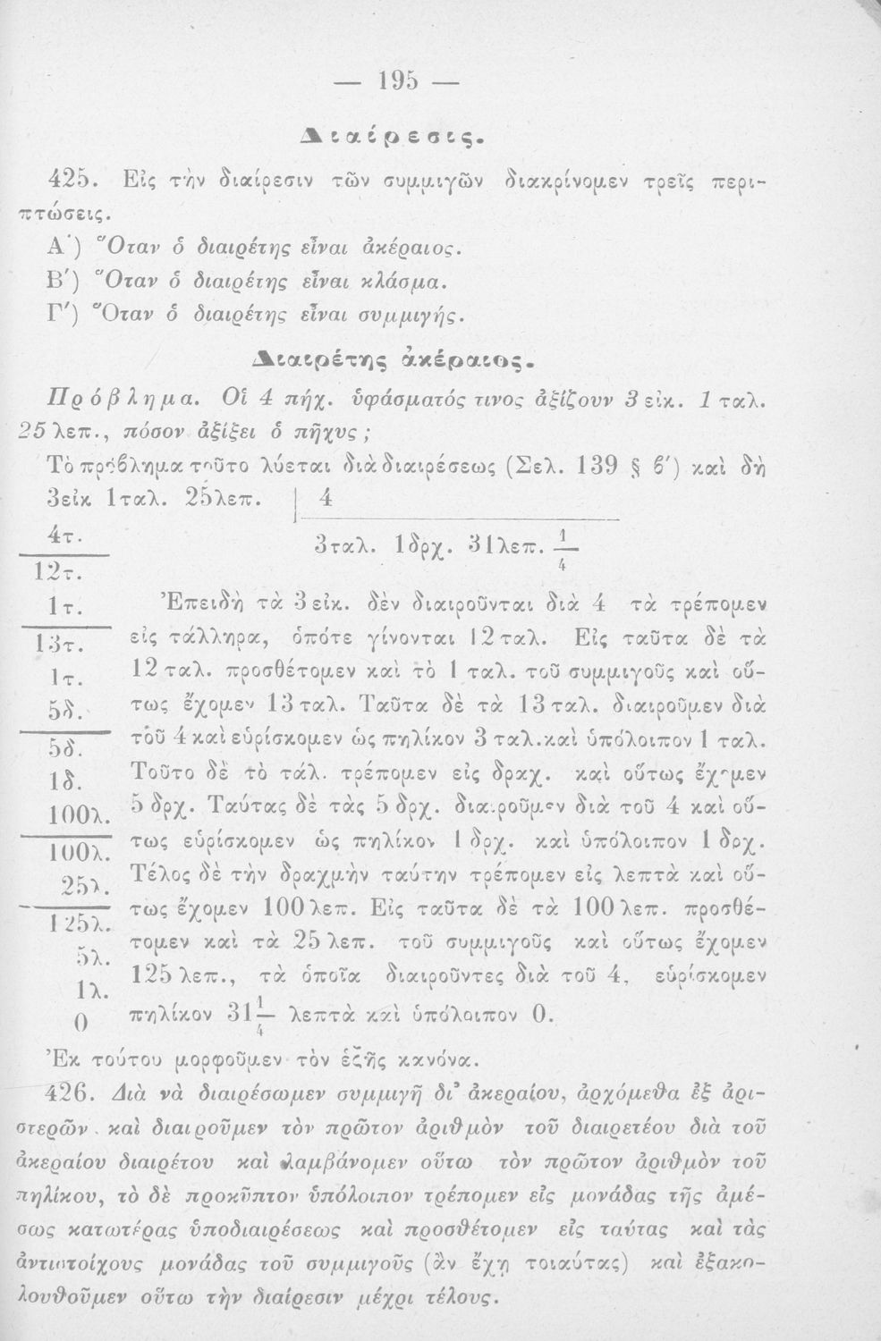 Βαθμίδα εκπαίδευσης: Δευτεροβάθμια Τάξη: Γυμνάσιο Μάθημα: Μαθηματικά Γλώσσα: Απλή καθαρεύουσα Παρουσίαση περιεχομένου: Μαθητικό βοήθημα Αριθμητικής Γυμνασίου που περιέχει θεωρήματα, παραδείγματα και ασκήσεις και εστιάζει στις αριθμητικές πράξεις με ακέραιους αριθμούς και κλάσματα. Ο συγγραφέας ήταν διευθυντής στην Δημόσια Εμπορική Σχολή Αθηνών. |
