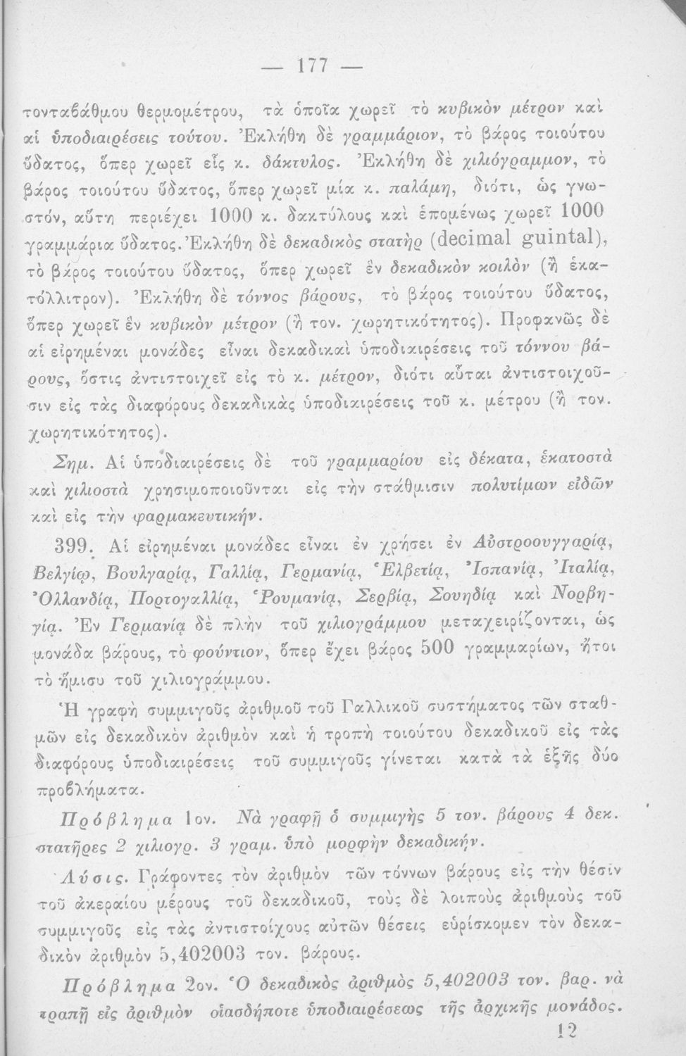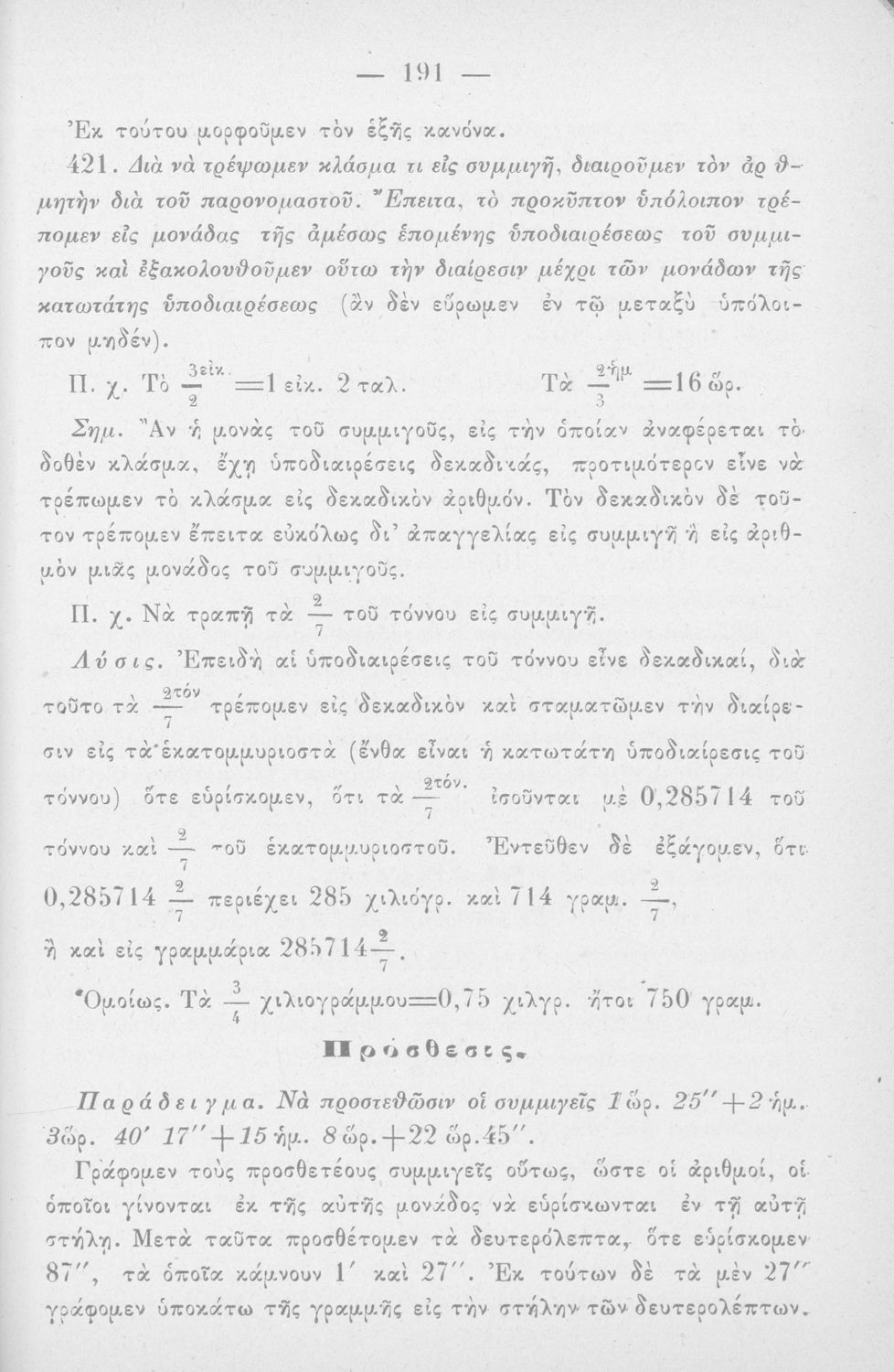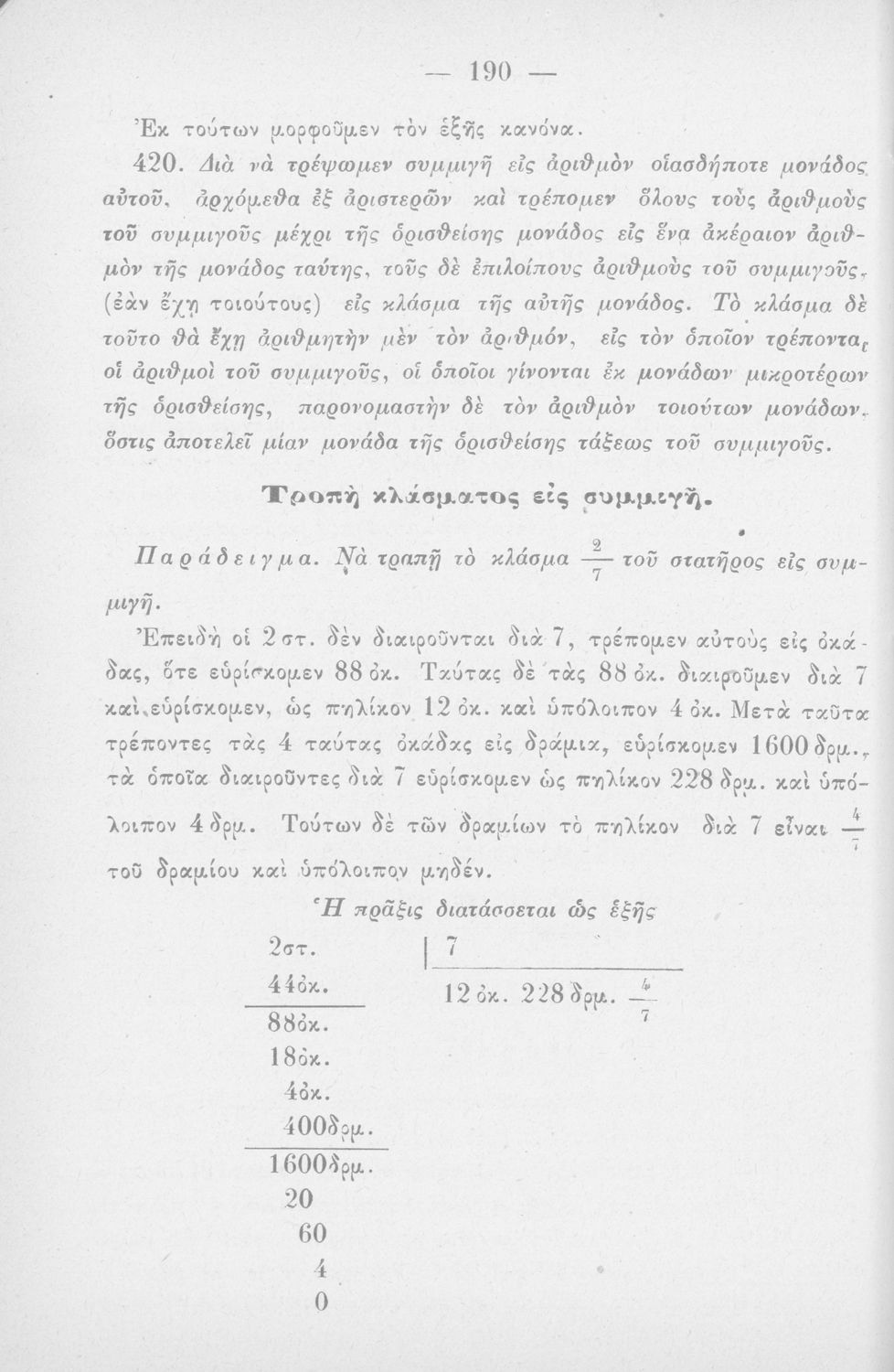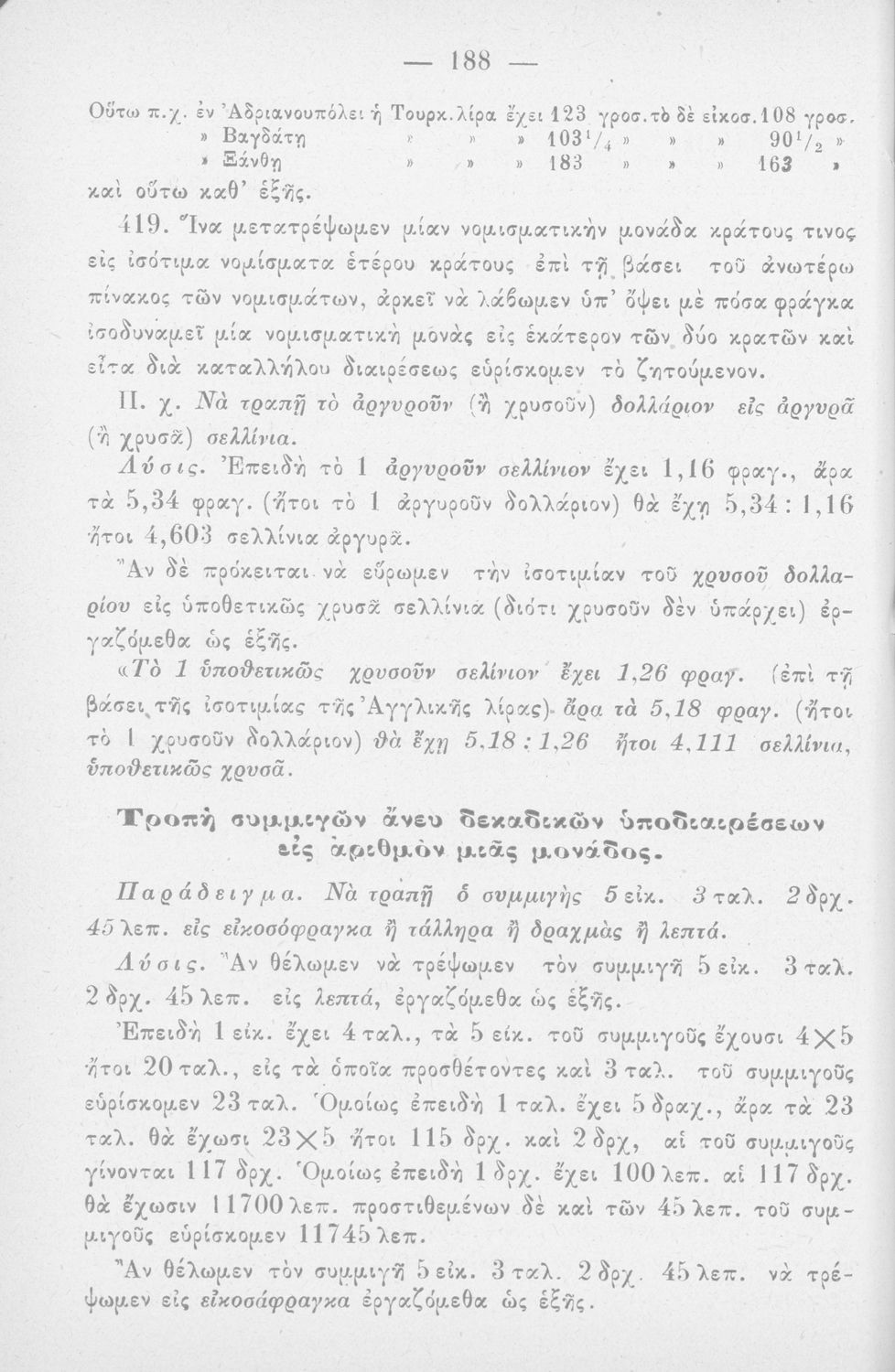 Βαθμίδα εκπαίδευσης: Δευτεροβάθμια Τάξη: Γυμνάσιο Μάθημα: Μαθηματικά Γλώσσα: Απλή καθαρεύουσα Παρουσίαση περιεχομένου: Μαθητικό βοήθημα Αριθμητικής Γυμνασίου που περιέχει θεωρήματα, παραδείγματα και ασκήσεις και εστιάζει στις αριθμητικές πράξεις με ακέραιους αριθμούς και κλάσματα. Ο συγγραφέας ήταν διευθυντής στην Δημόσια Εμπορική Σχολή Αθηνών. |