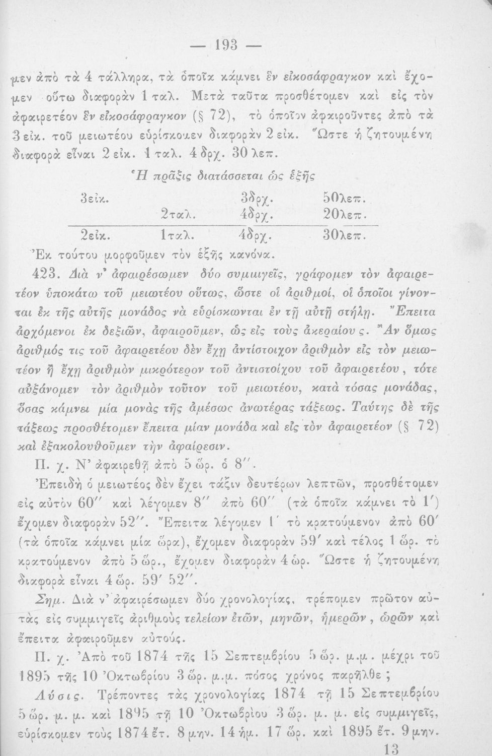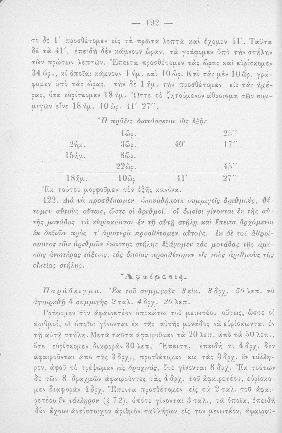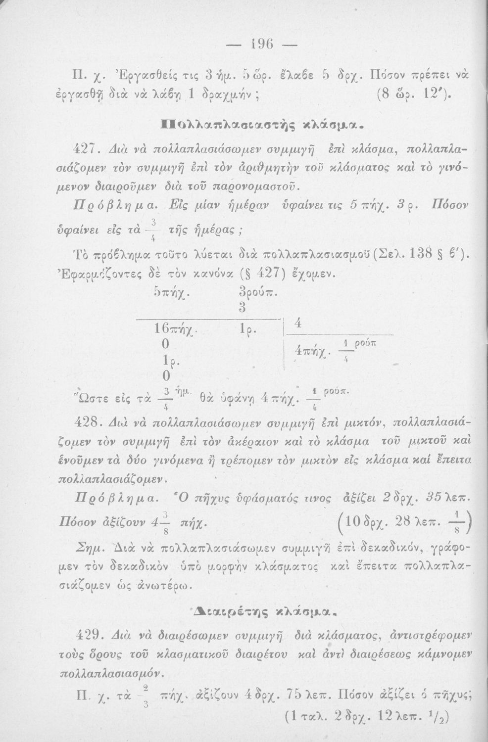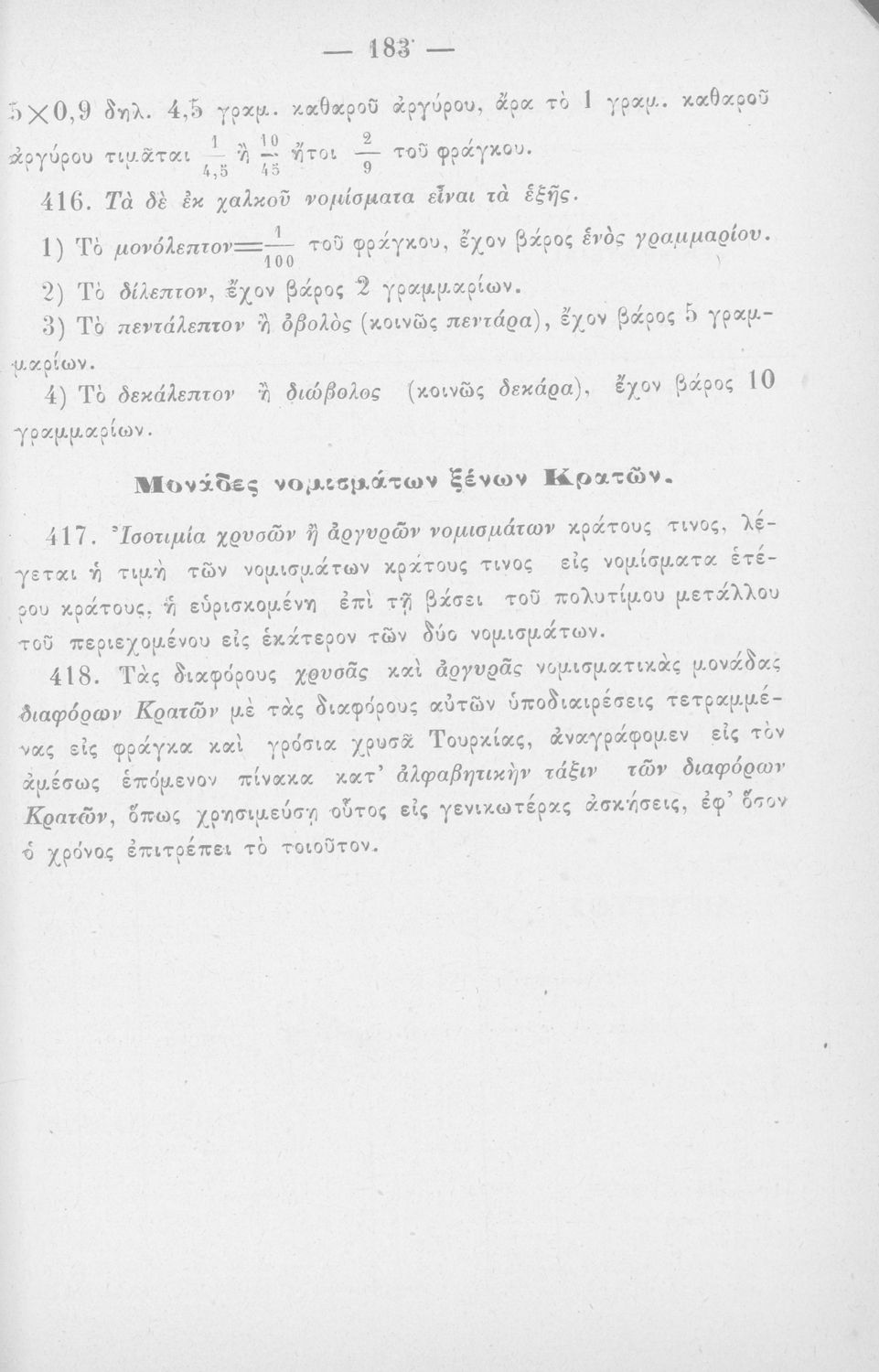 Βαθμίδα εκπαίδευσης: Δευτεροβάθμια Τάξη: Γυμνάσιο Μάθημα: Μαθηματικά Γλώσσα: Απλή καθαρεύουσα Παρουσίαση περιεχομένου: Μαθητικό βοήθημα Αριθμητικής Γυμνασίου που περιέχει θεωρήματα, παραδείγματα και ασκήσεις και εστιάζει στις αριθμητικές πράξεις με ακέραιους αριθμούς και κλάσματα. Ο συγγραφέας ήταν διευθυντής στην Δημόσια Εμπορική Σχολή Αθηνών. |