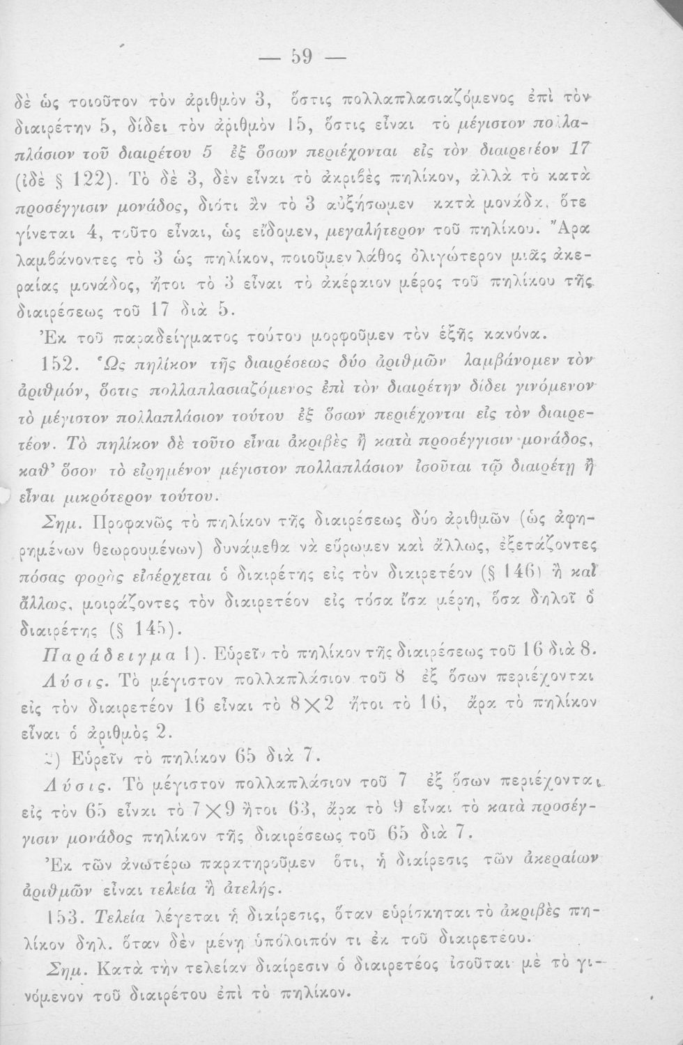 Σχολικό εγχειρίδιο Αριθμητικής για τις Α΄, Β΄, Γ΄ Γυμνασίου και τα Ανώτερα Παρθεναγωγεία που είναι χωρισμένο σε θεωρία και ασκήσεις και εστιάζει στις αριθμητικές πράξεις με κλάσματα και ακέραιους και συμμιγείς