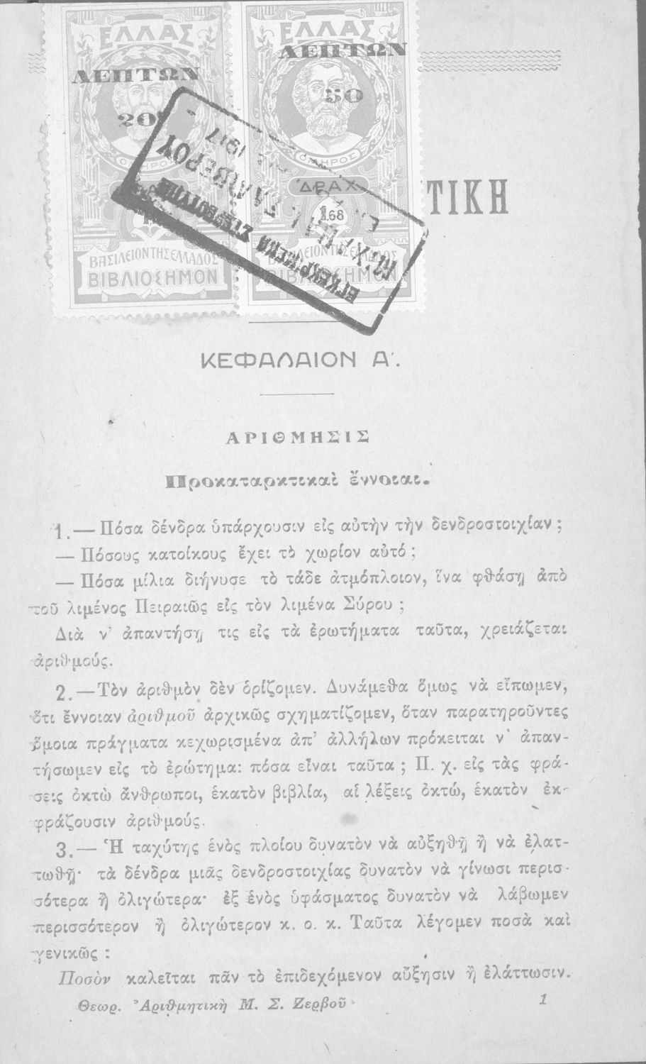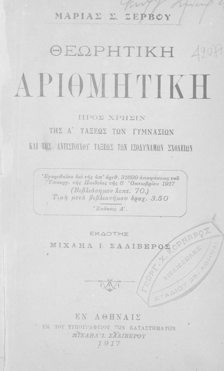 Τίτλος: Θεωρητική αριθμητική προς χρήσιν της Α΄ τάξεως των Γυμνασίων και της αντιστοίχου τάξεως των ισοδύναμων σχολείων