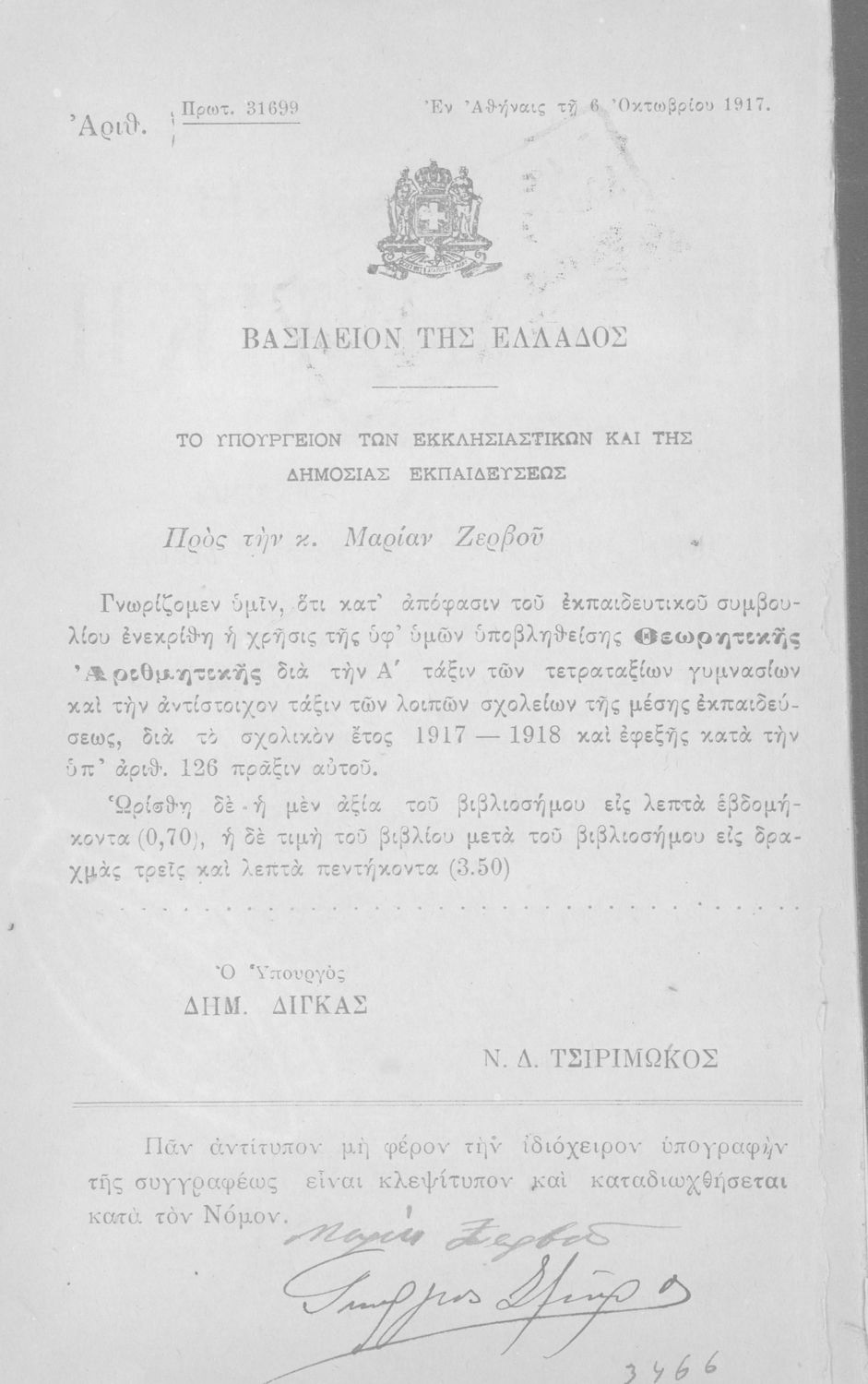 Υπουργική απόφαση / Σύμβαση: 31699/6-10-1917
