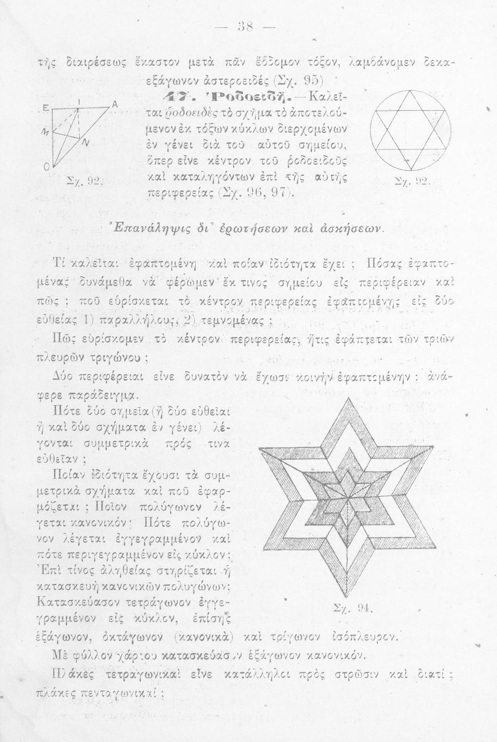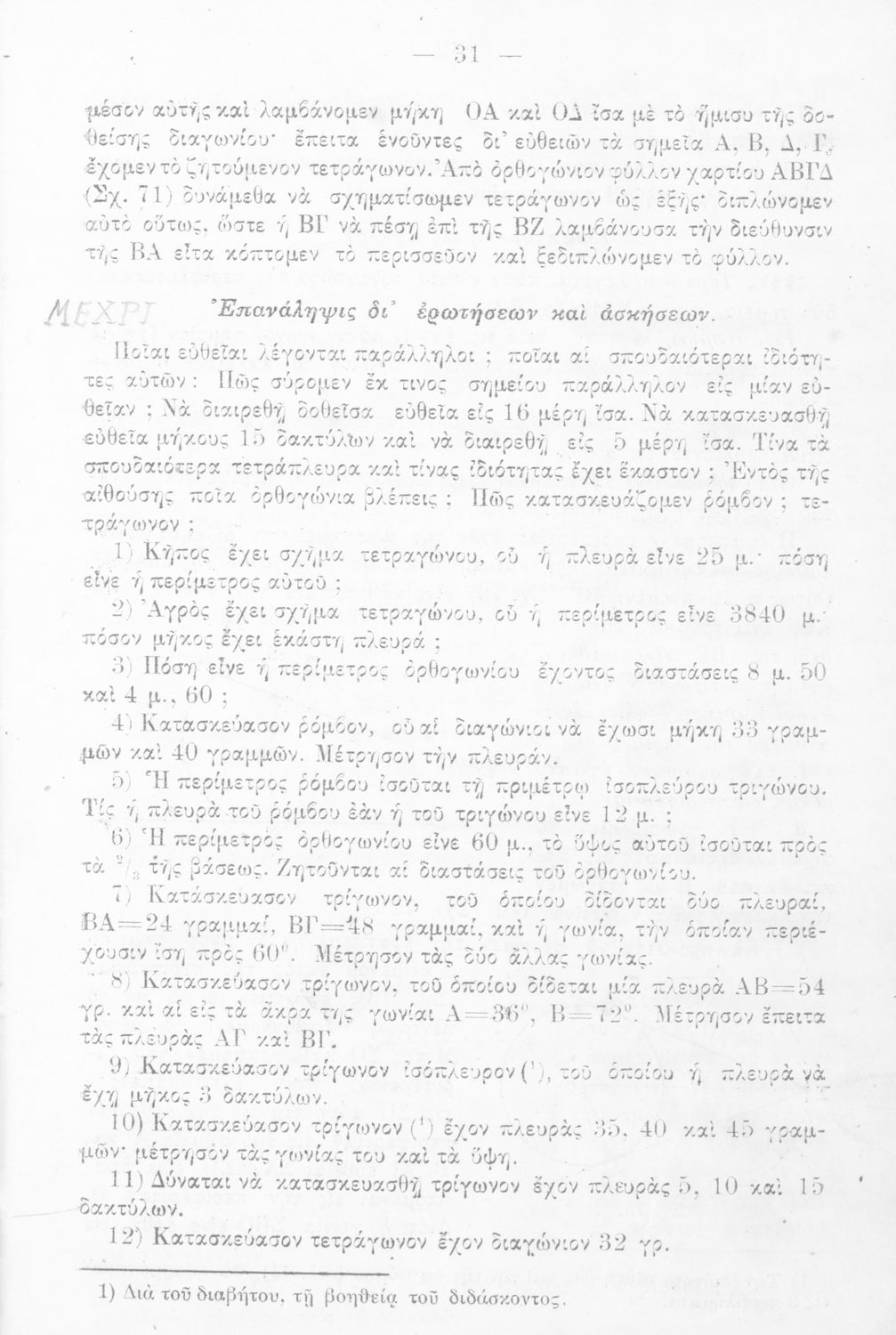 Σχολικό εγχειρίδιο Γεωμετρίας για τα Ελληνικά και Αστικά Σχολεία χωρισμένο σε Επιπεδομετρία και Στερεομετρία. Περιλαμβάνει προβλήματα και στοιχεία χωρομετρίας.
