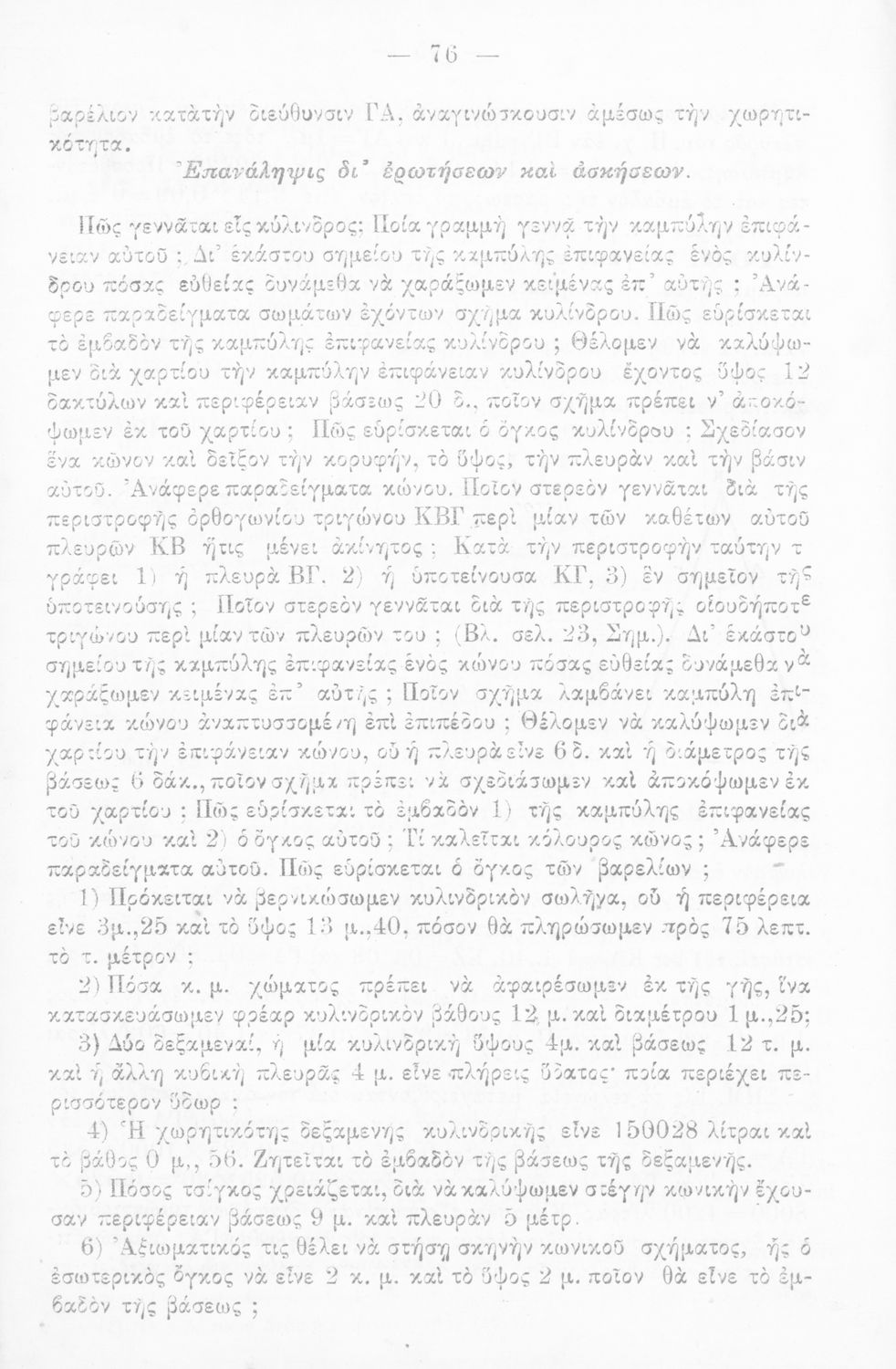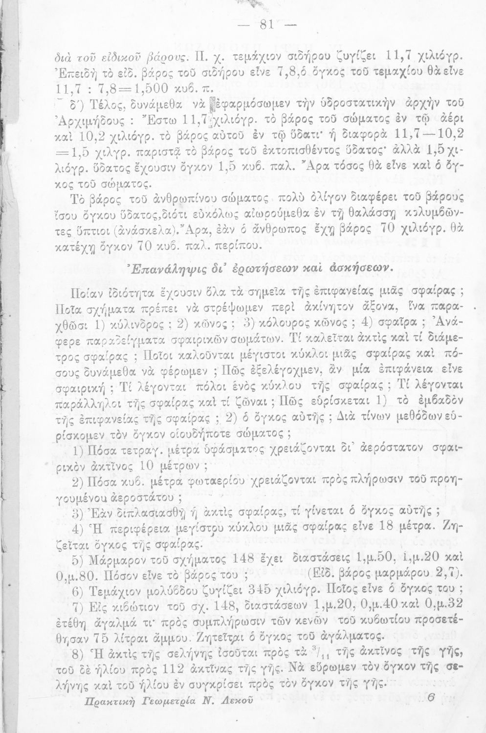 Σχολικό εγχειρίδιο Γεωμετρίας για τα Ελληνικά και Αστικά Σχολεία που περιέχει θεωρία και ασκήσεις και είναι χωρισμένο σε Επιπεδομετρία και Στερεομετρία.