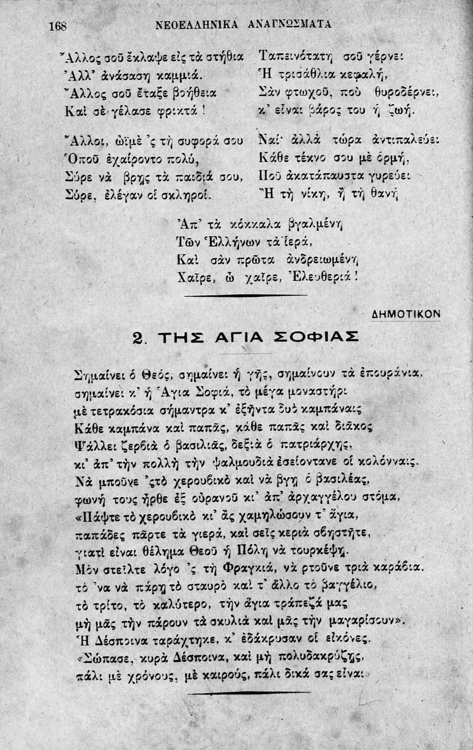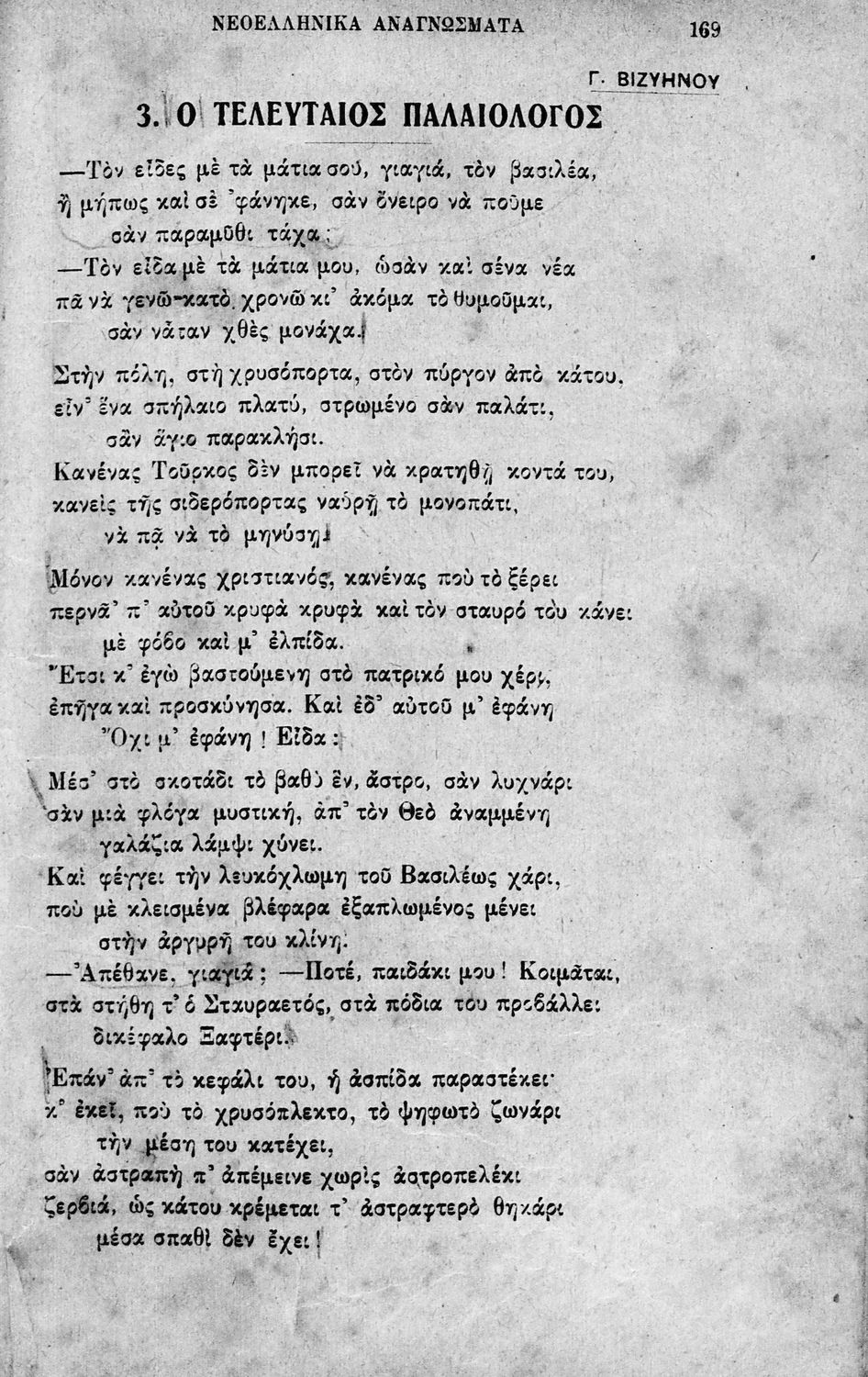 Σχολικό εγχειρίδιο Νέων Ελληνικών Γ' Ελληνικού Σχολείου που περιλαμβάνει ποιήματα και πεζά Ελλήνων συγγραφέων και δημοτικά τραγούδια εμπνευσμένα από την σύγχρονη ελληνική ιστορία, την ελληνική φύση και τη ζωή ...