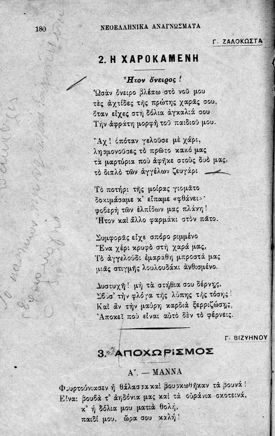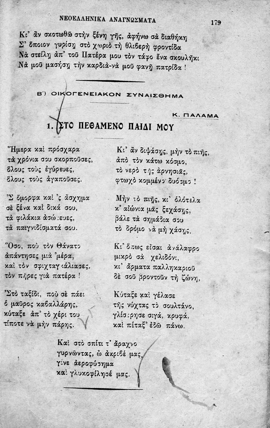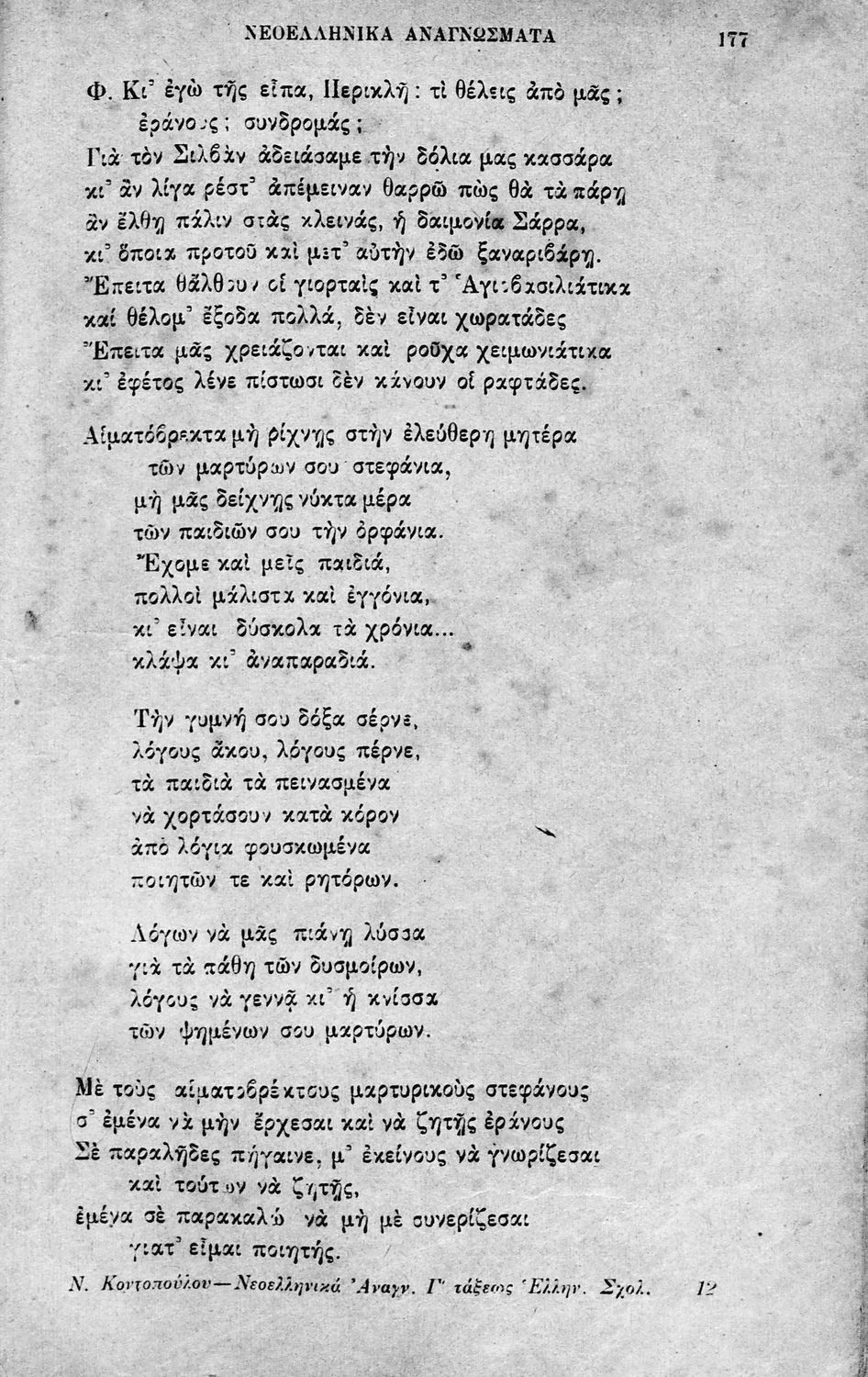 Σχολικό εγχειρίδιο Νέων Ελληνικών Γ' Ελληνικού Σχολείου που περιλαμβάνει ποιήματα και πεζά Ελλήνων συγγραφέων εμπνευσμένα από την σύγχρονη ελληνική ιστορία, την ελληνική φύση και τη ζωή στην ύπαιθρο, και τη ...