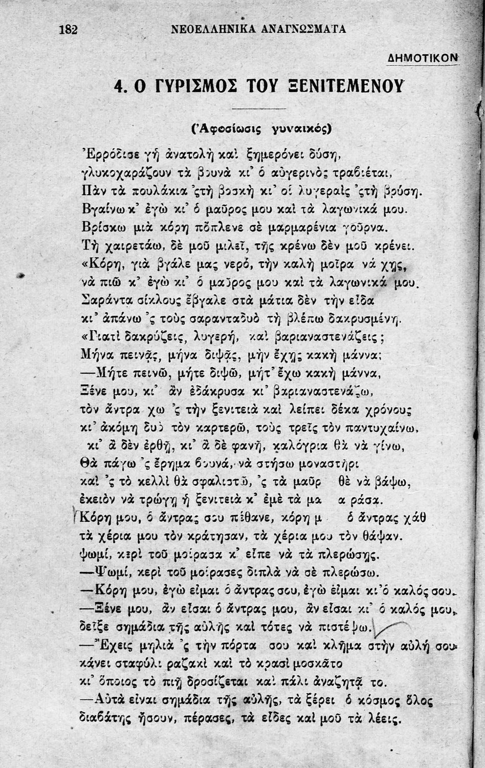 Σχολικό εγχειρίδιο για την Β΄ Γυμνασίου και την Γ΄ Αστικού Θηλέων για το μάθημα των Νέων Ελληνικών. Το εγχειρίδιο αποτελείται από κείμενα πεζού λόγου, επικολυρικά ποιήματα, ωδές, ηθογραφικά διηγήματα, ρητορικά