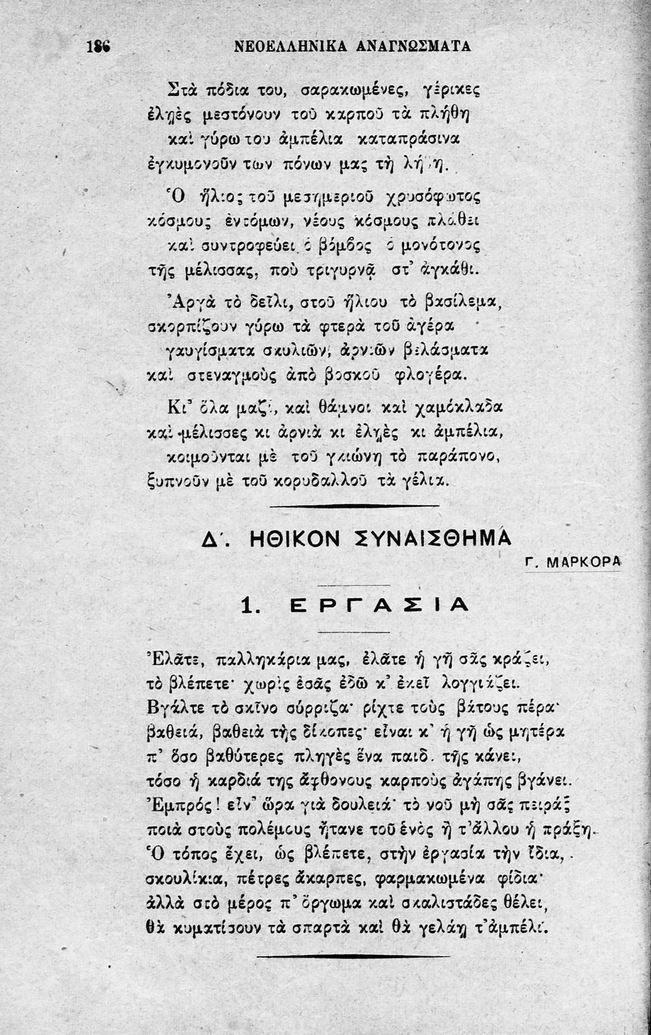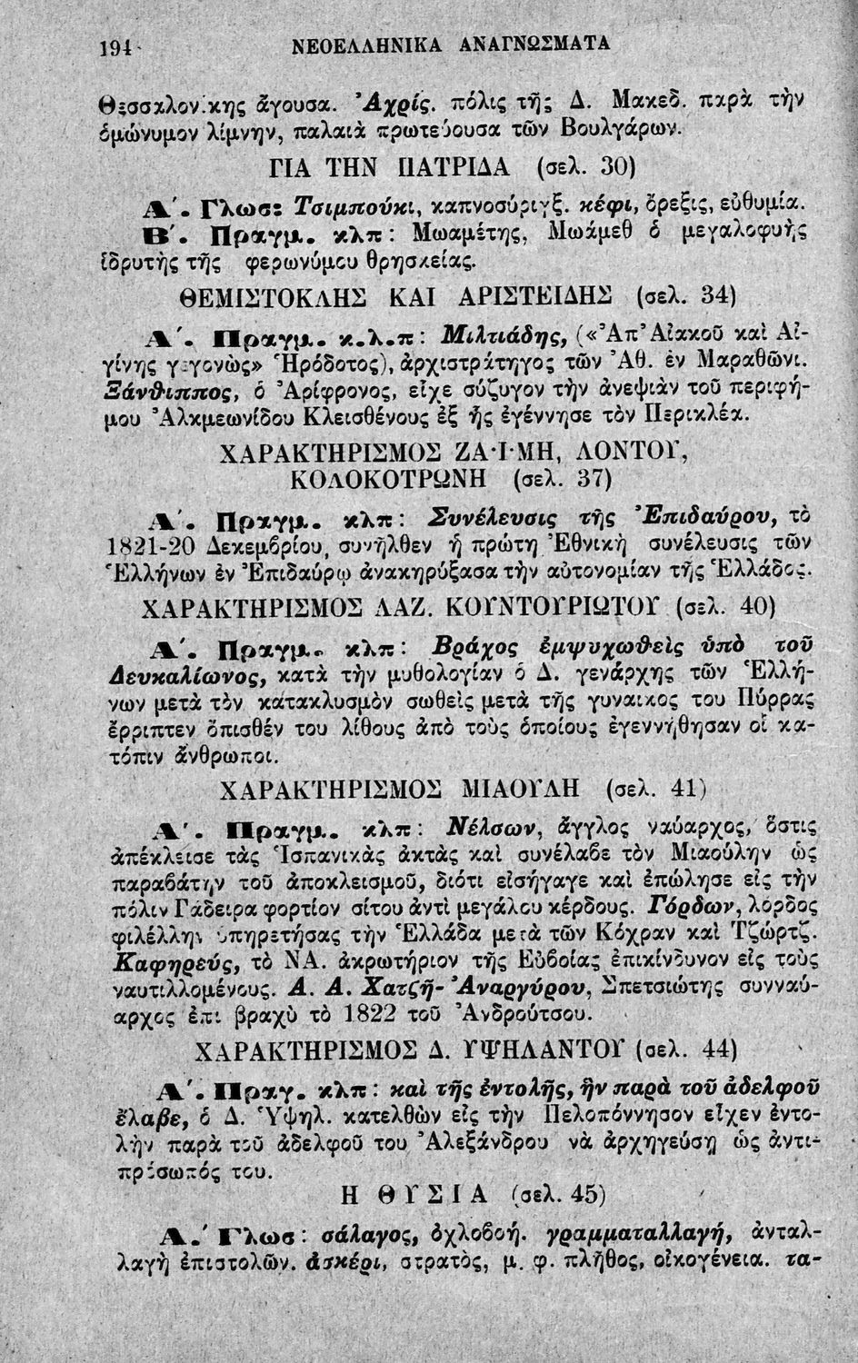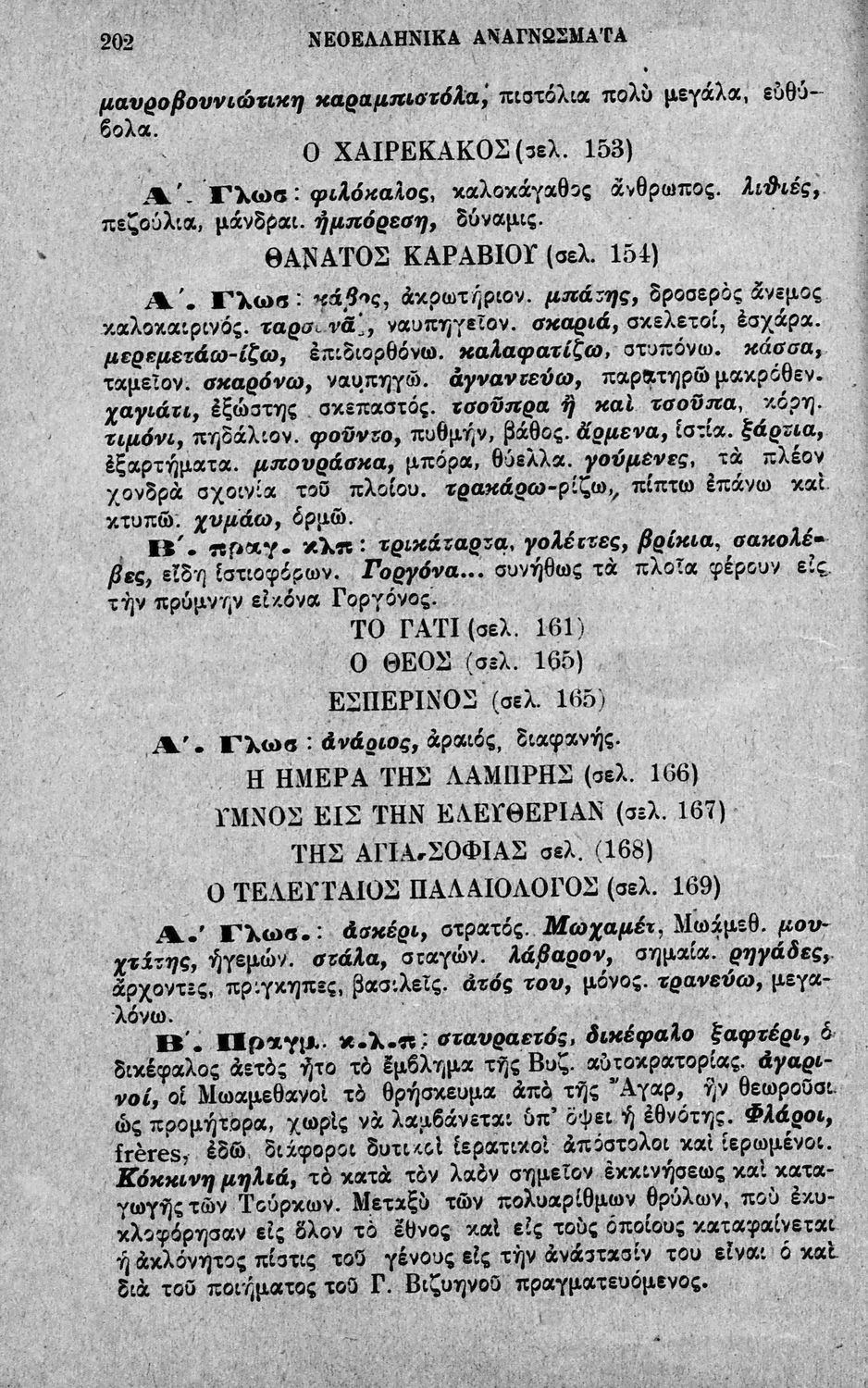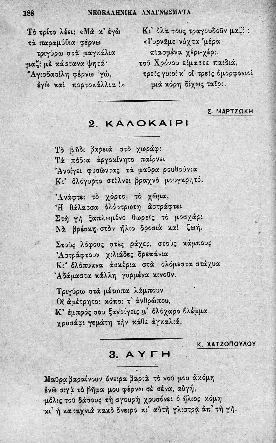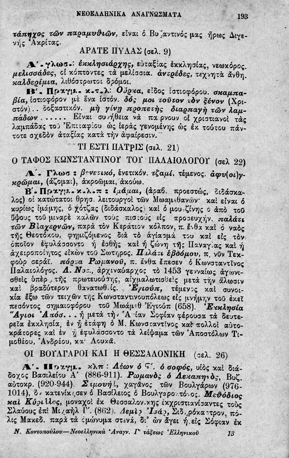 Σχολικό εγχειρίδιο Νέων Ελληνικών Γ' Ελληνικού Σχολείου που περιέχει πεζά και ποιήματα Ελλήνων συγγραφέων και δημοτικά τραγούδια εμπνευσμένα από τη βυζαντινή και σύγχρονη ελληνική ιστορία, και την οικογενειακή και θρησκευτική ζωή. Περιέχει παράρτημα με βιογραφίες των συγγραφέων και πραγματολογικές και γλωσσικές σημειώσεις.