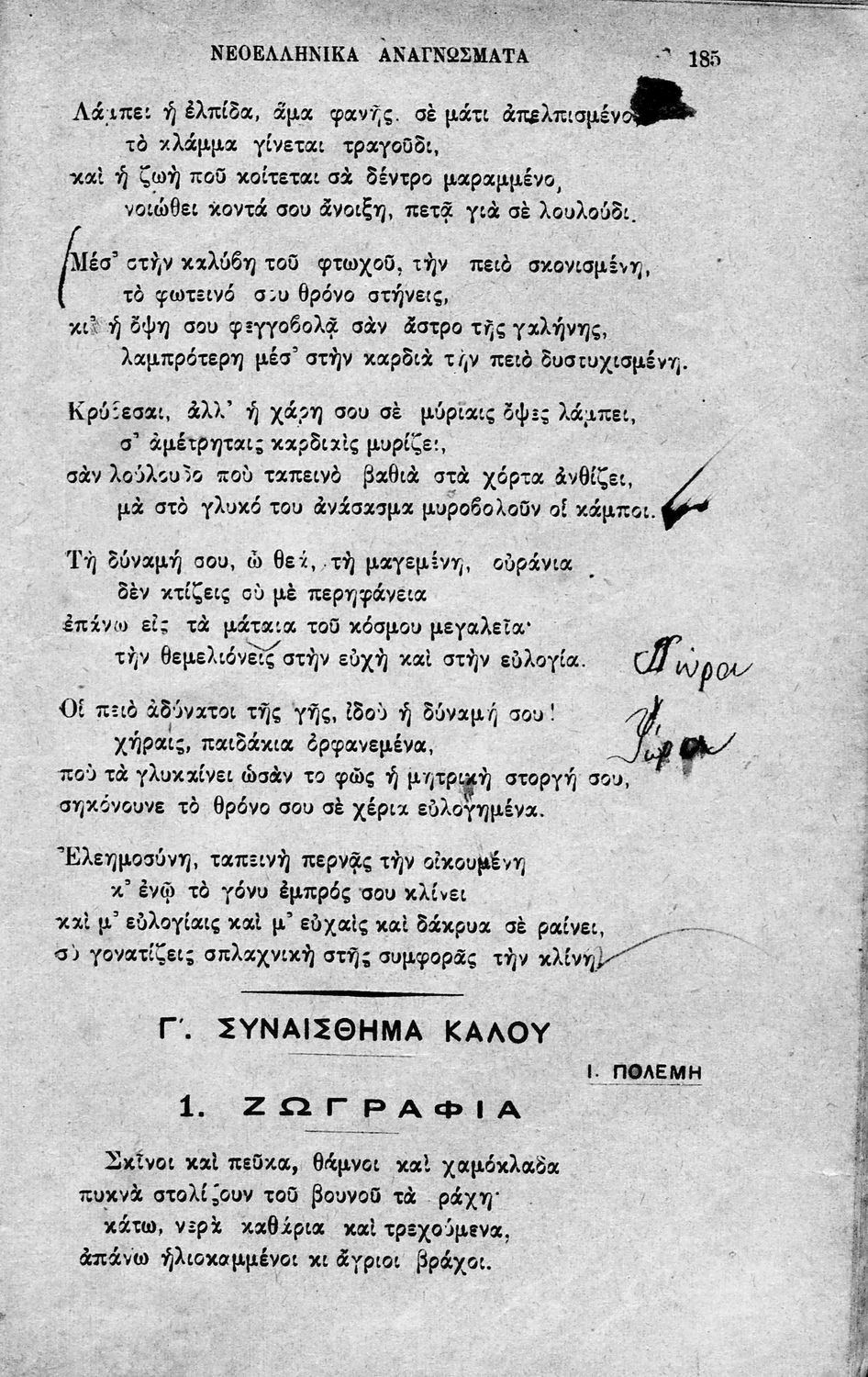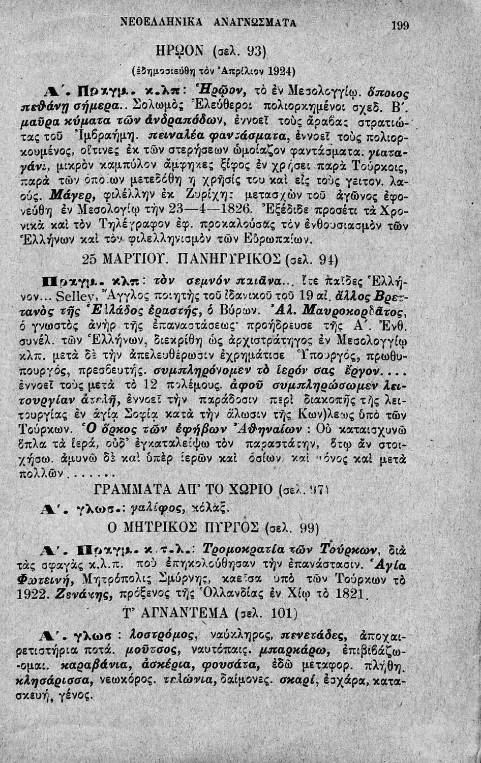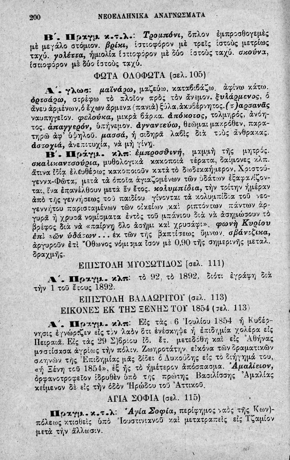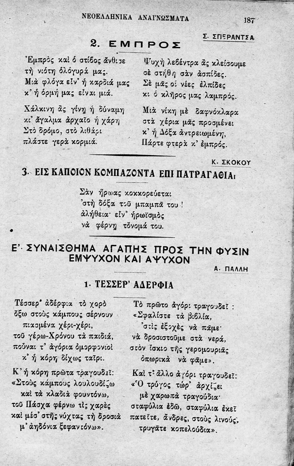 Σχολικό εγχειρίδιο Νέων Ελληνικών Γ' Ελληνικού Σχολείου που περιέχει πεζά και ποιήματα Ελλήνων συγγραφέων και δημοτικά τραγούδια εμπνευσμένα από τη βυζαντινή και σύγχρονη ελληνική ιστορία, και την οικογενειακή και θρησκευτική ζωή. Περιέχει παράρτημα με βιογραφίες των συγγραφέων και πραγματολογικές και γλωσσικές σημειώσεις.