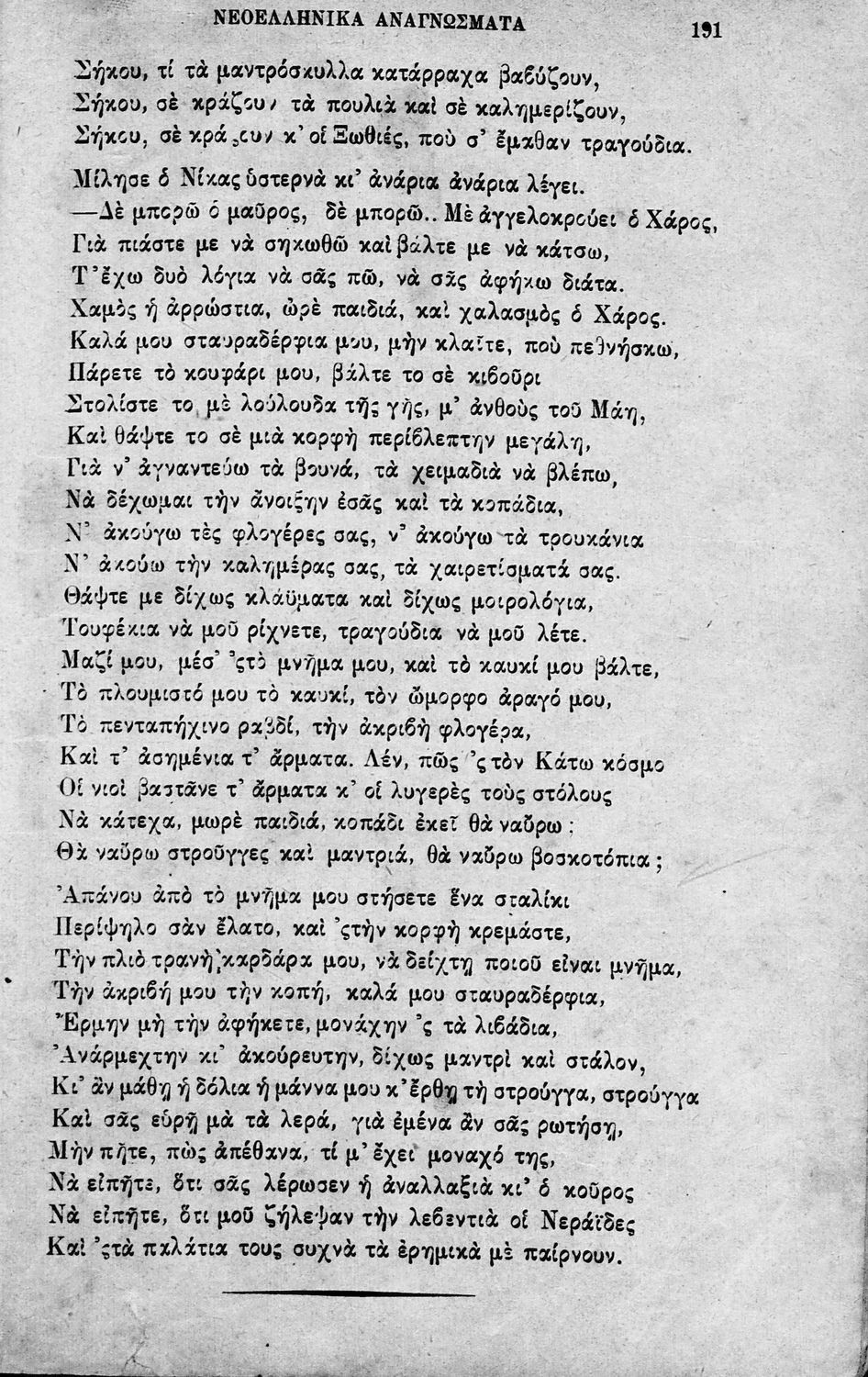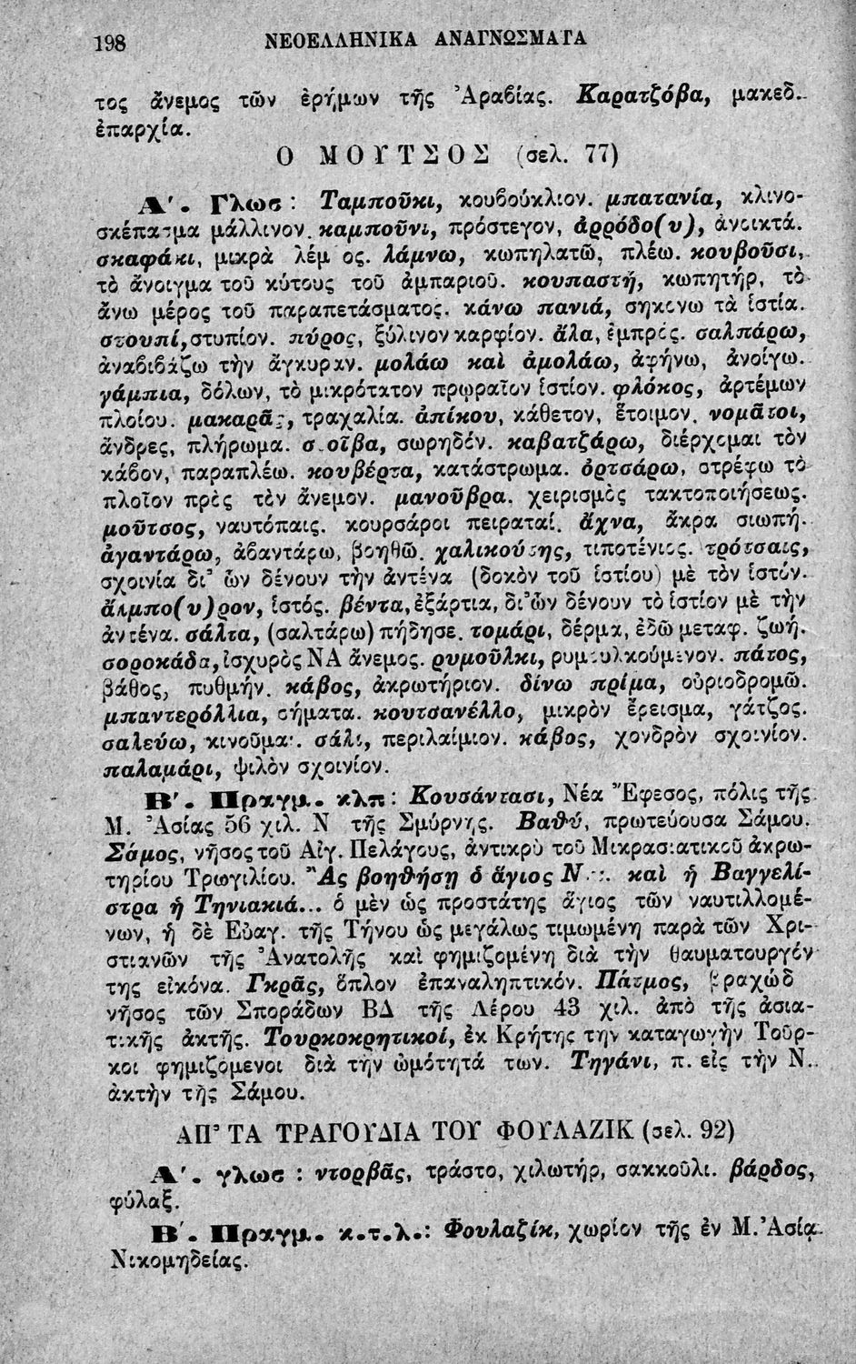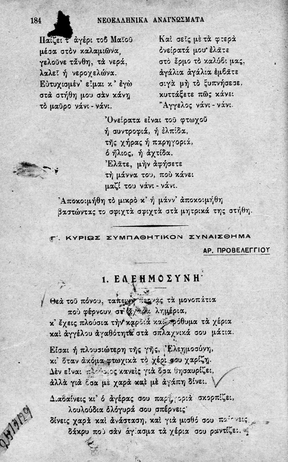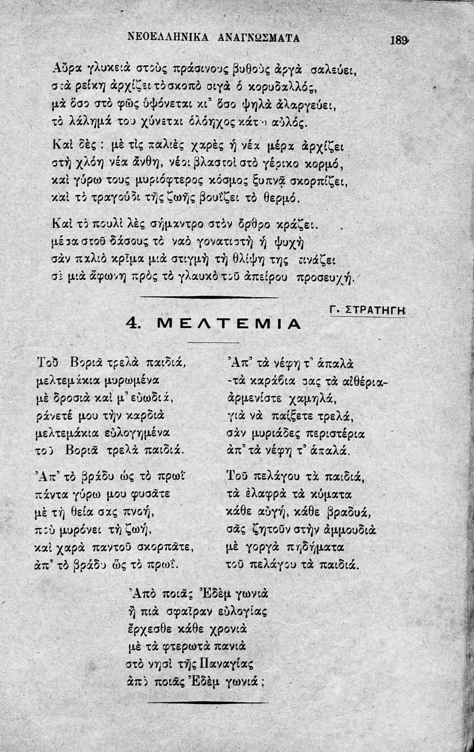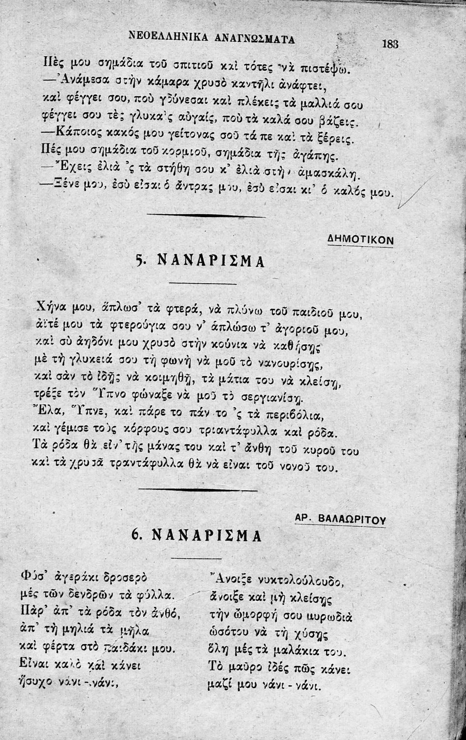 Σχολικό εγχειρίδιο Νέων Ελληνικών Γ' Ελληνικού Σχολείου που περιέχει πεζά και ποιήματα Ελλήνων συγγραφέων και δημοτικά τραγούδια εμπνευσμένα από τη βυζαντινή και σύγχρονη ελληνική ιστορία, και την οικογενειακή και θρησκευτική ζωή. Περιέχει παράρτημα με βιογραφίες των συγγραφέων και πραγματολογικές και γλωσσικές σημειώσεις.