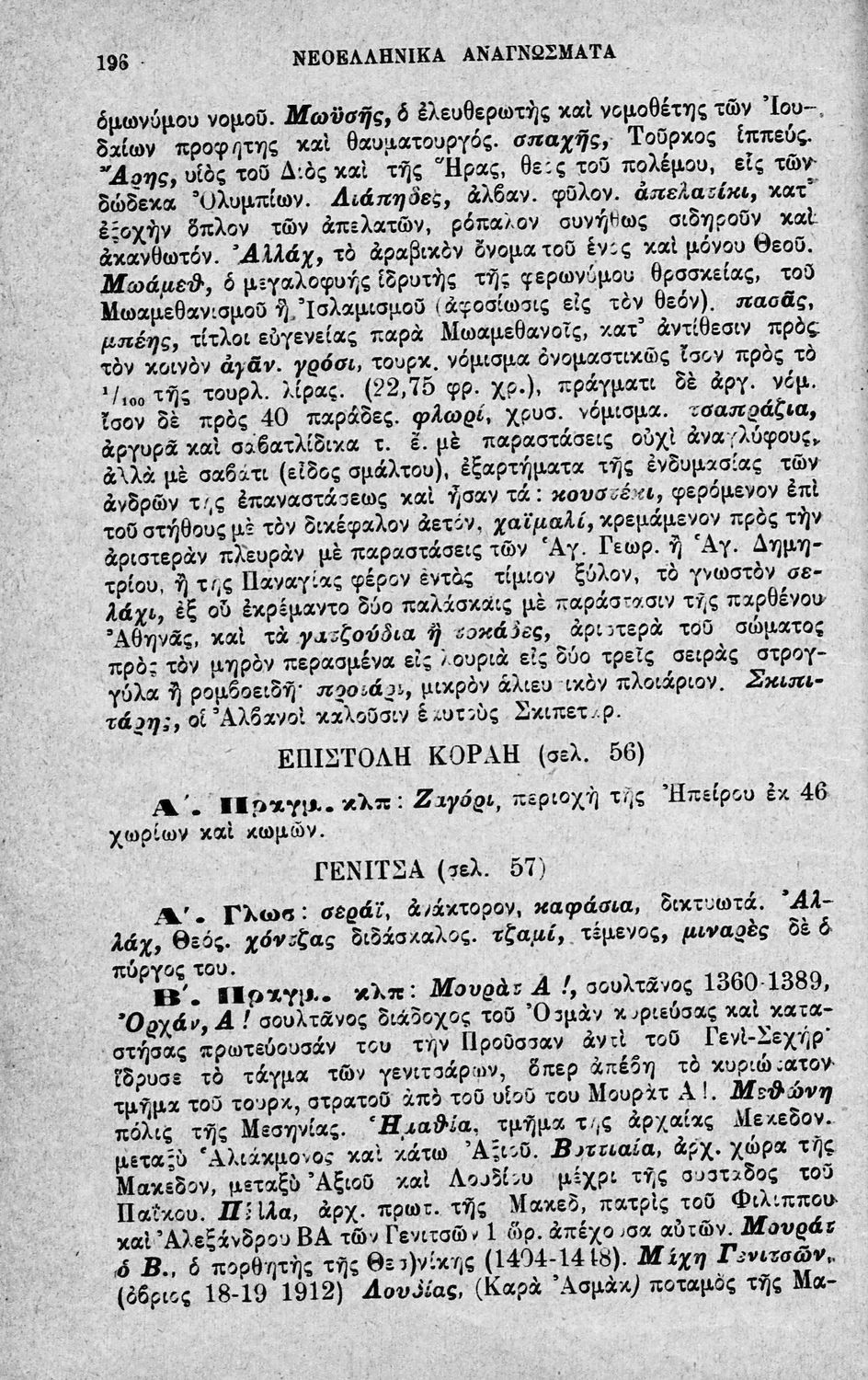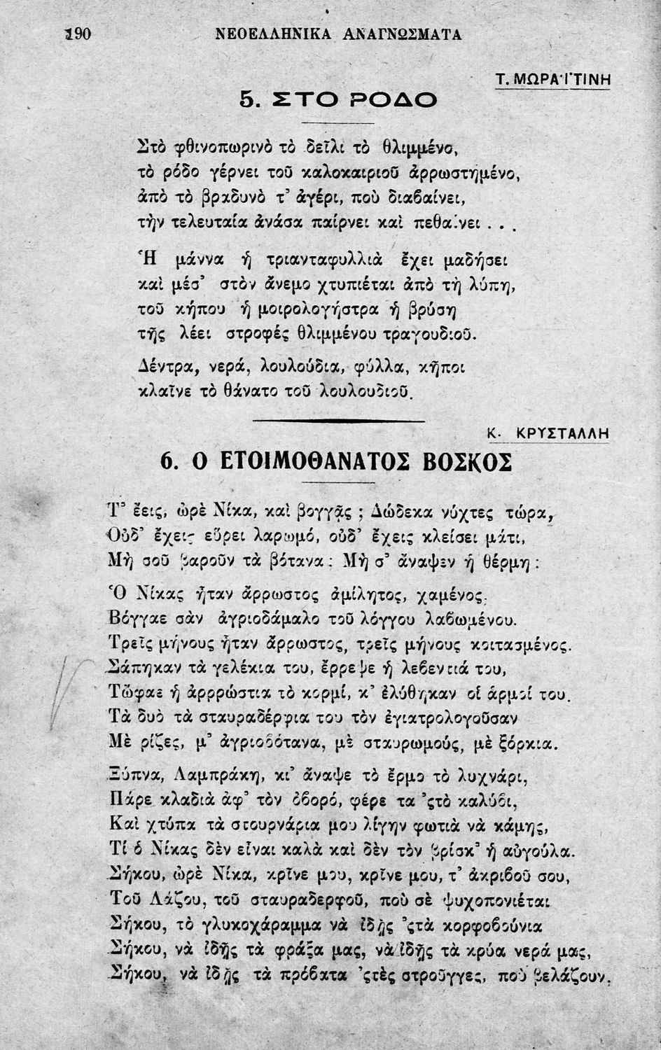 Βαθμίδα εκπαίδευσης: Δευτεροβάθμια Τάξη: Γ' Ελληνικού Σχολείου Μάθημα: Νέα Ελληνικά Γλώσσα: Καθαρεύουσα / Δημοτική Παρουσίαση περιεχομένου: Σχολικό εγχειρίδιο Νέων Ελληνικών Γ' Ελληνικού Σχολείου που περιέχει πεζά και ποιήματα Ελλήνων συγγραφέων και δημοτικά τραγούδια εμπνευσμένα από τη βυζαντινή και σύγχρονη ελληνική ιστορία, και την οικογενειακή και θρησκευτική ζωή. Περιέχει παράρτημα με βιογραφίες των συγγραφέων και πραγματολογικές και γλωσσικές σημειώσεις. |