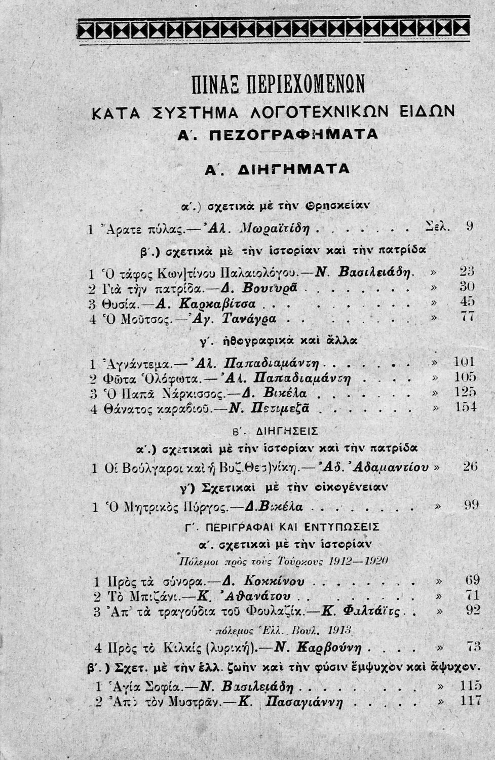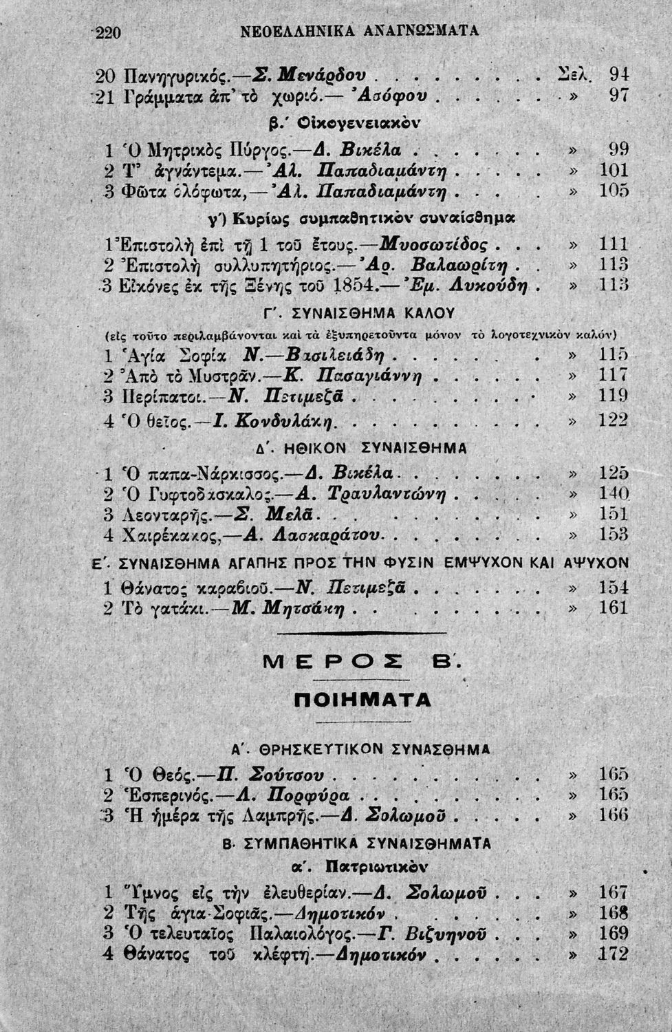 Σχολικό εγχειρίδιο για την Β΄ Γυμνασίου και την Γ΄ Αστικού Θηλέων για το μάθημα των Νέων Ελληνικών. Το εγχειρίδιο αποτελείται από κείμενα πεζού λόγου, επικολυρικά ποιήματα, ωδές, ηθογραφικά διηγήματα, ρητορικά