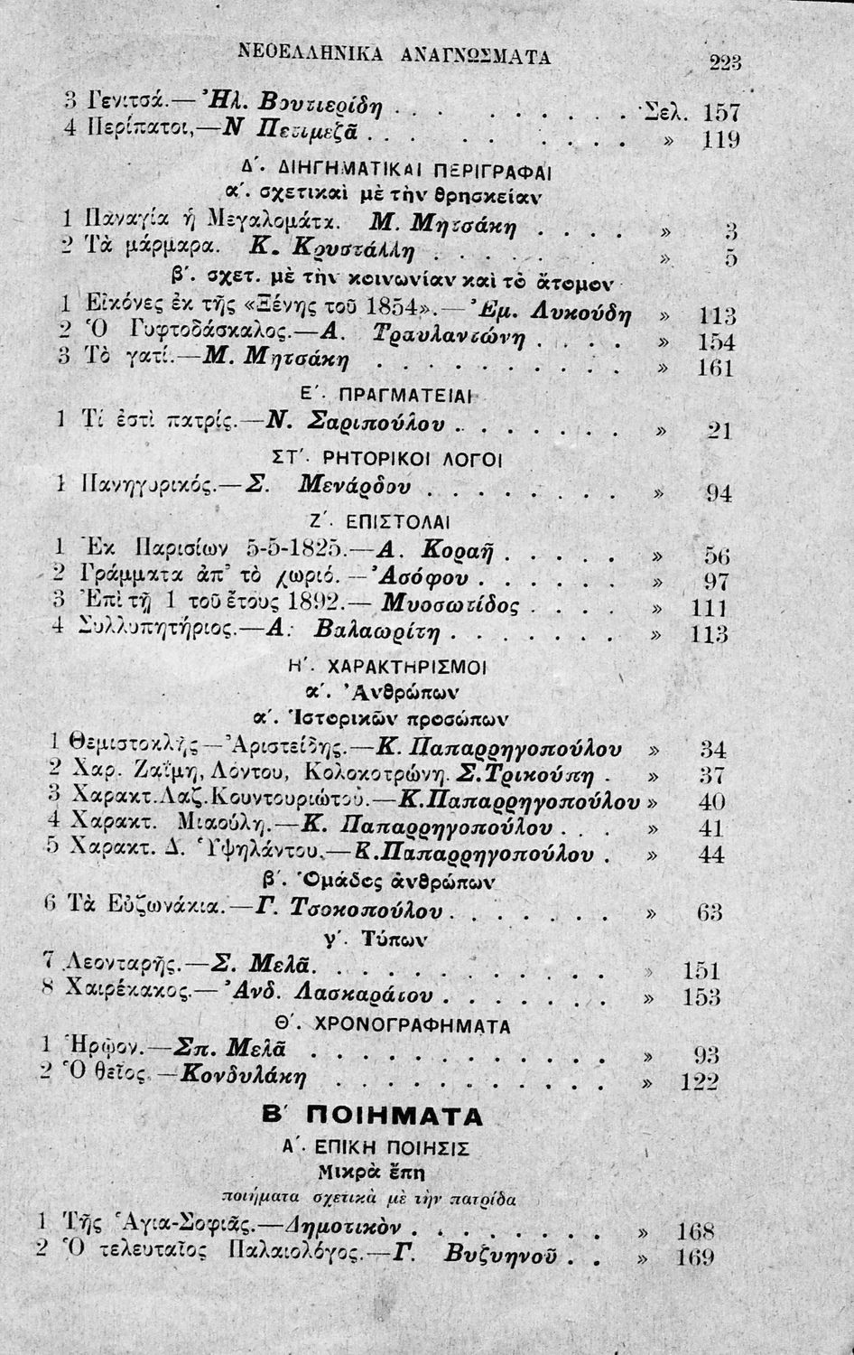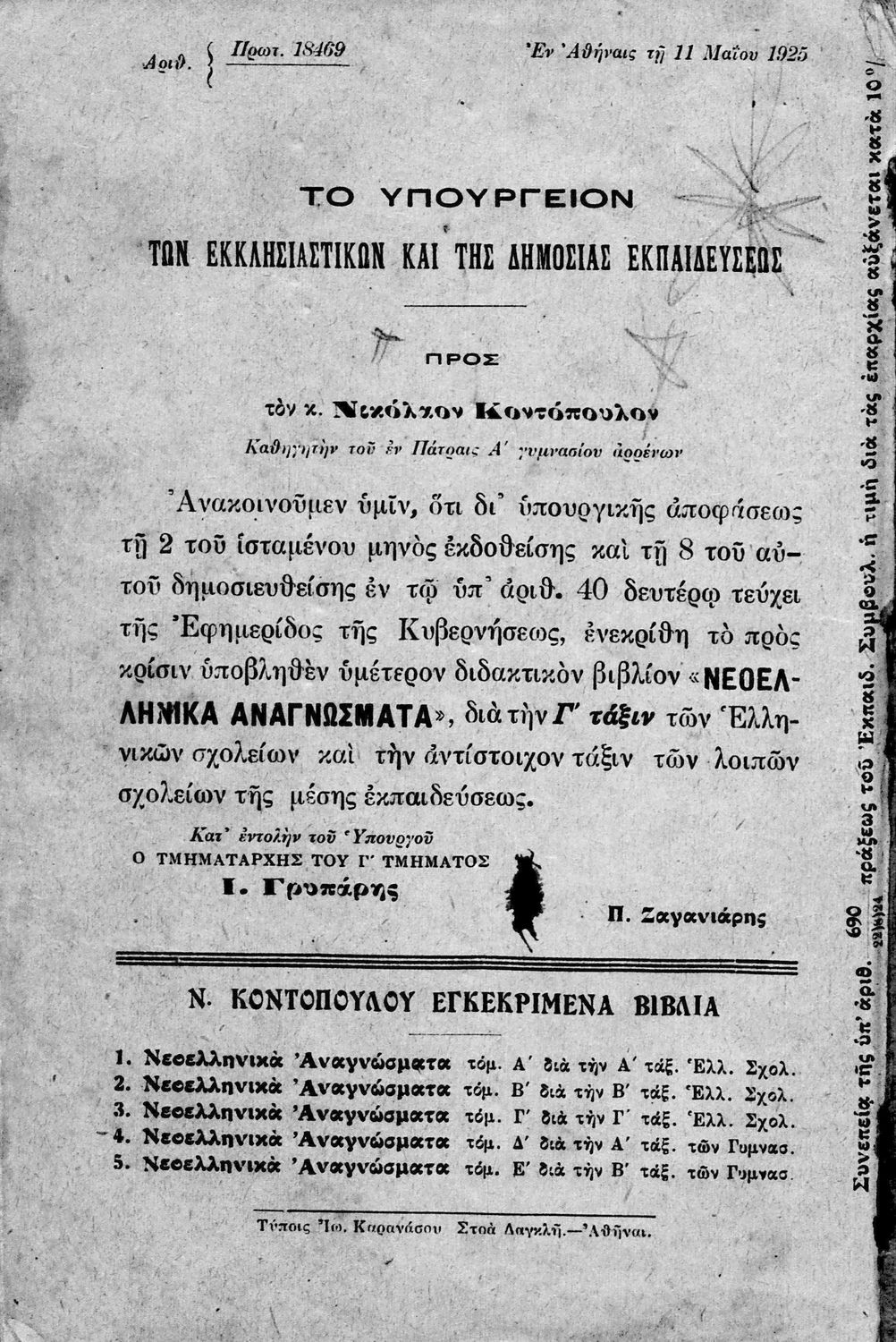Τίτλος: Νεοελληνικά αναγνώσματα εγκριθέντα δια τους μαθητάς της Γ΄ τάξεως των Ελληνικών Σχολείων και της αντίστοιχης των Ελληνικών Σχολείων της Μ. Εκπαιδεύσεως