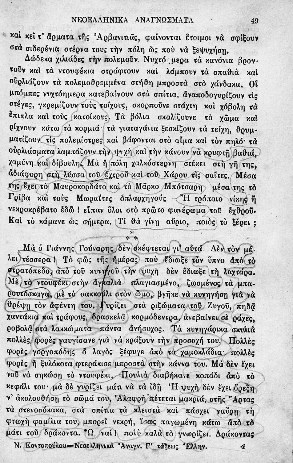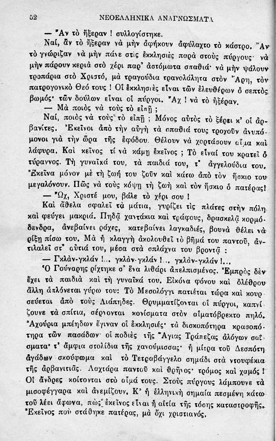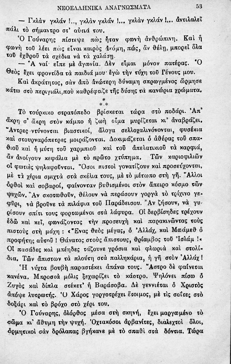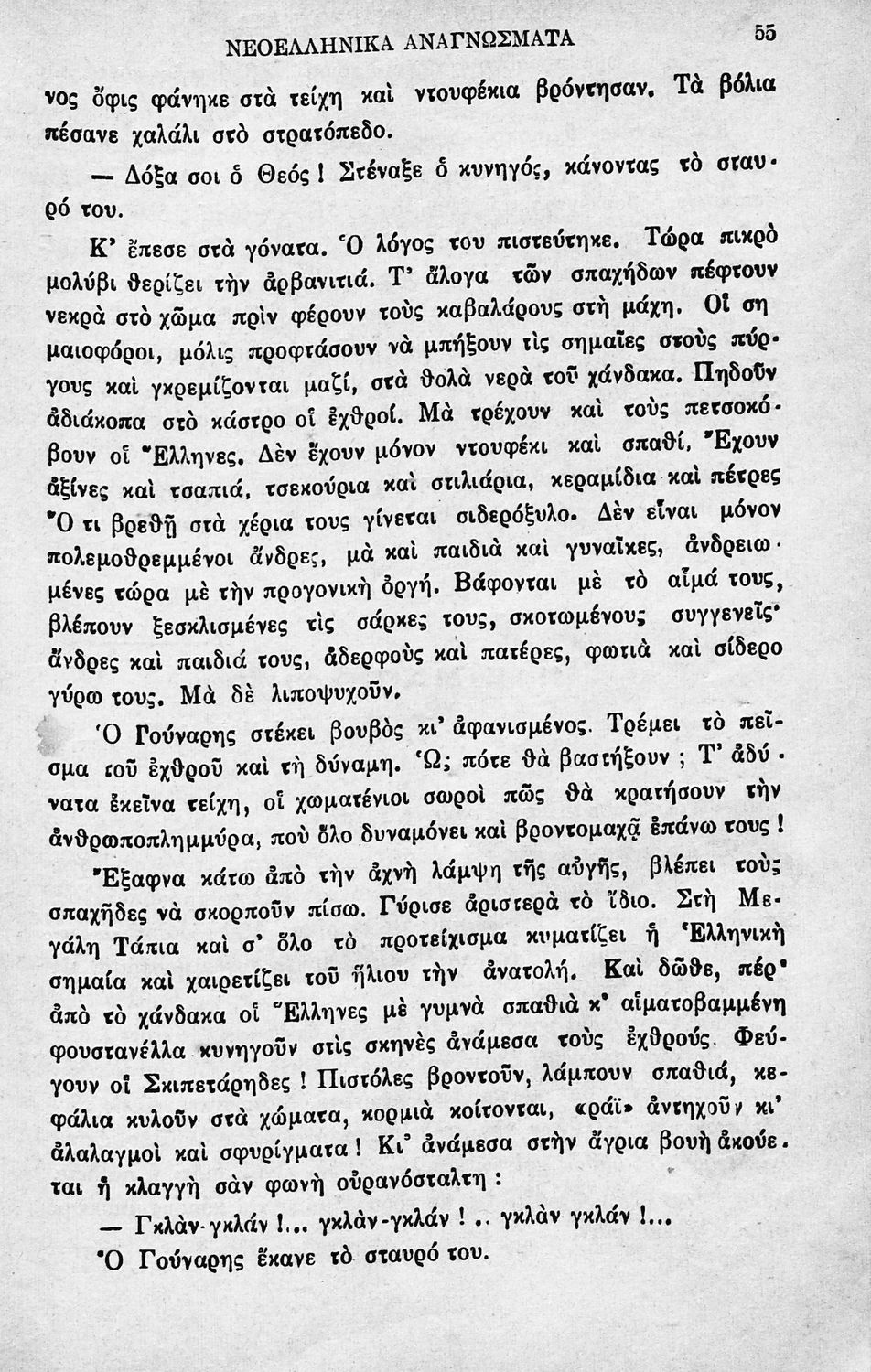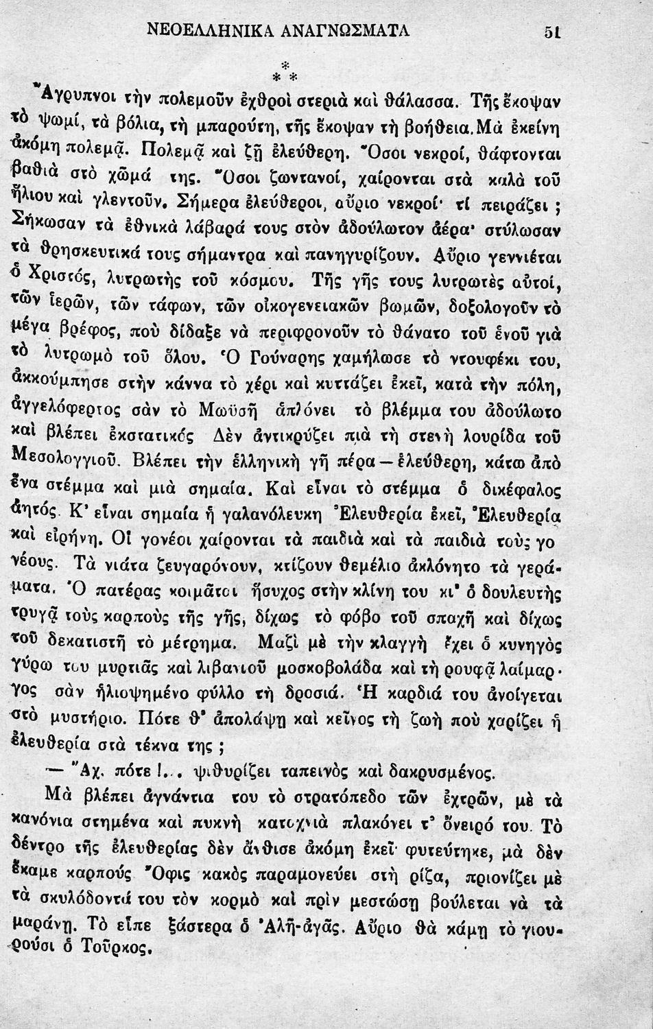 520 ## _aΣχολικό εγχειρίδιο Νέων Ελληνικών Γ' Ελληνικού Σχολείου που περιέχει πεζά και ποιήματα Ελλήνων συγγραφέων και δημοτικά τραγούδια εμπνευσμένα από τη βυζαντινή και σύγχρονη ελληνική ιστορία, και την οικογενειακή και θρησκευτική ζωή. Περιέχει παράρτημα με βιογραφίες των συγγραφέων και πραγματολογικές και γλωσσικές σημειώσεις.