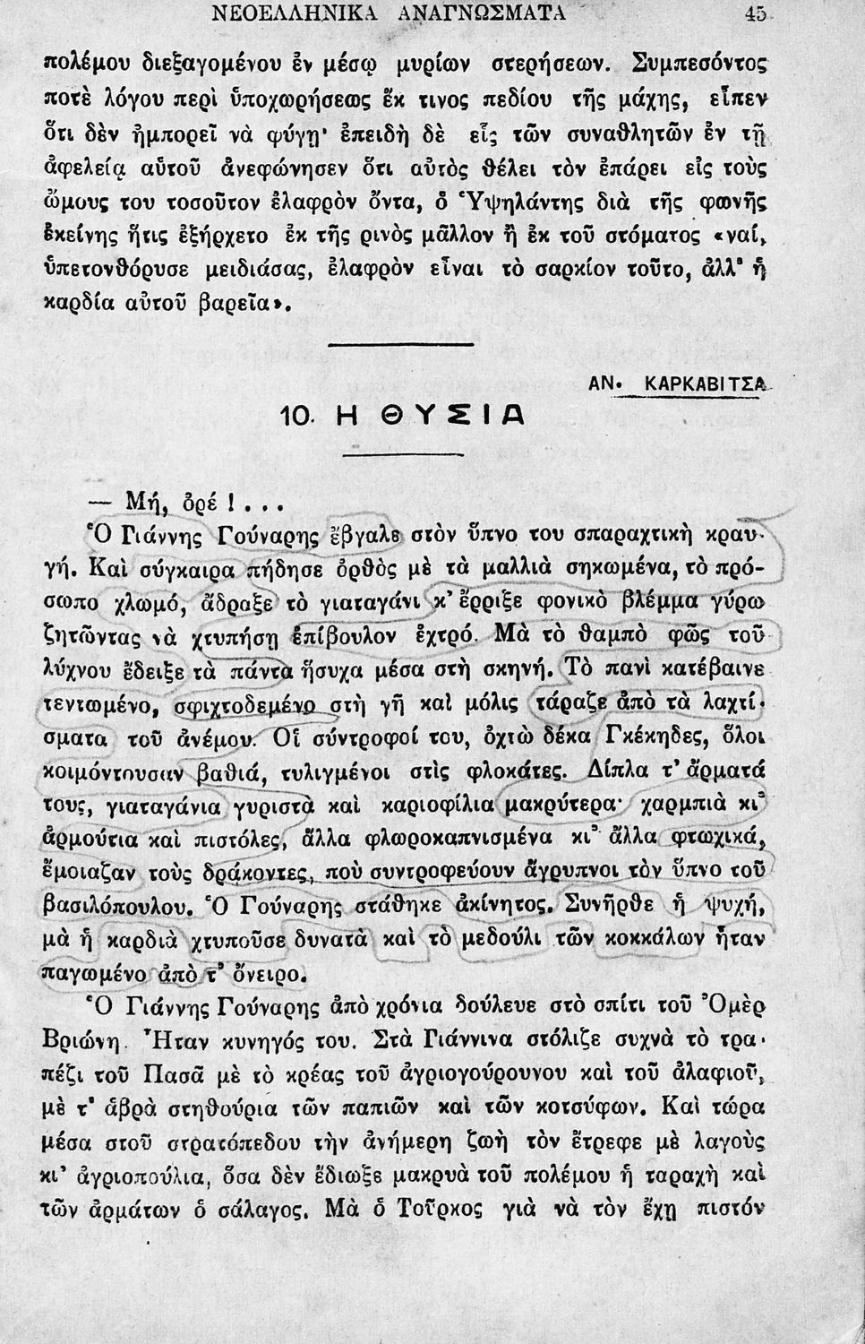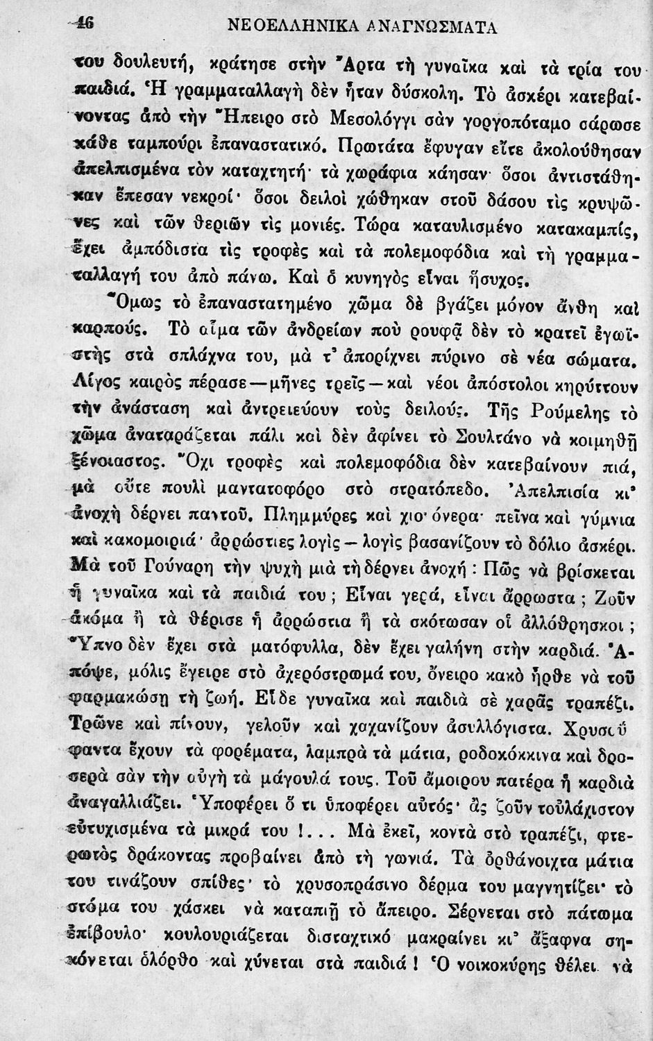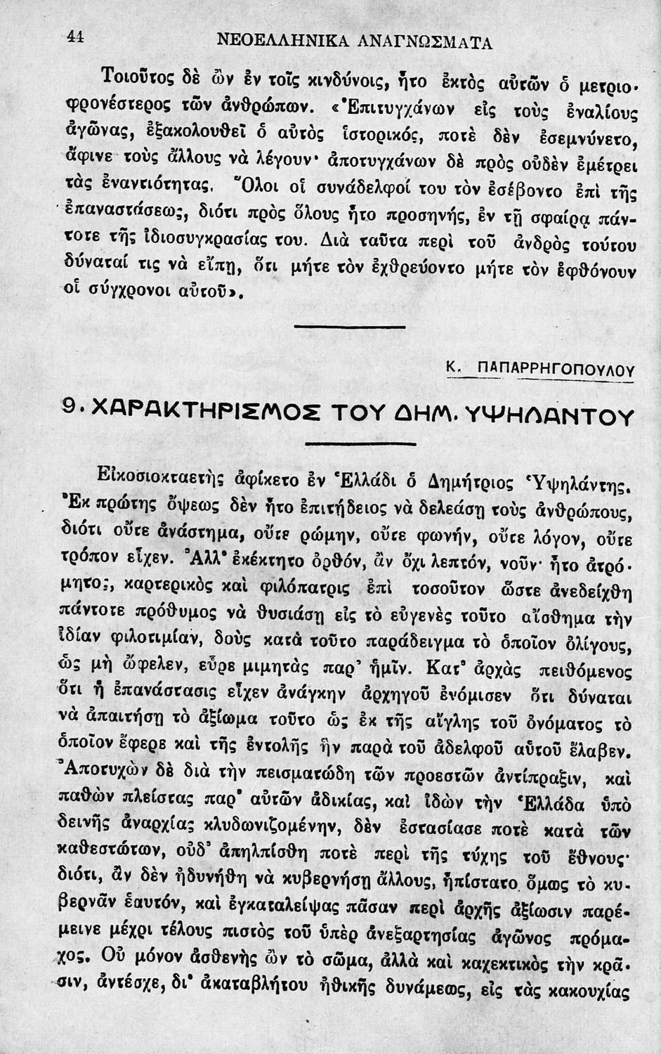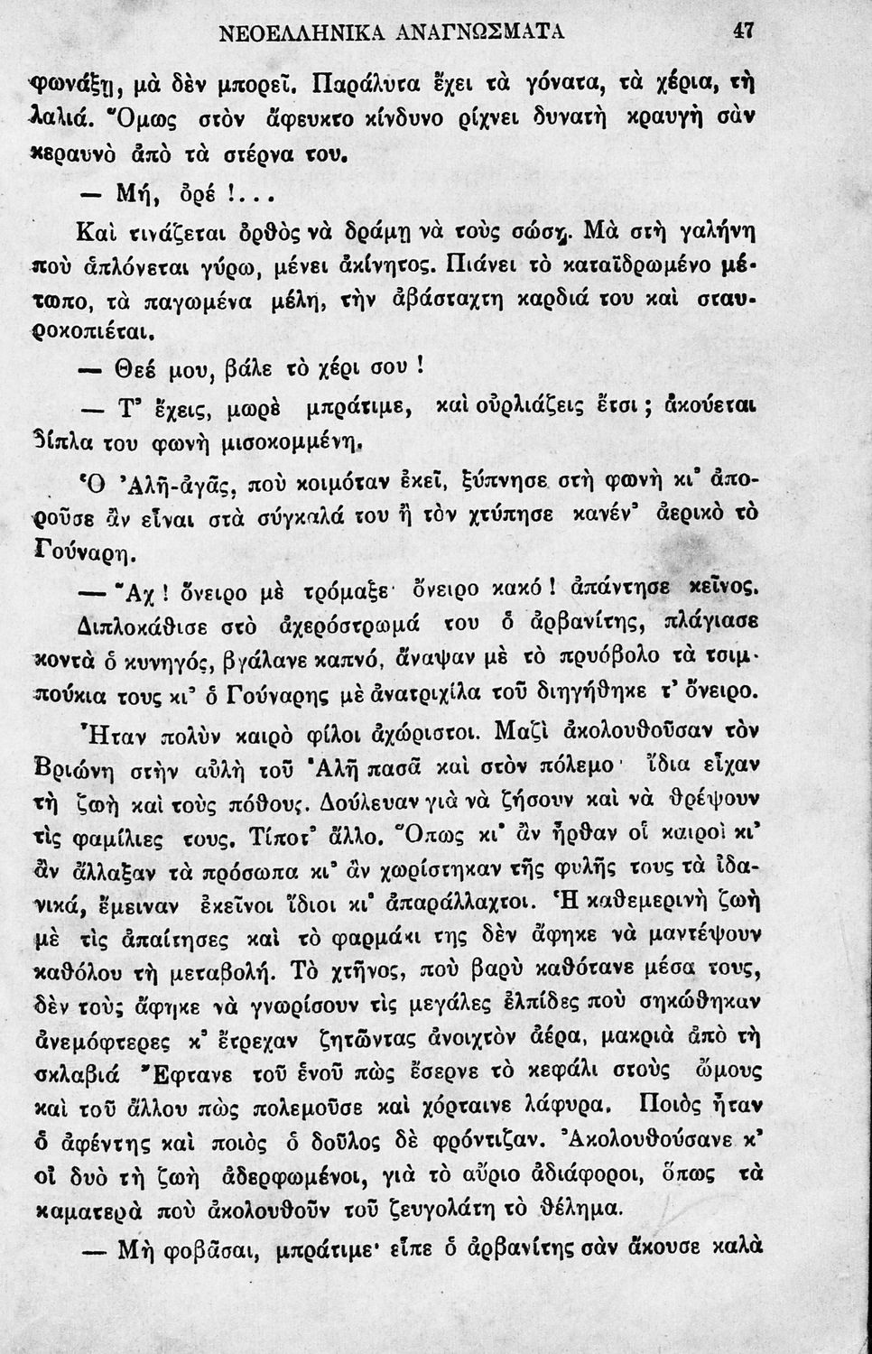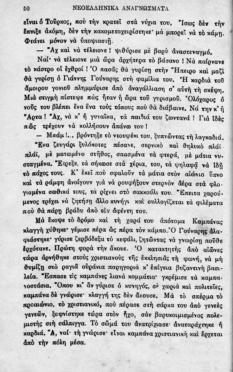 520 ## _aΣχολικό εγχειρίδιο Νέων Ελληνικών Γ' Ελληνικού Σχολείου που περιέχει πεζά και ποιήματα Ελλήνων συγγραφέων και δημοτικά τραγούδια εμπνευσμένα από τη βυζαντινή και σύγχρονη ελληνική ιστορία, και την οικογενειακή και θρησκευτική ζωή. Περιέχει παράρτημα με βιογραφίες των συγγραφέων και πραγματολογικές και γλωσσικές σημειώσεις.