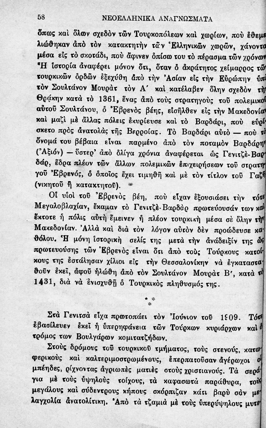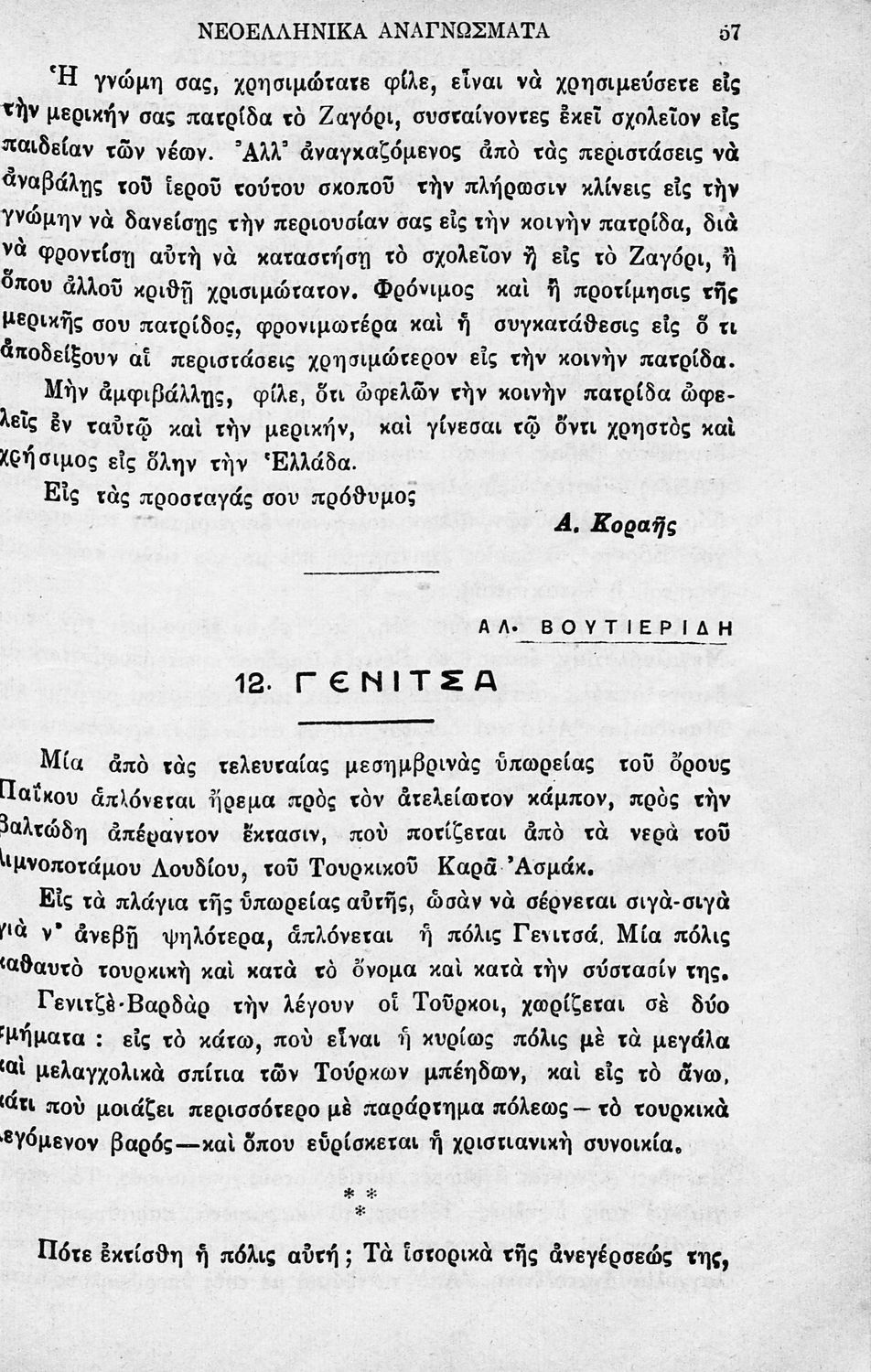 Σχολικό εγχειρίδιο Νέων Ελληνικών Γ' Ελληνικού Σχολείου που περιέχει πεζά και ποιήματα Ελλήνων συγγραφέων και δημοτικά τραγούδια εμπνευσμένα από τη βυζαντινή και σύγχρονη ελληνική ιστορία, και την οικογενειακή και θρησκευτική ζωή. Περιέχει παράρτημα με βιογραφίες των συγγραφέων και πραγματολογικές και γλωσσικές σημειώσεις.