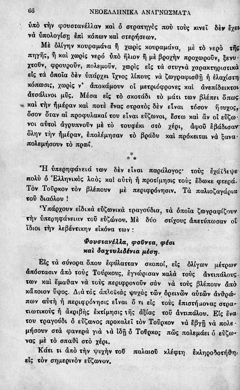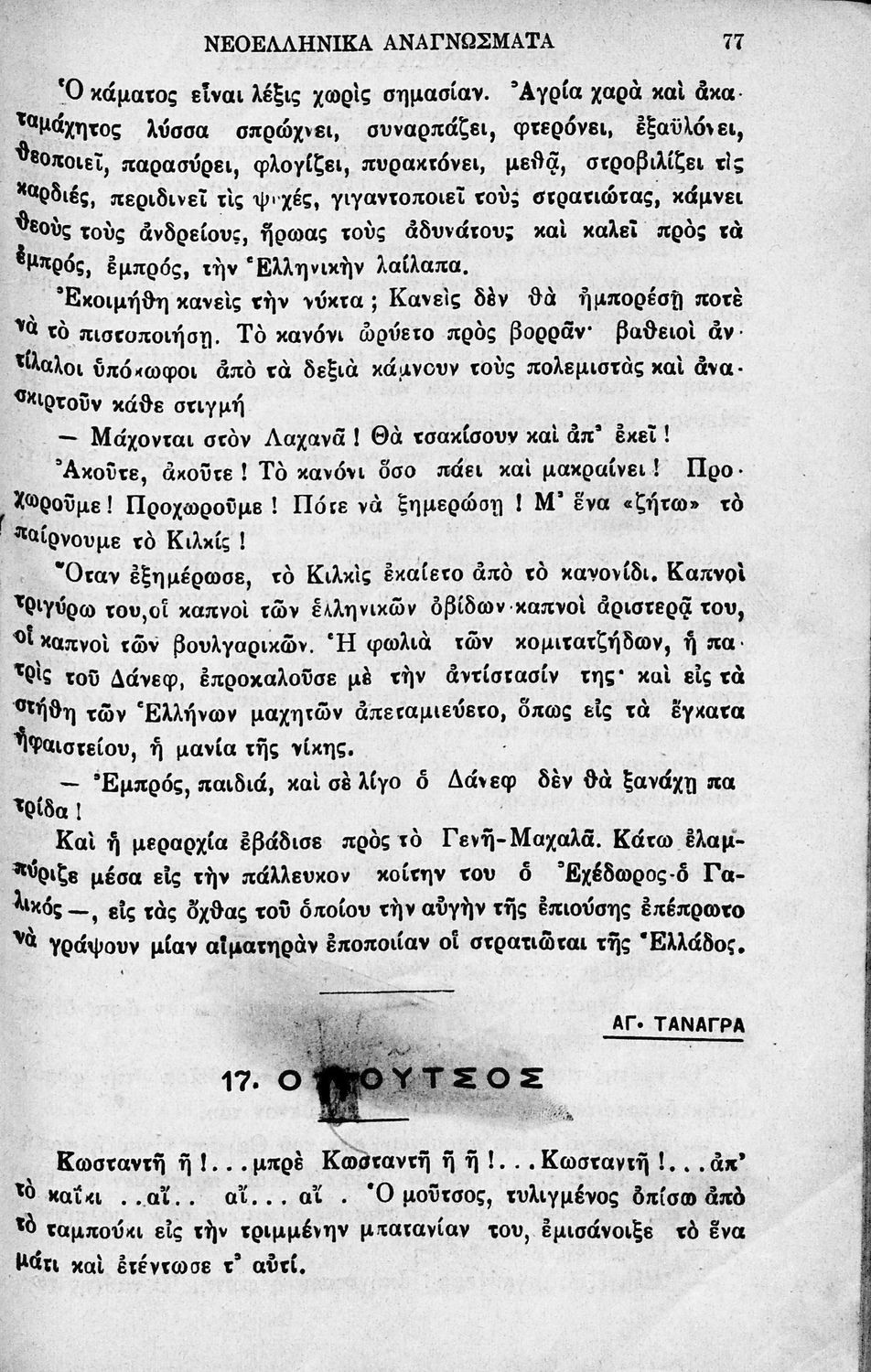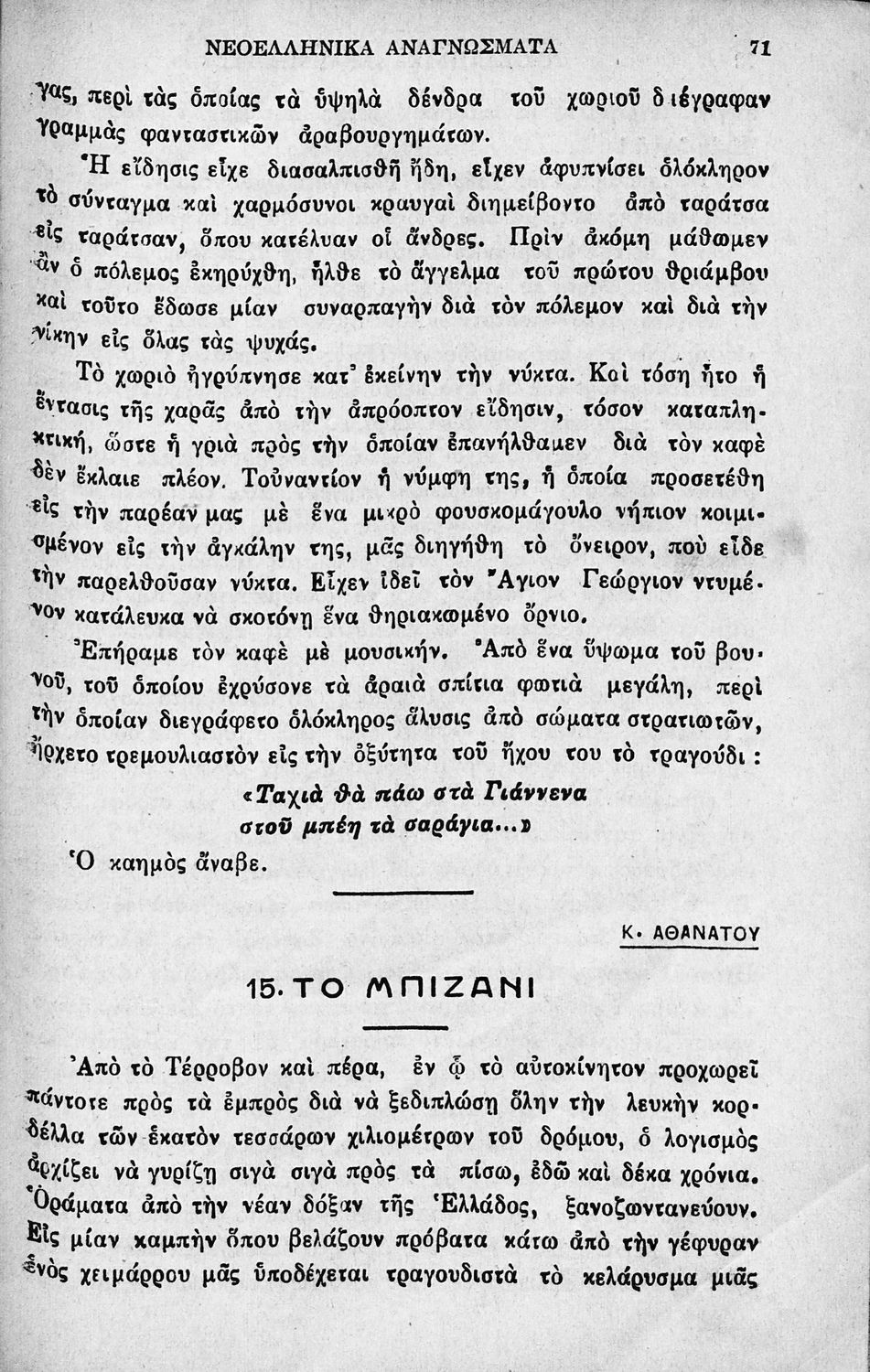 Σχολικό εγχειρίδιο Νέων Ελληνικών Γ' Ελληνικού Σχολείου που περιλαμβάνει ποιήματα και πεζά Ελλήνων συγγραφέων εμπνευσμένα από την σύγχρονη ελληνική ιστορία, την ελληνική φύση και τη ζωή στην ύπαιθρο, και τη ...