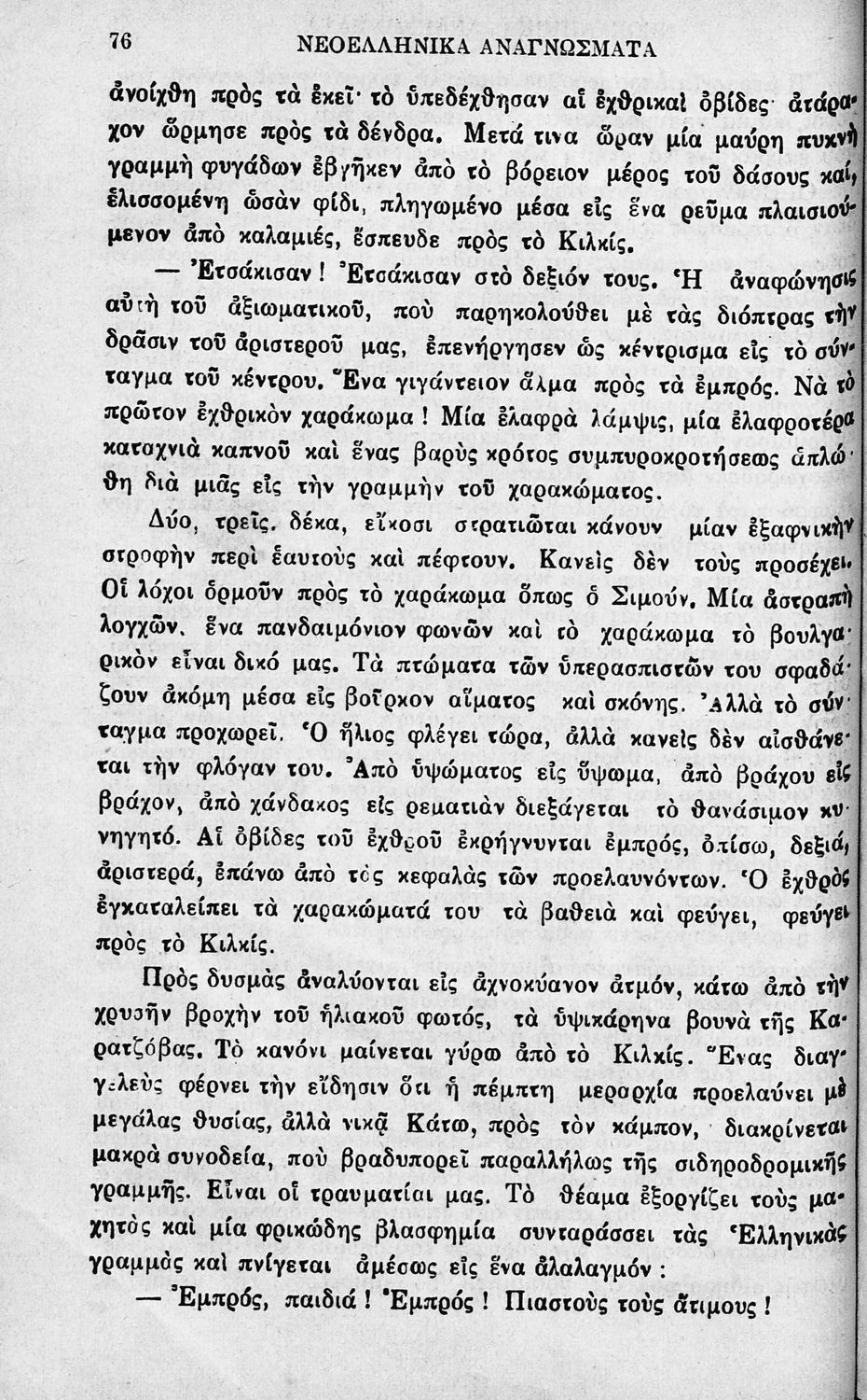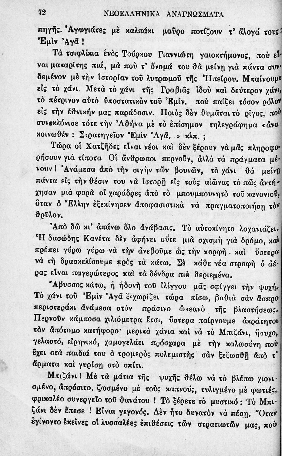 Σχολικό εγχειρίδιο Νέων Ελληνικών Γ' Ελληνικού Σχολείου που περιέχει πεζά και ποιήματα Ελλήνων συγγραφέων και δημοτικά τραγούδια εμπνευσμένα από τη βυζαντινή και σύγχρονη ελληνική ιστορία, και την οικογενειακή και θρησκευτική ζωή. Περιέχει παράρτημα με βιογραφίες των συγγραφέων και πραγματολογικές και γλωσσικές σημειώσεις.