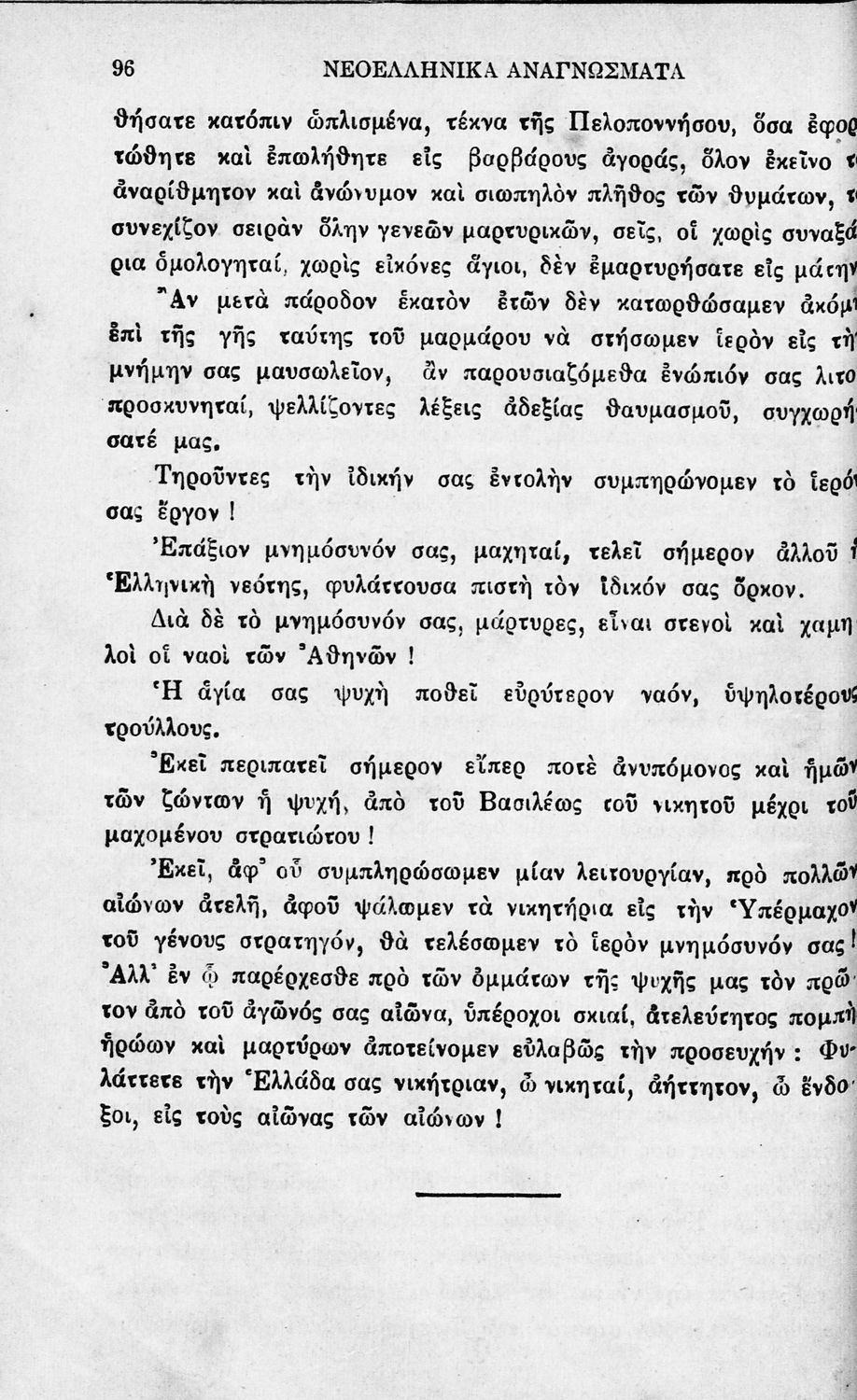 Σχολικό εγχειρίδιο Νέων Ελληνικών Γ' Ελληνικού Σχολείου που περιέχει πεζά και ποιήματα Ελλήνων συγγραφέων και δημοτικά τραγούδια εμπνευσμένα από τη βυζαντινή και σύγχρονη ελληνική ιστορία, και την οικογενειακή και θρησκευτική ζωή. Περιέχει παράρτημα με βιογραφίες των συγγραφέων και πραγματολογικές και γλωσσικές σημειώσεις.