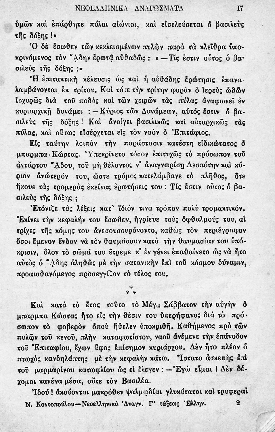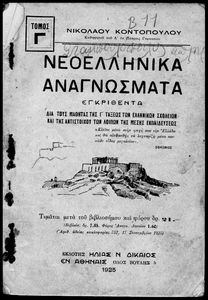 Βαθμίδα εκπαίδευσης: Δευτεροβάθμια Τάξη: Γ' Ελληνικού Σχολείου Μάθημα: Νέα Ελληνικά Γλώσσα: Καθαρεύουσα / Δημοτική Παρουσίαση περιεχομένου: Σχολικό εγχειρίδιο Νέων Ελληνικών Γ' Ελληνικού Σχολείου που περιέχει πεζά και ποιήματα Ελλήνων συγγραφέων και δημοτικά τραγούδια εμπνευσμένα από τη βυζαντινή και σύγχρονη ελληνική ιστορία, και την οικογενειακή και θρησκευτική ζωή. Περιέχει παράρτημα με βιογραφίες των συγγραφέων και πραγματολογικές και γλωσσικές σημειώσεις. |