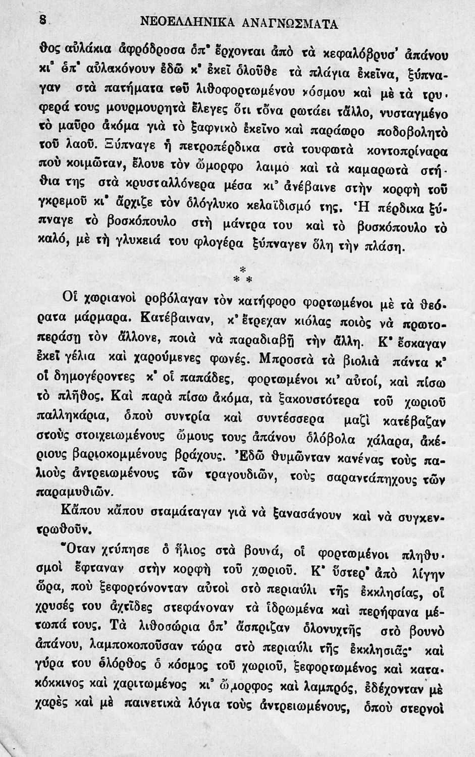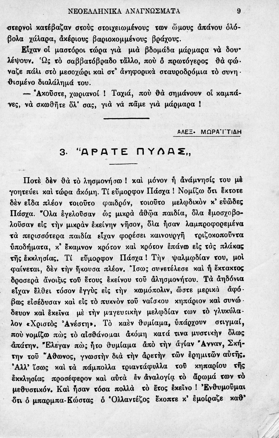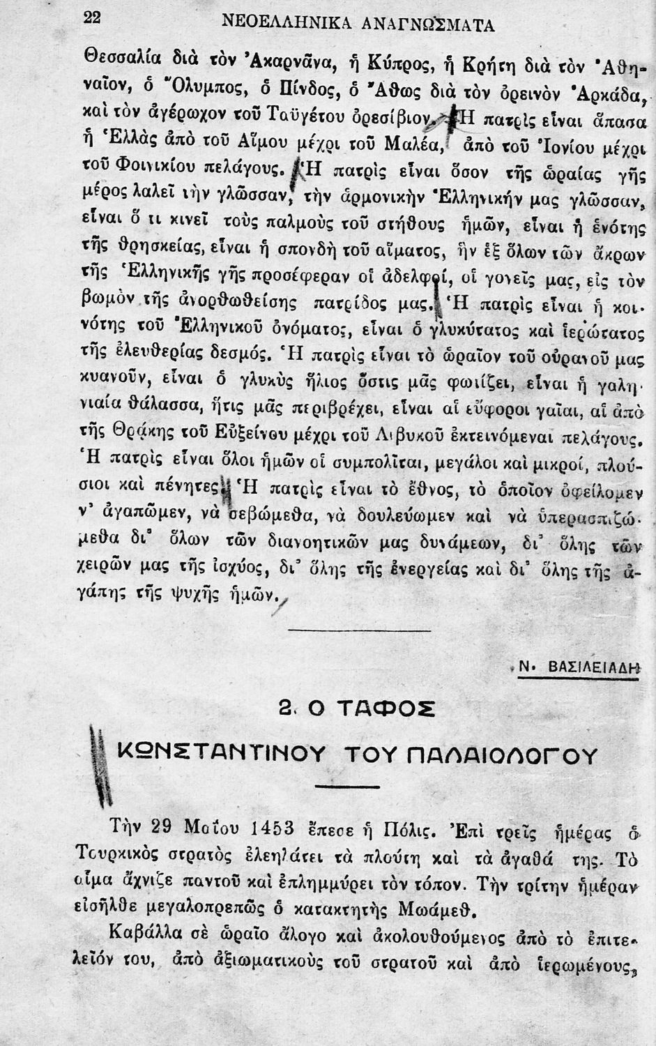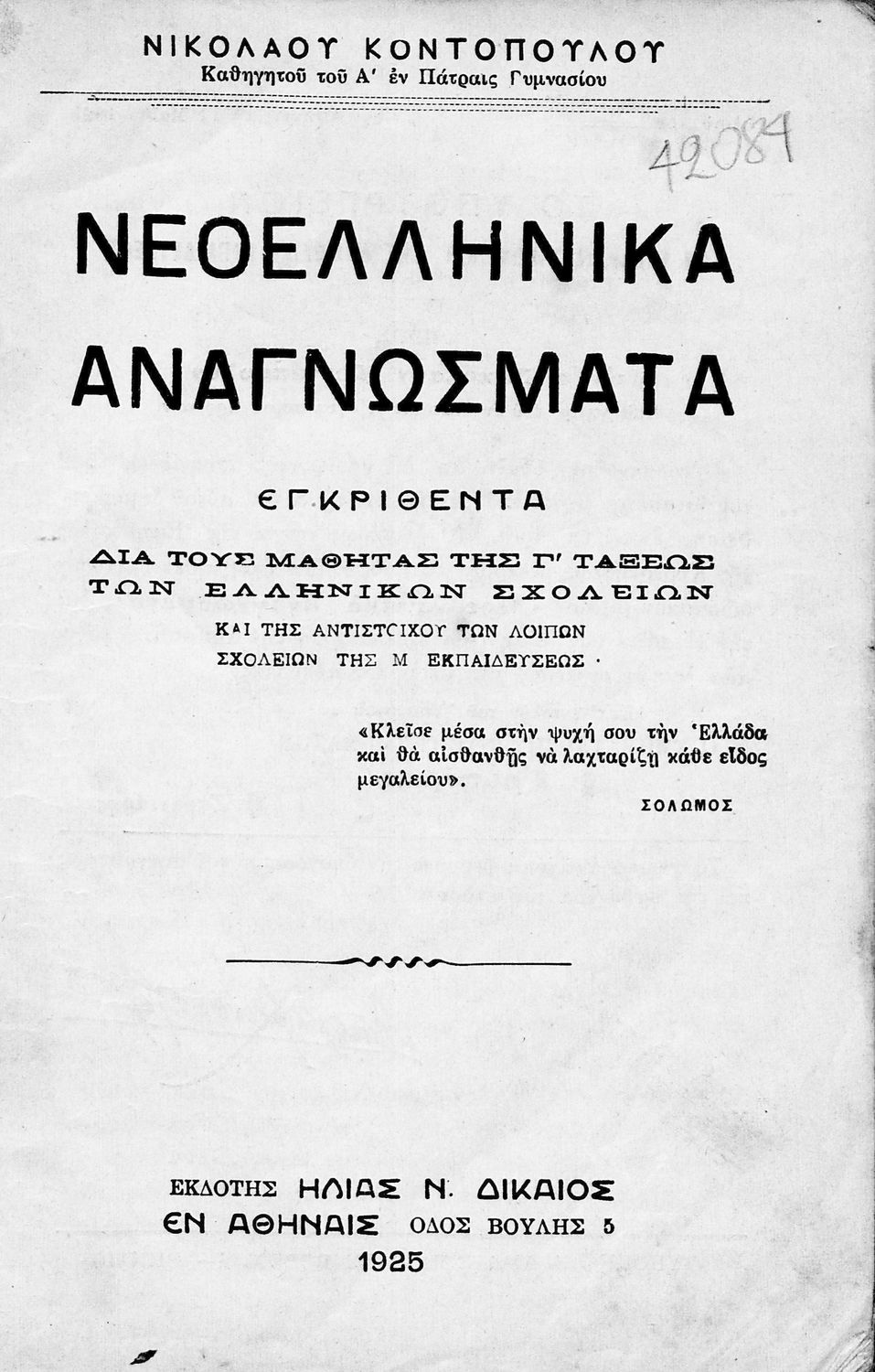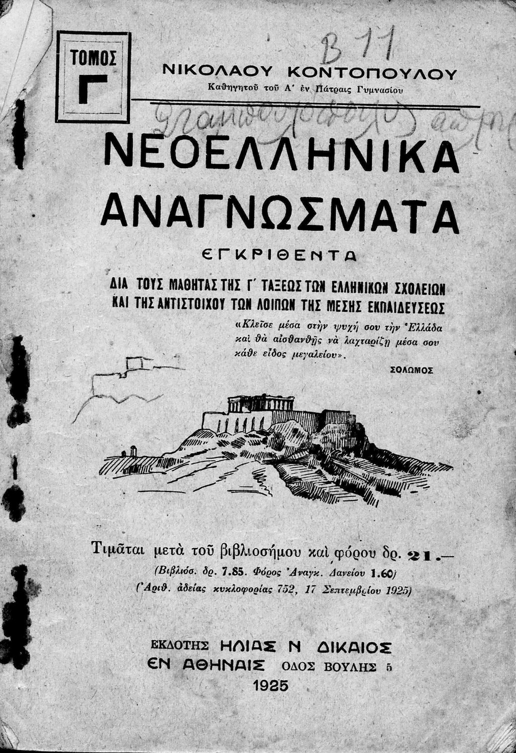 Σχολικό εγχειρίδιο Νέων Ελληνικών Γ' Ελληνικού Σχολείου που περιέχει πεζά και ποιήματα Ελλήνων συγγραφέων και δημοτικά τραγούδια εμπνευσμένα από τη βυζαντινή και σύγχρονη ελληνική ιστορία, και την οικογενειακή και θρησκευτική ζωή. Περιέχει παράρτημα με βιογραφίες των συγγραφέων και πραγματολογικές και γλωσσικές σημειώσεις.