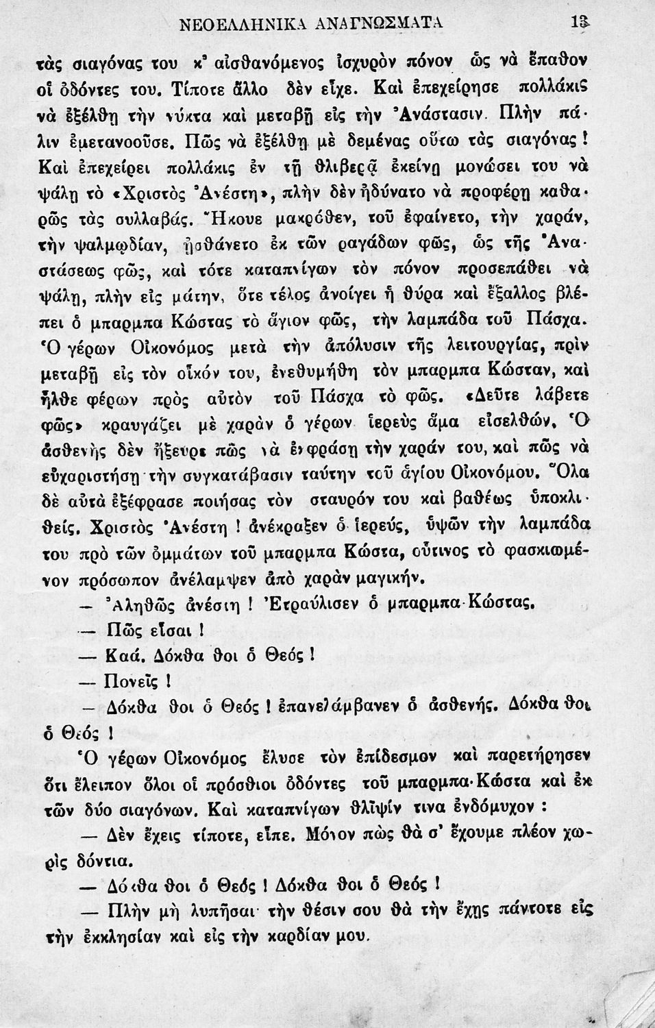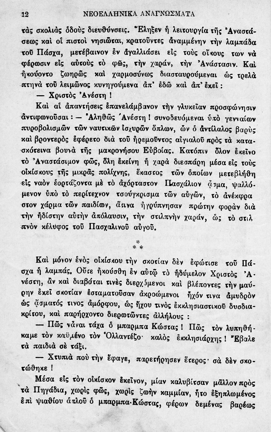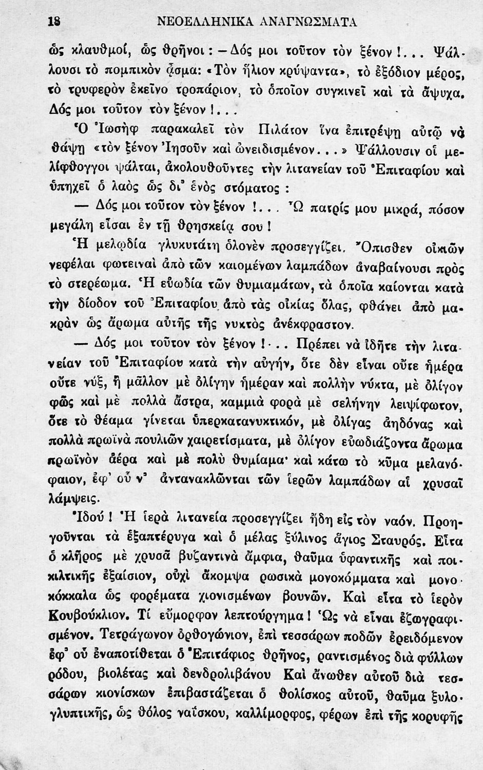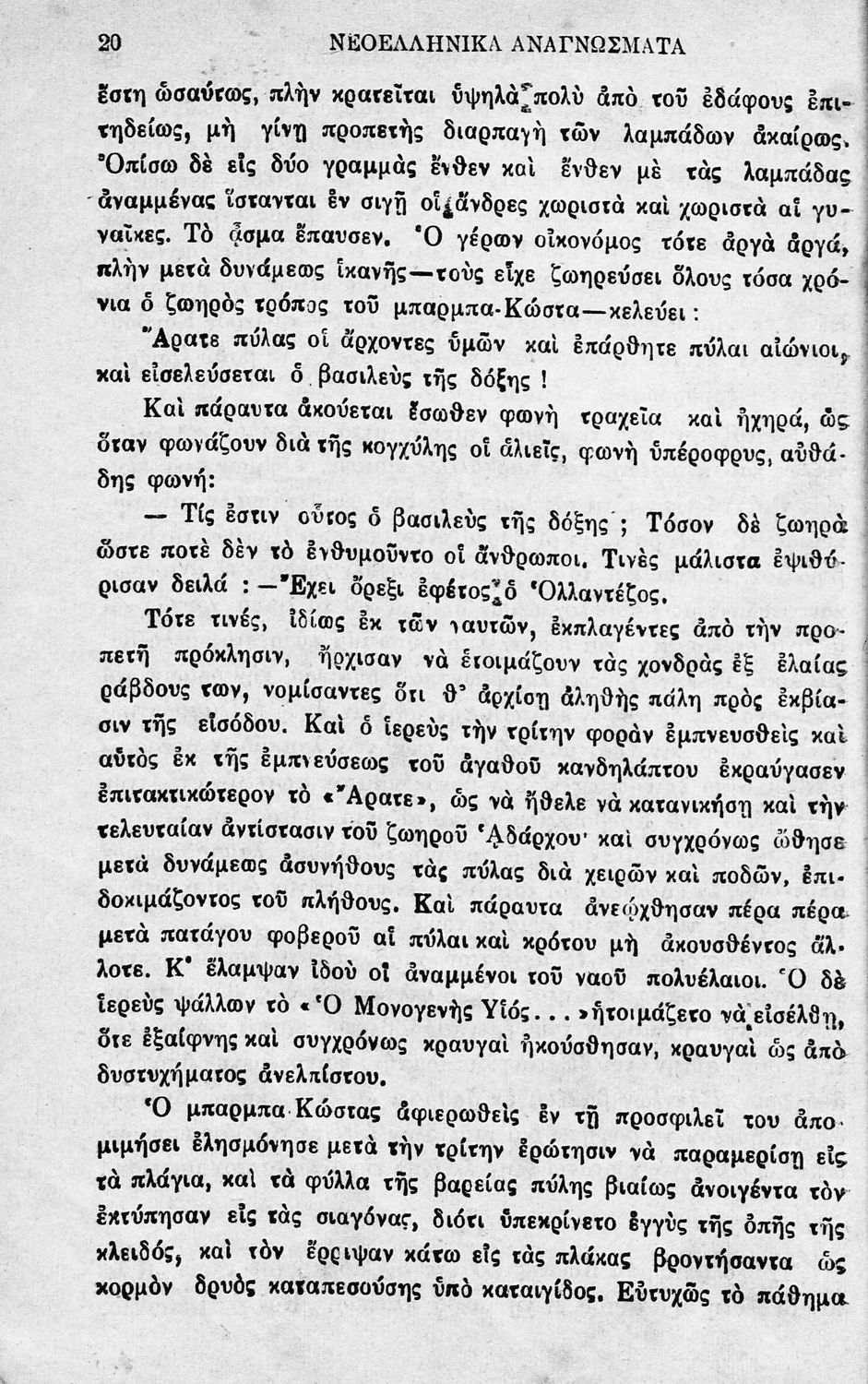 Σχολικό εγχειρίδιο Νέων Ελληνικών Γ' Ελληνικού Σχολείου που περιέχει πεζά και ποιήματα Ελλήνων συγγραφέων και δημοτικά τραγούδια εμπνευσμένα από τη βυζαντινή και σύγχρονη ελληνική ιστορία, και την οικογενειακή και θρησκευτική ζωή. Περιέχει παράρτημα με βιογραφίες των συγγραφέων και πραγματολογικές και γλωσσικές σημειώσεις.