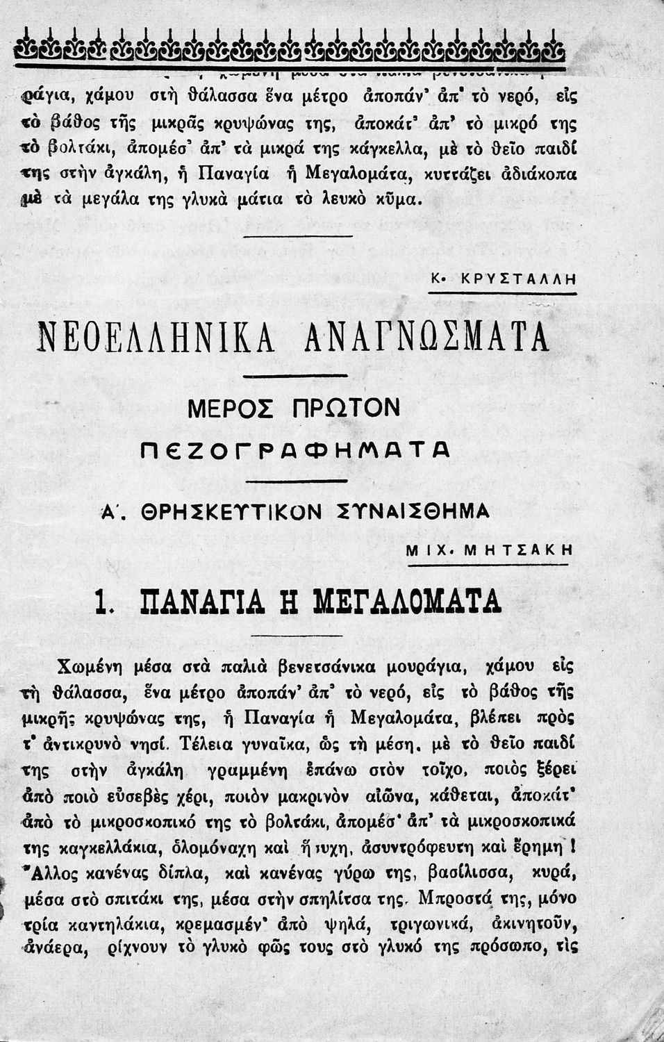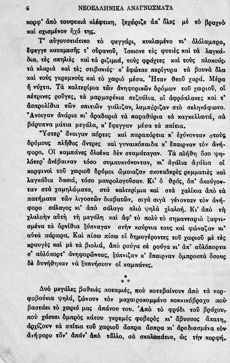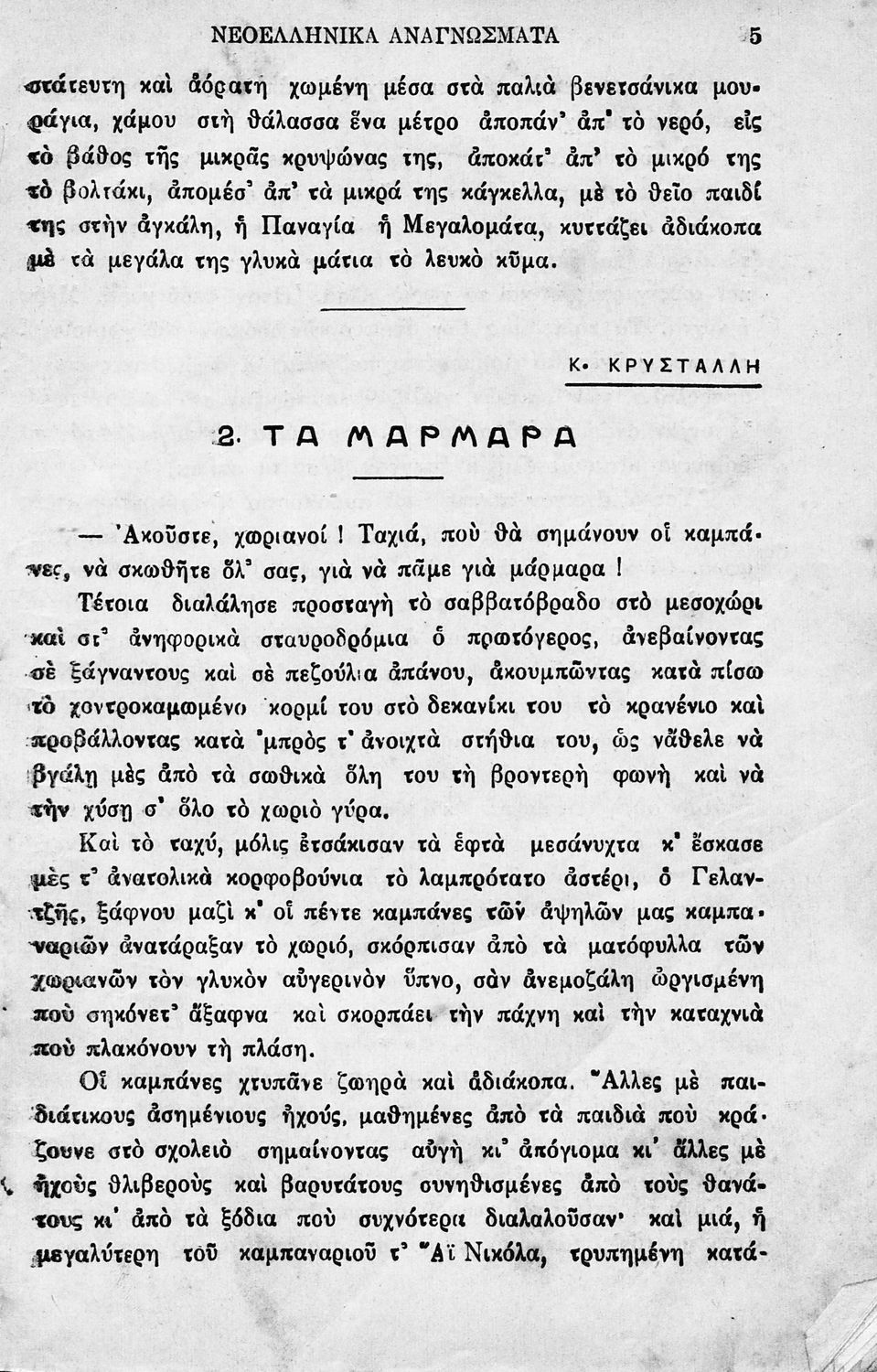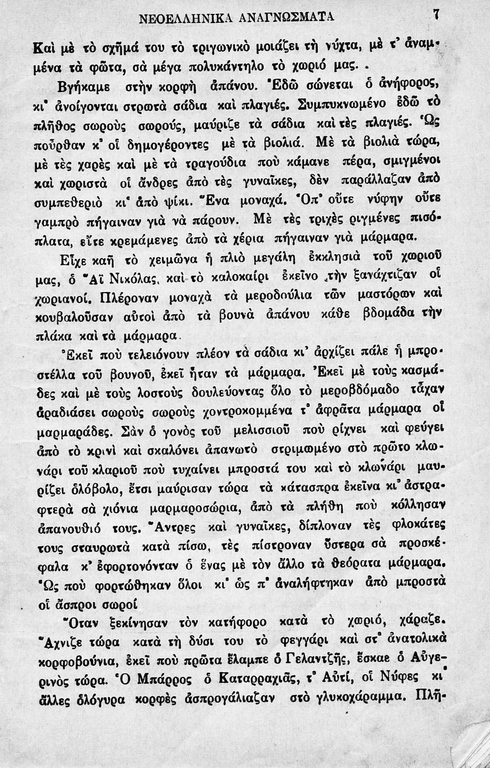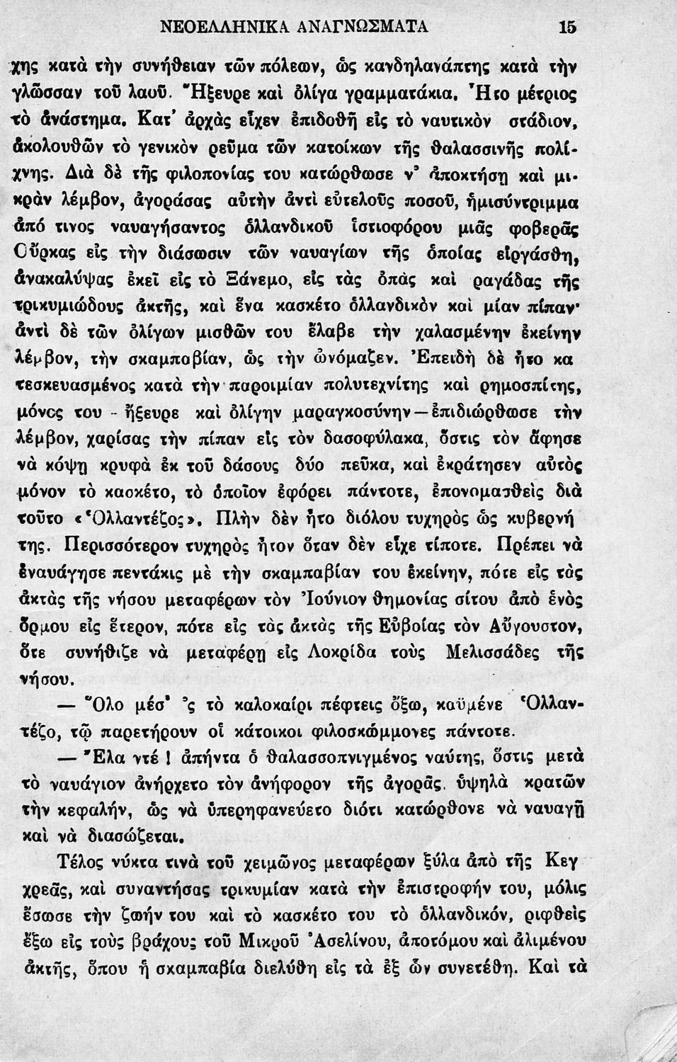 Σχολικό εγχειρίδιο Νέων Ελληνικών Γ' Ελληνικού Σχολείου που περιέχει πεζά και ποιήματα Ελλήνων συγγραφέων και δημοτικά τραγούδια εμπνευσμένα από τη βυζαντινή και σύγχρονη ελληνική ιστορία, και την οικογενειακή και θρησκευτική ζωή. Περιέχει παράρτημα με βιογραφίες των συγγραφέων και πραγματολογικές και γλωσσικές σημειώσεις.