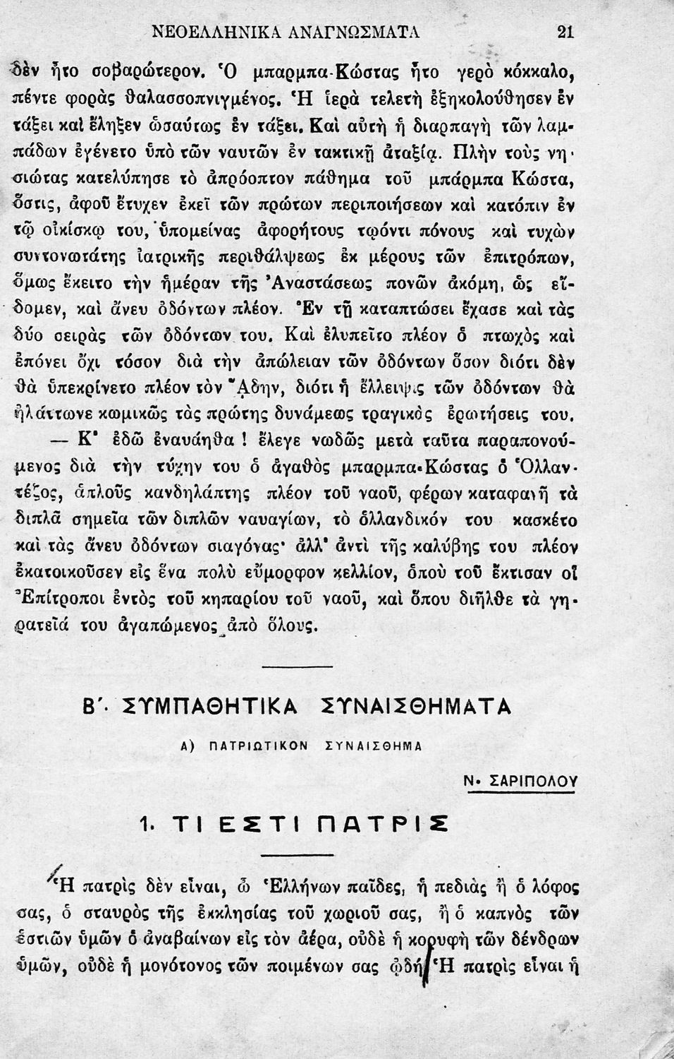 LDR 01573 2200205 4500 035 ## _a01-42084 040 ## _aΙνστιτούτο Εκπαιδευτικής Πολιτικής 041 ## _ael 100 ## _aΝικόλαος Κοντόπουλος 110 ## _a42084 245 0# _aΝεοελληνικά αναγνώσματα εγκριθέντα δια τους μαθητάς της Γ΄ τάξεως των Ελληνικών Σχολείων και της αντίστοιχης των Ελληνικών Σχολείων της Μ. Εκπαιδεύσεως 260 ## _aΑθήνα _bΗλίας Ν. Δικαίος _c1925 300 ## _a224 _c20 520 ## _aΣχολικό εγχειρίδιο Νέων Ελληνικών Γ' Ελληνικού Σχολείου που περιέχει πεζά και ποιήματα Ελλήνων συγγραφέων και δημοτικά τραγούδια εμπνευσμένα από τη βυζαντινή και σύγχρονη ελληνική ιστορία, και την οικογενειακή και θρησκευτική ζωή. Περιέχει παράρτημα με βιογραφίες των συγγραφέων και πραγματολογικές και γλωσσικές σημειώσεις. 521 ## _aΓ' Ελληνικού Σχολείου 522 ## _aΕλλάδα 546 ## _aΚαθαρεύουσα / Δημοτική 563 ## _aΜαλακό Εξώφυλλο 583 ## _a18469/11-5-1925 _c1925 650 #4 _aΒιζυηνός _aΠαπαδιαμάντης _aΠαπαρρηγόπουλος _aΣολωμός