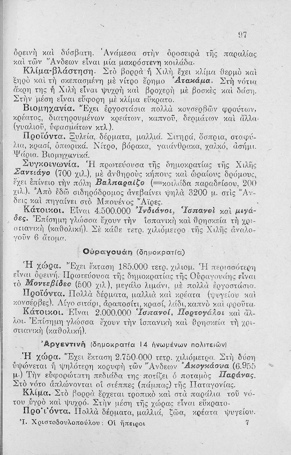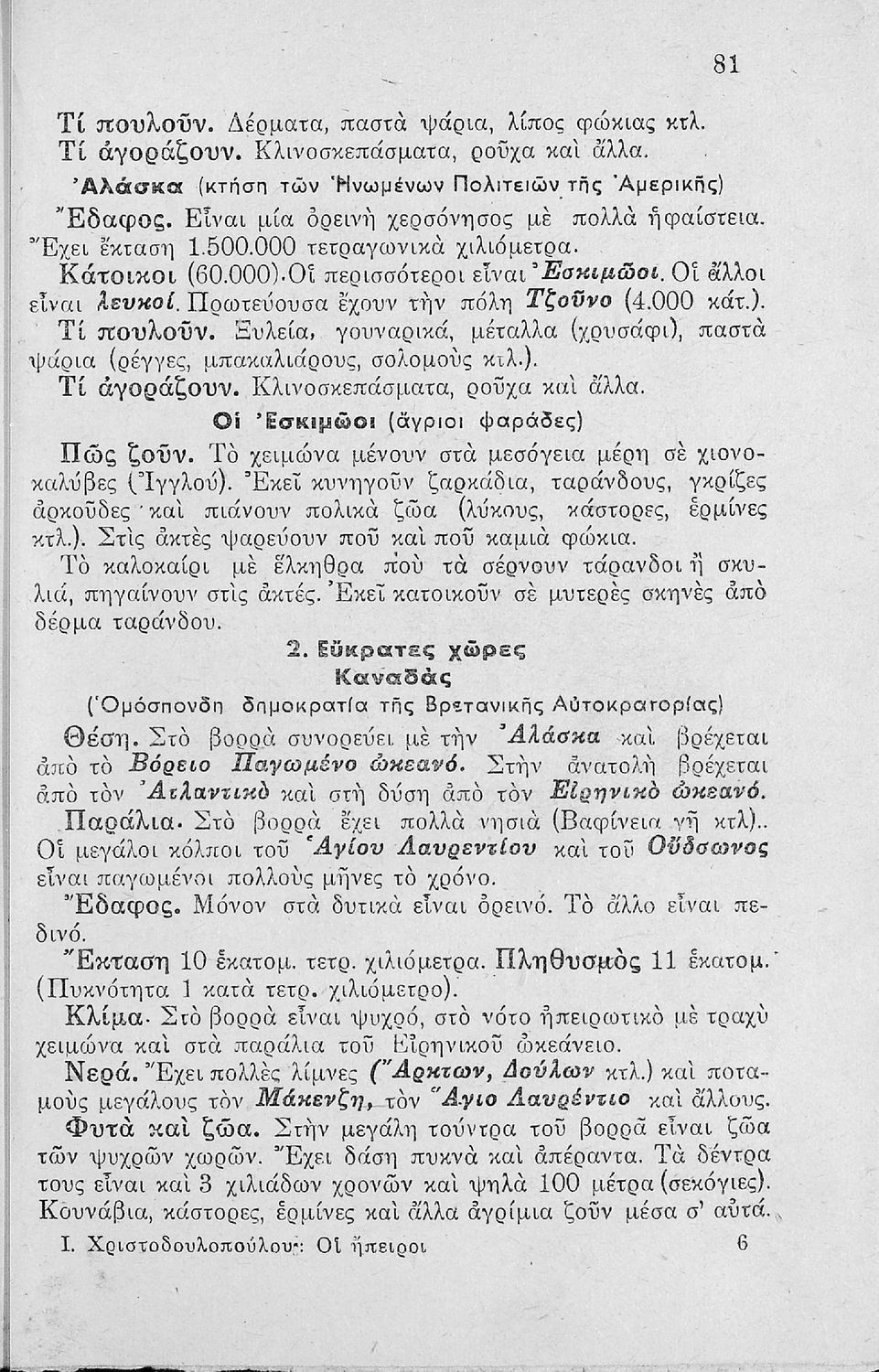 Μαθητικό βοήθημα Γεωγραφίας για την Ε' Δημοτικού. Πρόκειται για βιβλίο φυσικής και μαθηματικής γεωγραφίας. Εξετάζει τις Ηπείρους και τα κράτη τους γεωφυσικά, πολιτικά και οικονομικά χωρίζοντας τη μελέτη σε Νέο και Παλαιό Κόσμο. Ο συγγραφέας ήταν Δημοδιδάσκαλος στην Πρότυπη Παιδαγωγική Ακαδημία Τρίπολης.