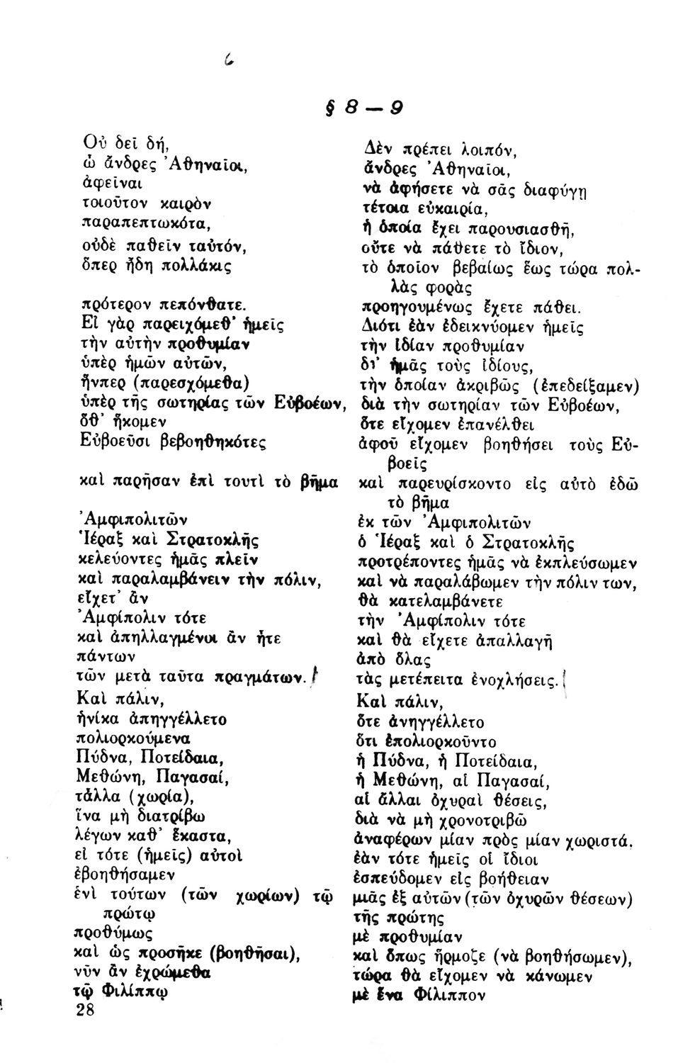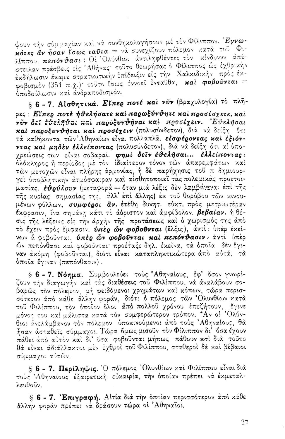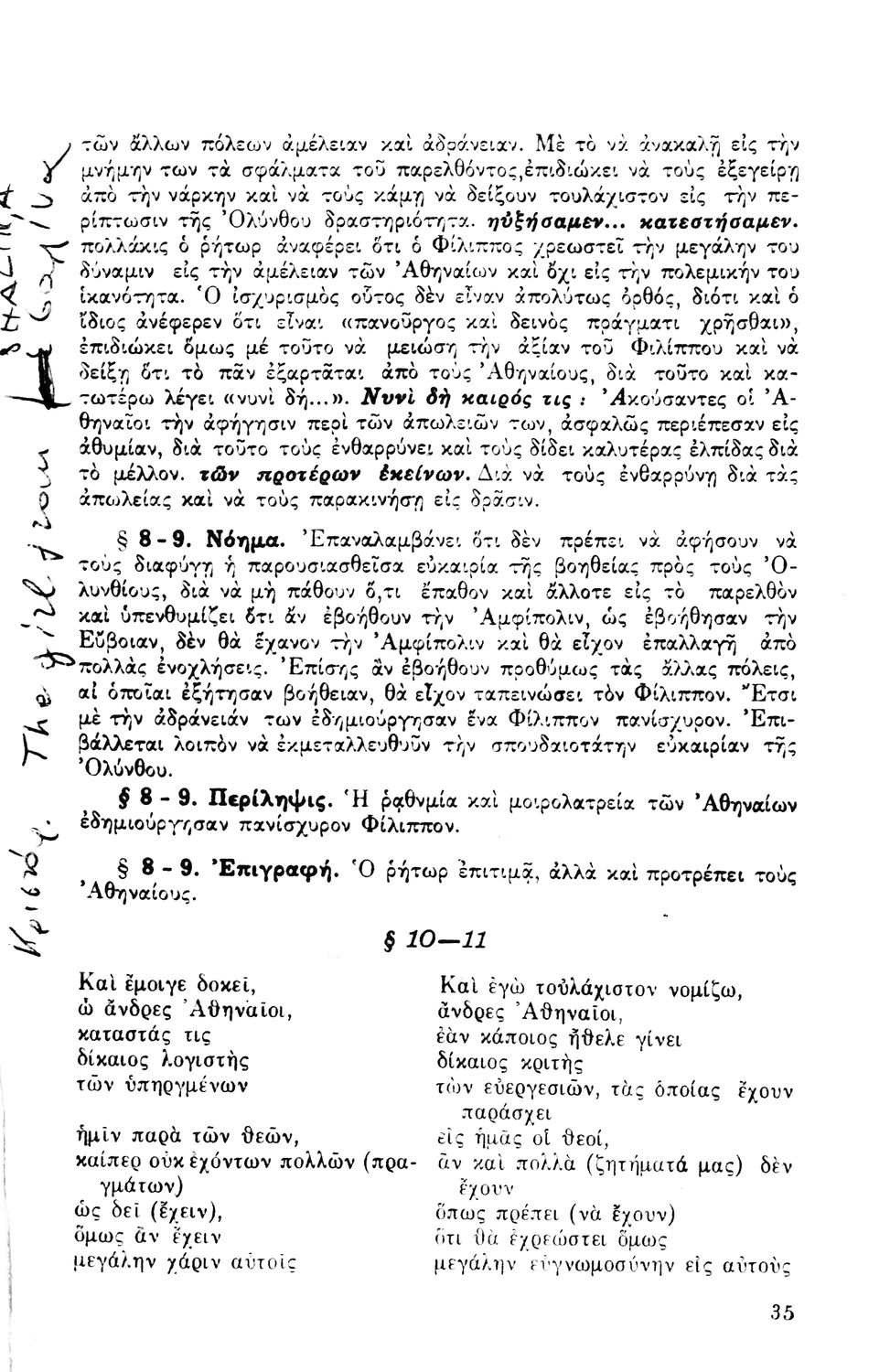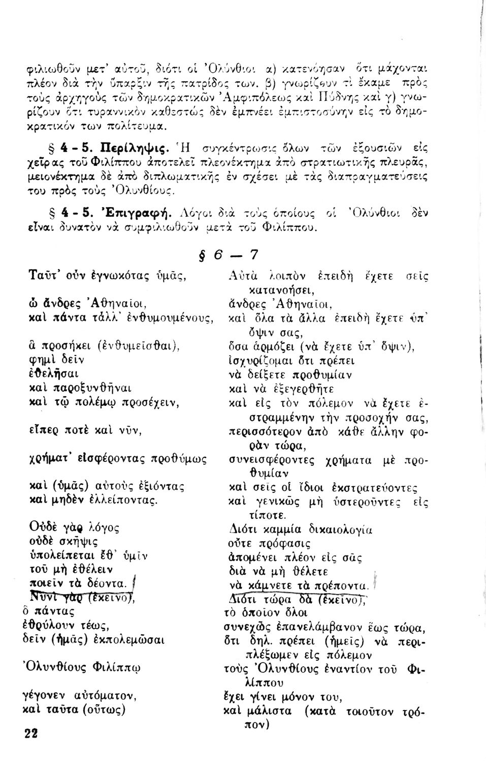 Μαθητικό βοήθημα Αρχαίων Ελληνικών Ε΄ Εξαταξίου Γυμνασίου που περιλαμβάνει μετάφραση των Α΄ και Β΄ Ολυνθιακών Λόγων του Δημοσθένη, και γραμματικές, ερμηνευτικές και συντακτικές παρατηρήσεις.