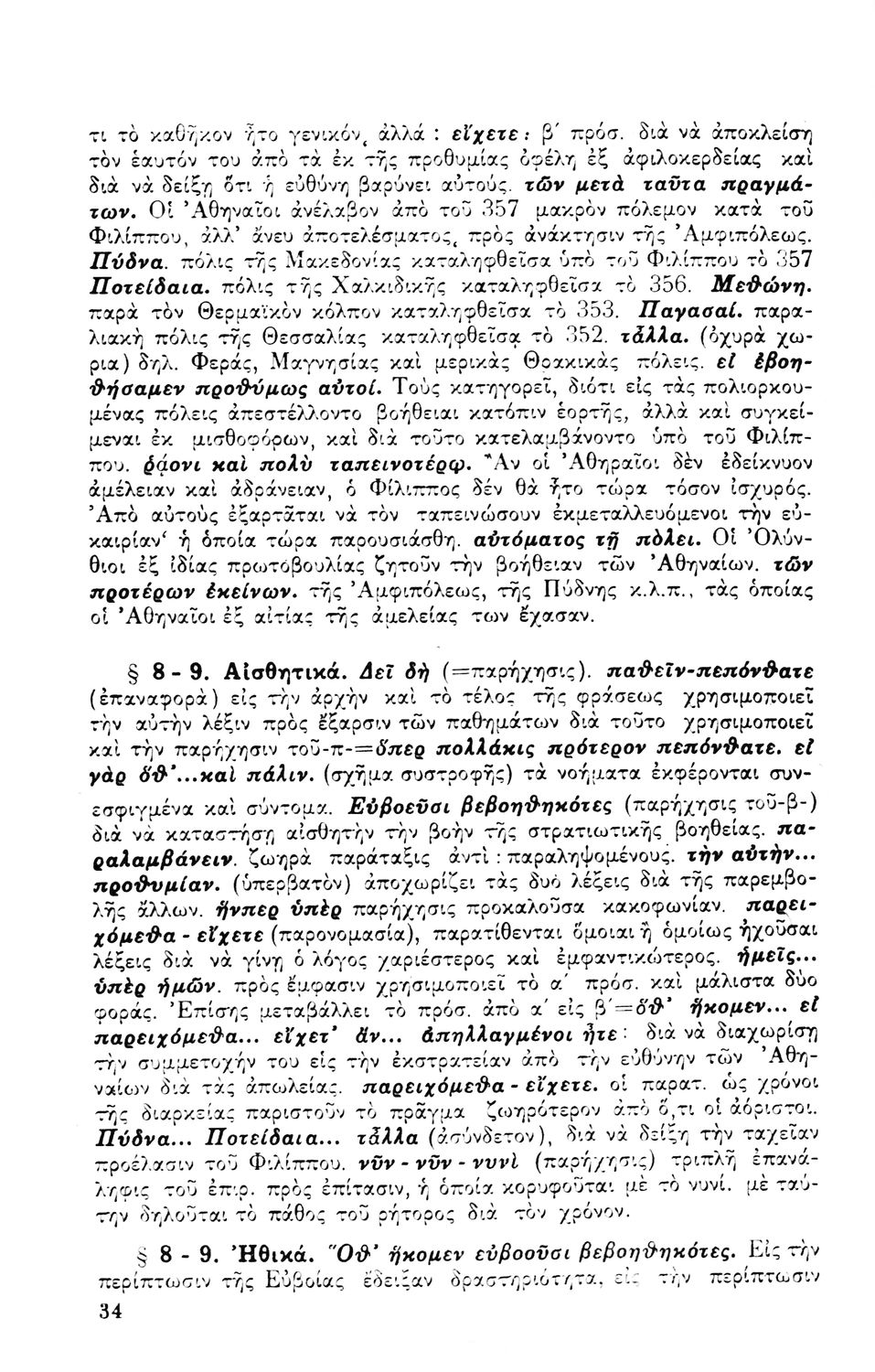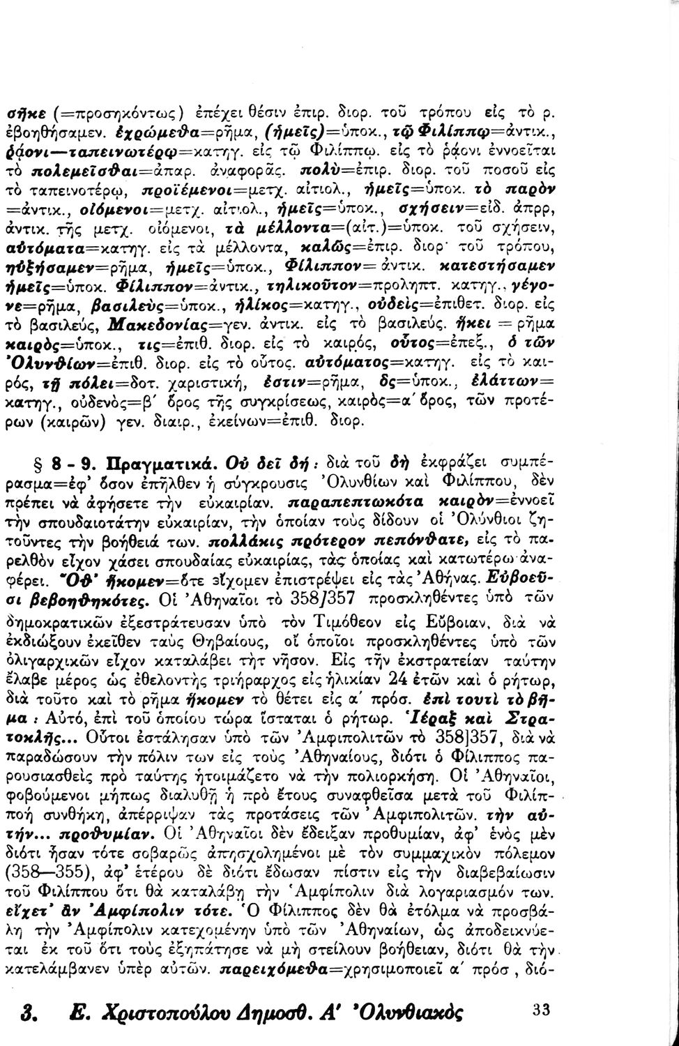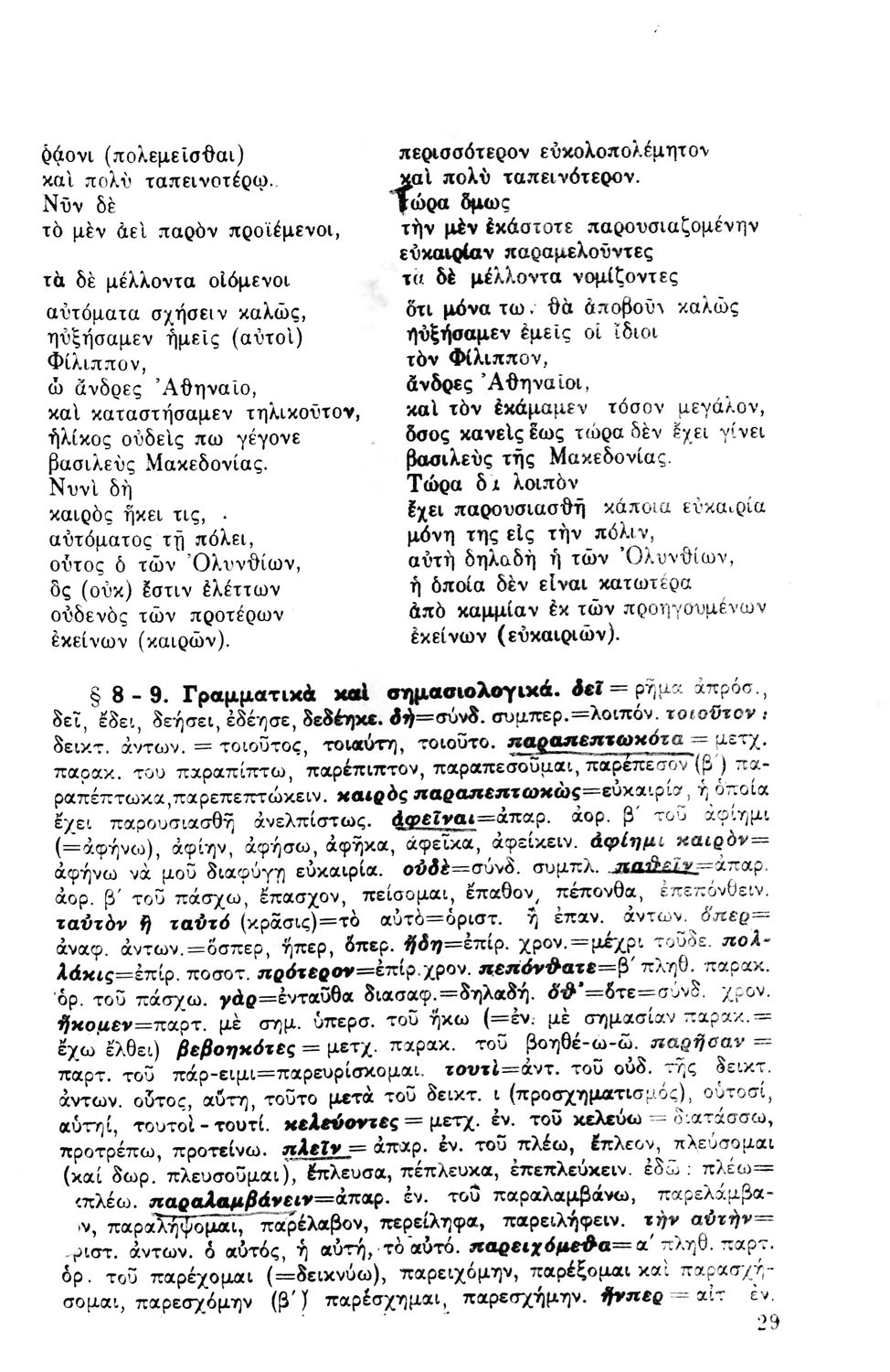 Μαθητικό βοήθημα Αρχαίων Ελληνικών Ε΄ Εξαταξίου Γυμνασίου που περιλαμβάνει μετάφραση των Α΄ και Β΄ Ολυνθιακών Λόγων του Δημοσθένη, και γραμματικές, ερμηνευτικές και συντακτικές παρατηρήσεις.