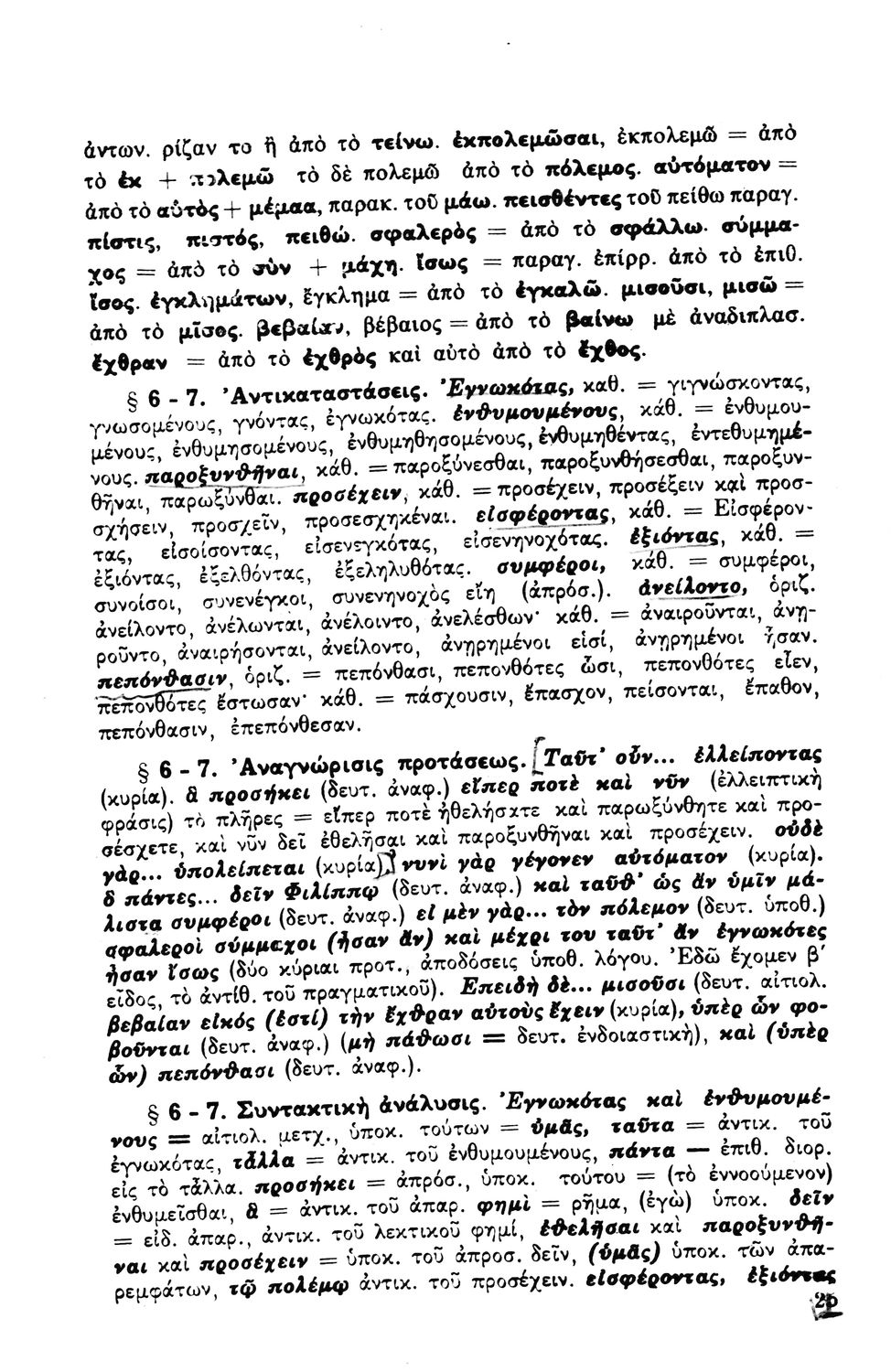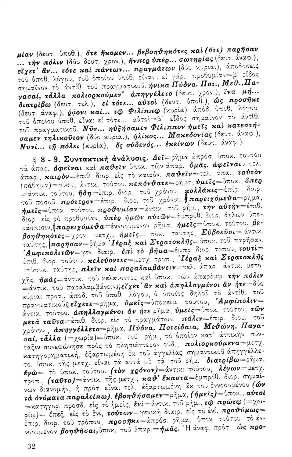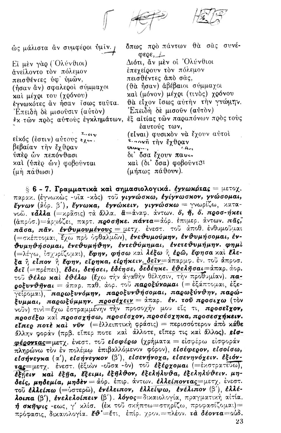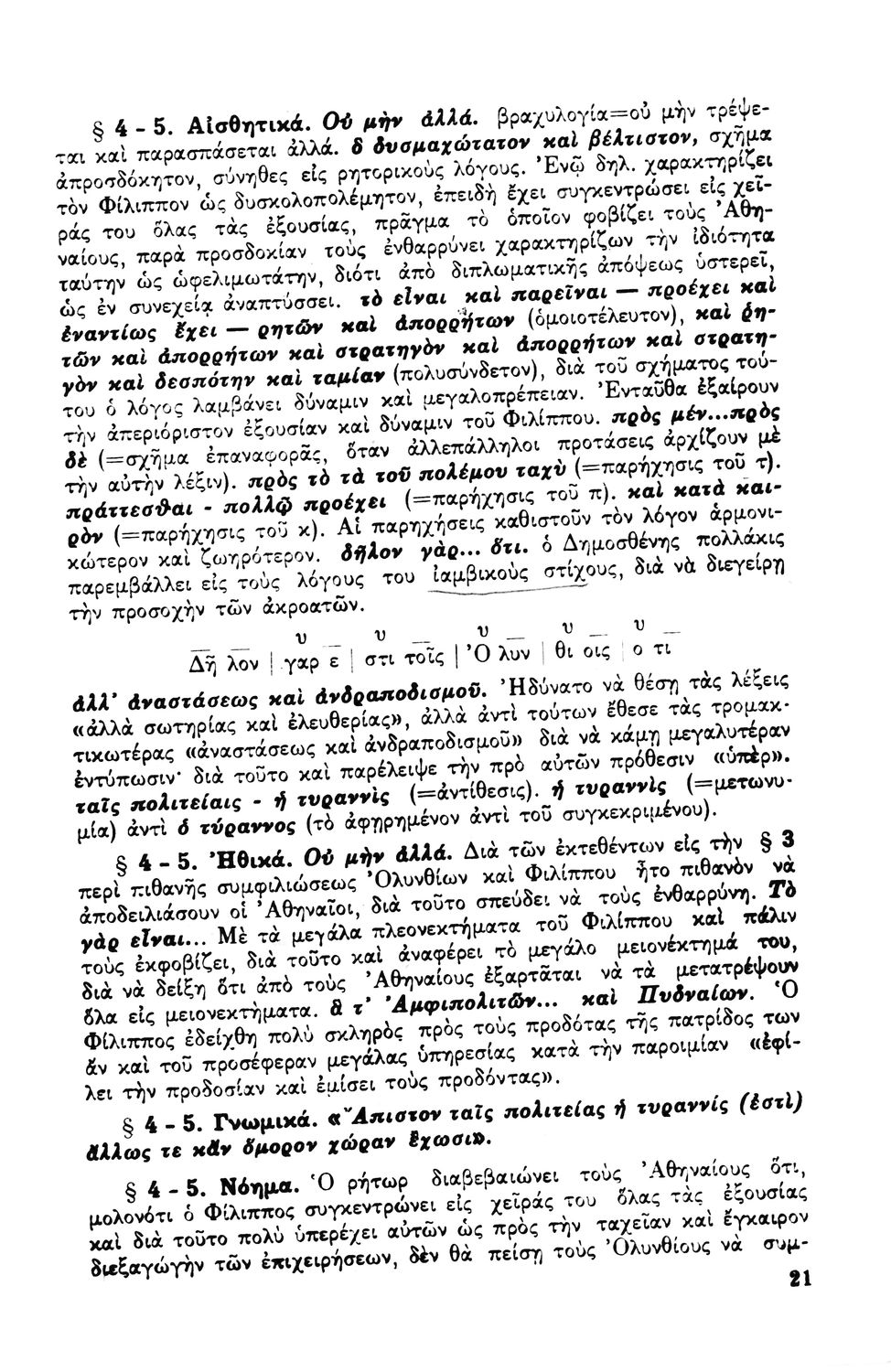 Μαθητικό βοήθημα Αρχαίων Ελληνικών Ε΄ Εξαταξίου Γυμνασίου που περιλαμβάνει μετάφραση των Α΄ και Β΄ Ολυνθιακών Λόγων του Δημοσθένη, και γραμματικές, ερμηνευτικές και συντακτικές παρατηρήσεις.