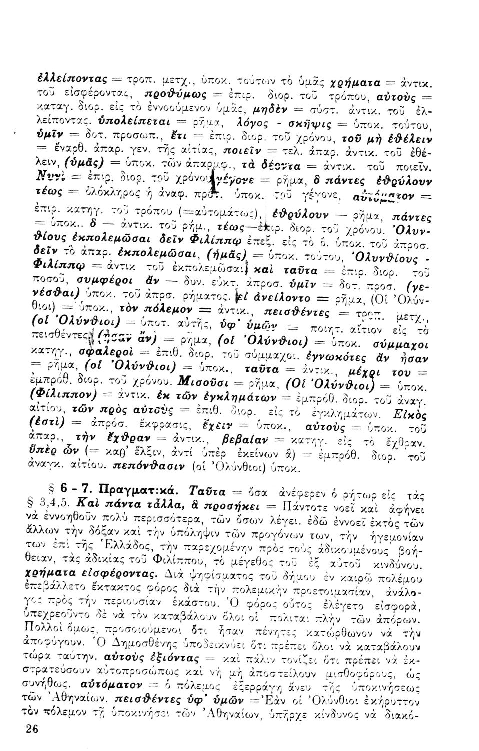 Μαθητικό βοήθημα Αρχαίων Ελληνικών ΣΤ΄ Οκταταξίου Γυμνασίου που περιέχει τον Α' Ολυνθιακό του Δημοσθένη, μετάφραση, γραμματικά και συντακτικά σχόλια.