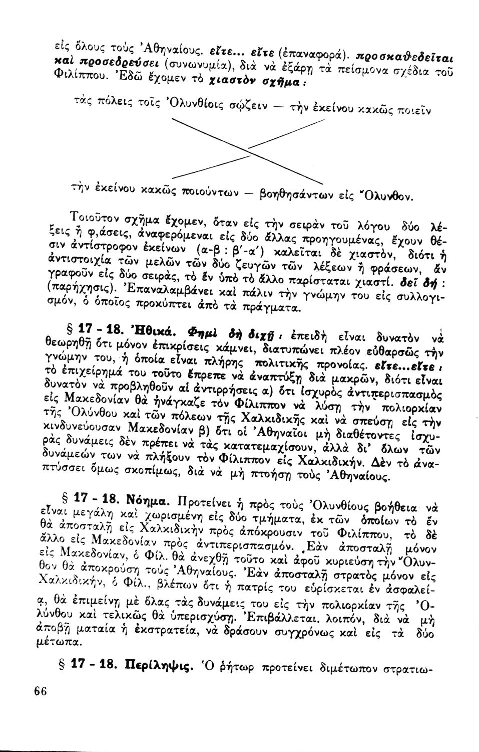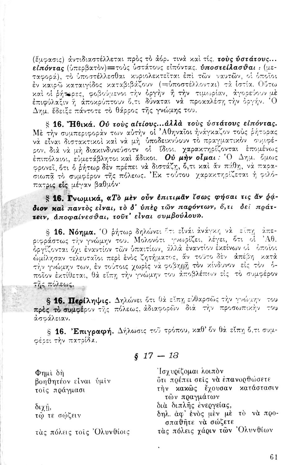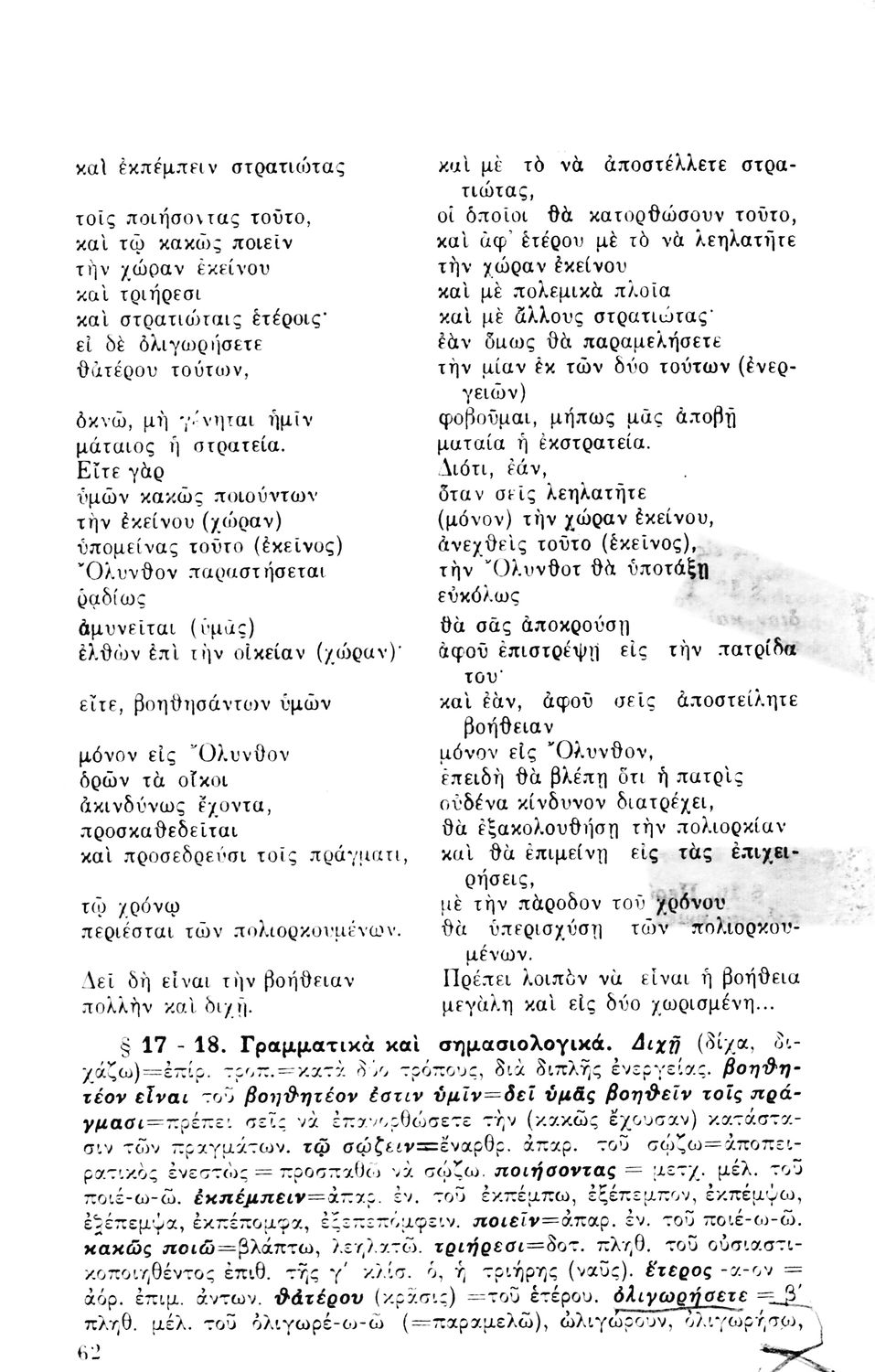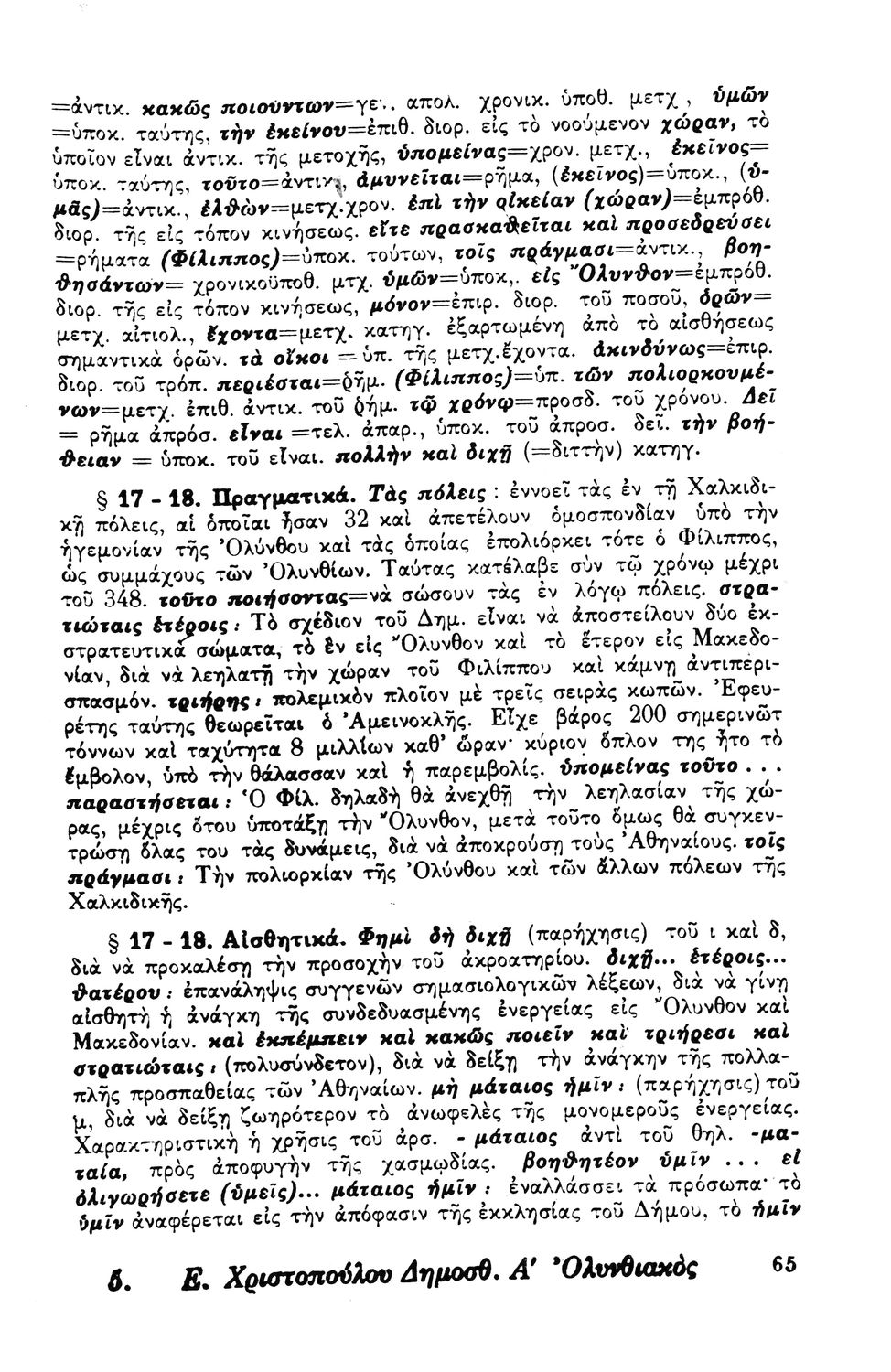 Μαθητικό βοήθημα Αρχαίων Ελληνικών Ε΄ Εξαταξίου Γυμνασίου που περιλαμβάνει μετάφραση των Α΄ και Β΄ Ολυνθιακών Λόγων του Δημοσθένη, και γραμματικές, ερμηνευτικές και συντακτικές παρατηρήσεις.