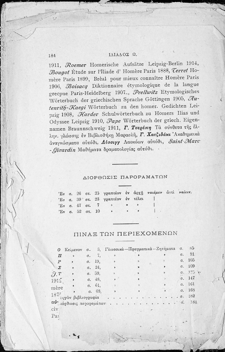 Μαθητικό βοήθημα του Ελληνικού Σχολείου, των Παρθεναγωγείων και του Γυμνασίου για το μάθημα των Αρχαίων Ελληνικών. Περιέχει τις ραψωδίες Ο, Π, Ρ, Σ, Τ, Χ, ψ, Ω από το πρωτότυπο με σχόλια και ερμηνευτικές ...