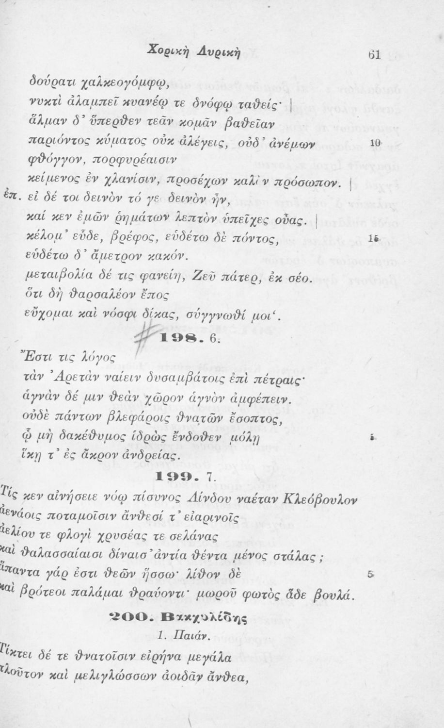 Σχολικό εγχειρίδιο Αρχαίων Ελληνικών που περιέχει αποσπάσματα αρχαίων Ελλήνων λυρικών, εισαγωγή και ερμηνευτικά σχόλια. Κοσμείται από μικρά διακοσμητικά σχέδια.