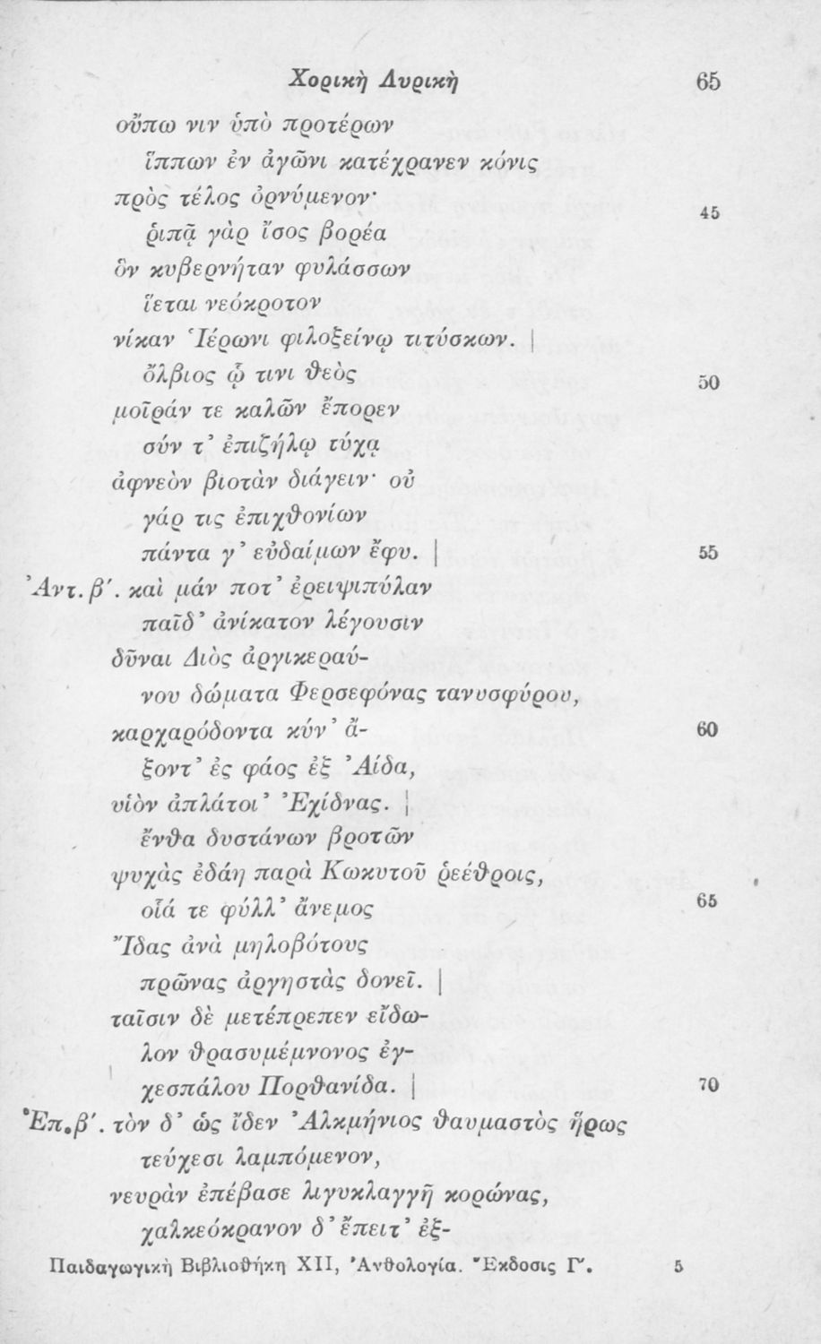Μαθητικό βοήθημα Αρχαίων Ελληνικών Ε΄ Γυμνασίου που περιλαμβάνει ποιήματα, ύμνους και επιγράμματα αρχαίων Ελλήνων λυρικών.