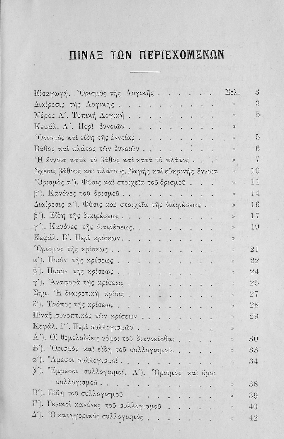 Σχολικό εγχειρίδιο Λογικής Γυμνασίου που είναι χωρισμένο σε στοιχειολογία και μεθοδολογία. Ο συγγραφέας ήταν Δρ Φιλοσοφίας και καθηγητής στη Ριζάρειο Σχολή και το Αρσάκειο Παρθεναγωγείο.