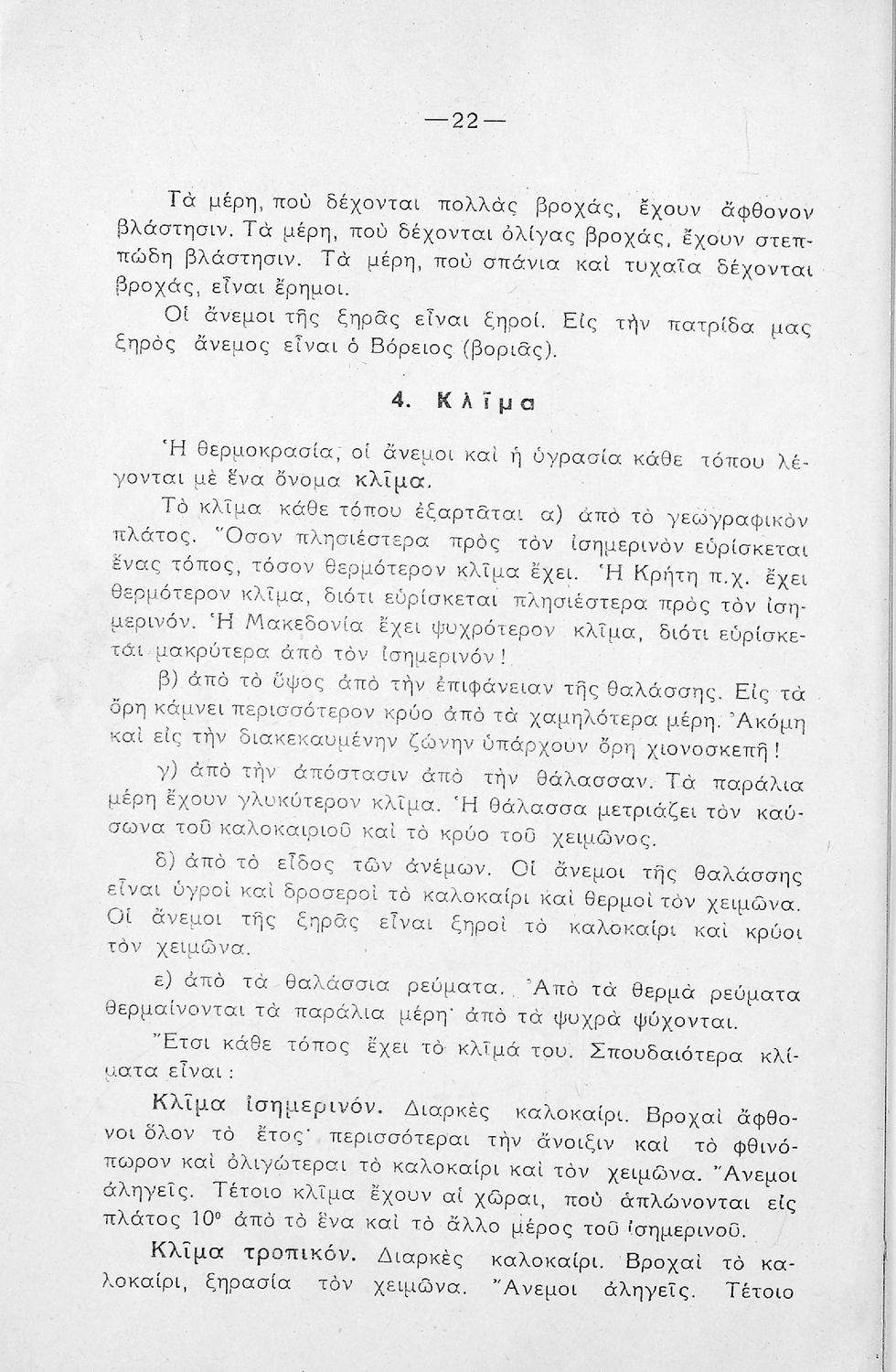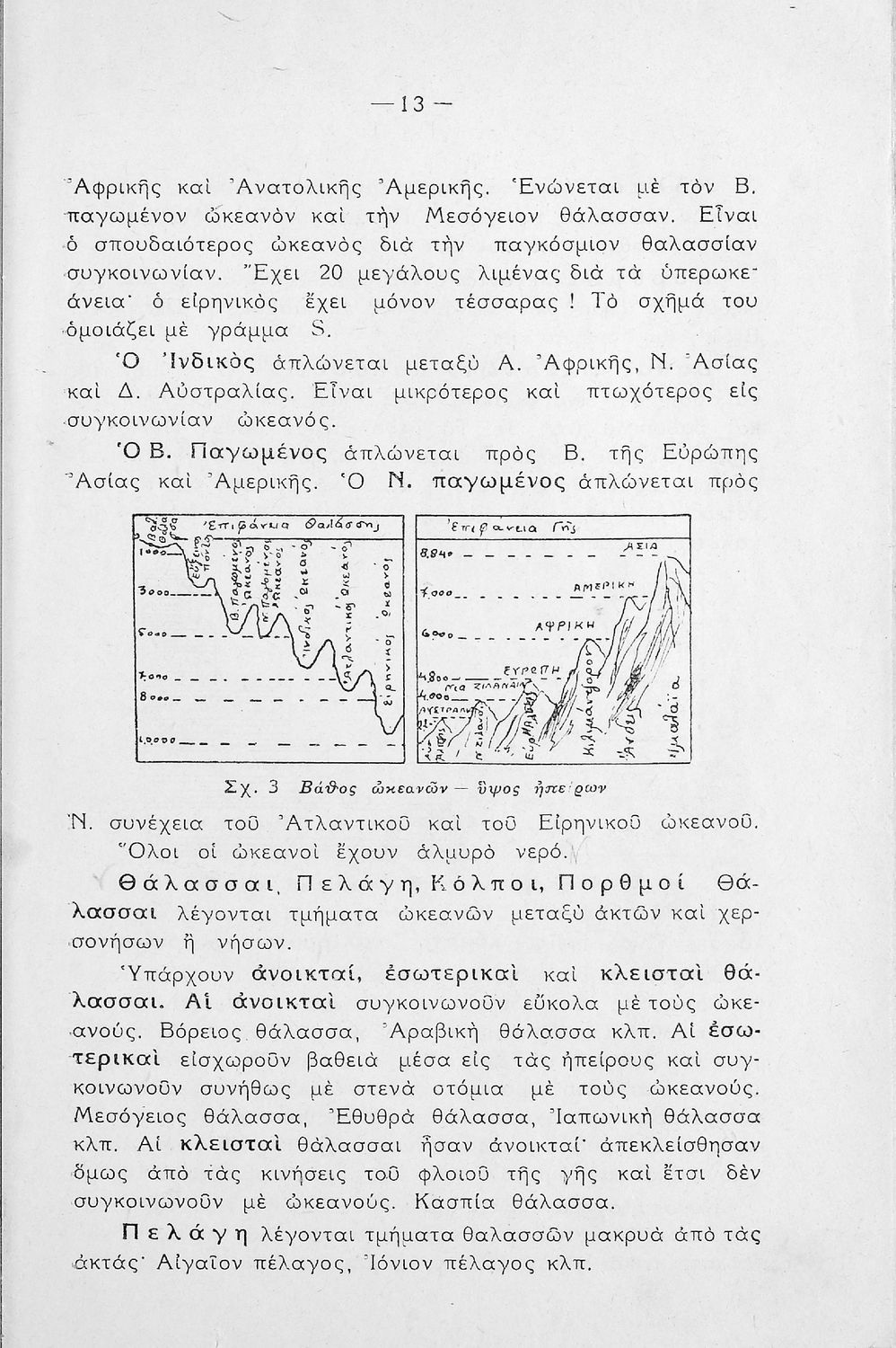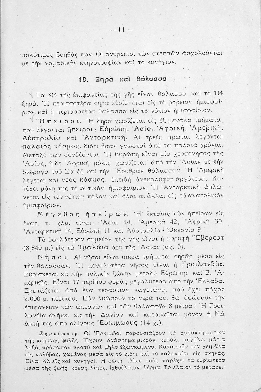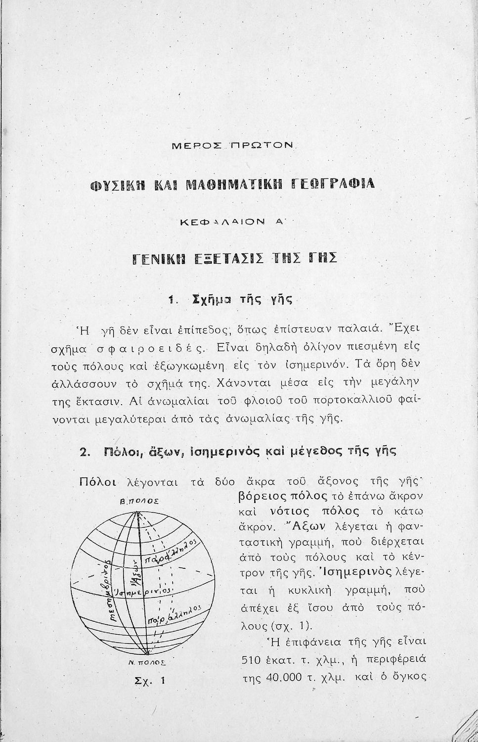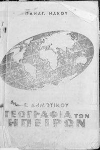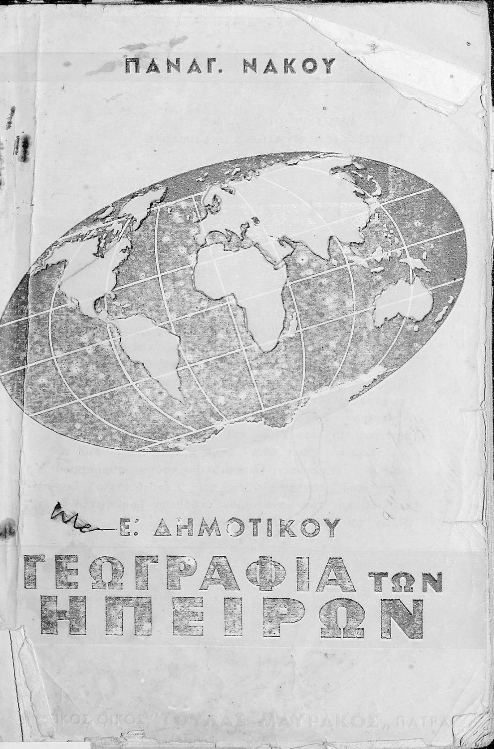 Πρόκειται για σχολικό εγχειρίδιο το οποίο προοριζόταν για τη διδασκαλία του μαθήματος της Γεωγραφίας στην Ε΄ και ΣΤ΄ Δημοτικού. Φέρει λίγες προσωπικές σημειώσεις του μαθητή και το εξώφυλλο παρουσιάζεται αρκετά