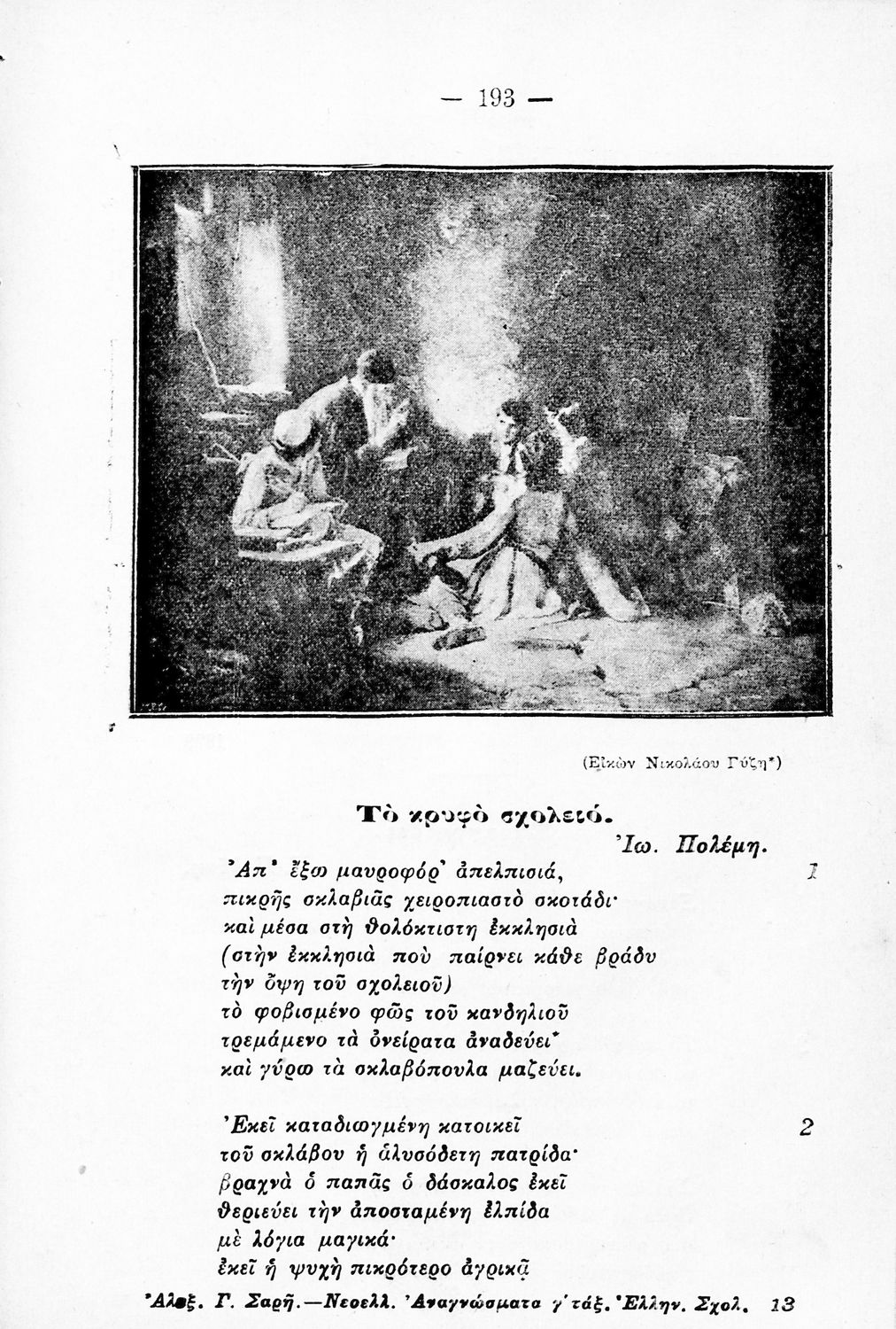 Σχολικό εγχειρίδιο Νέων Ελληνικών Γ' Ελληνικού Σχολείου που περιλαμβάνει ποιήματα και πεζά Ελλήνων συγγραφέων εμπνευσμένα από την σύγχρονη ελληνική ιστορία, την ελληνική φύση και τη ζωή στην ύπαιθρο, και τη ...