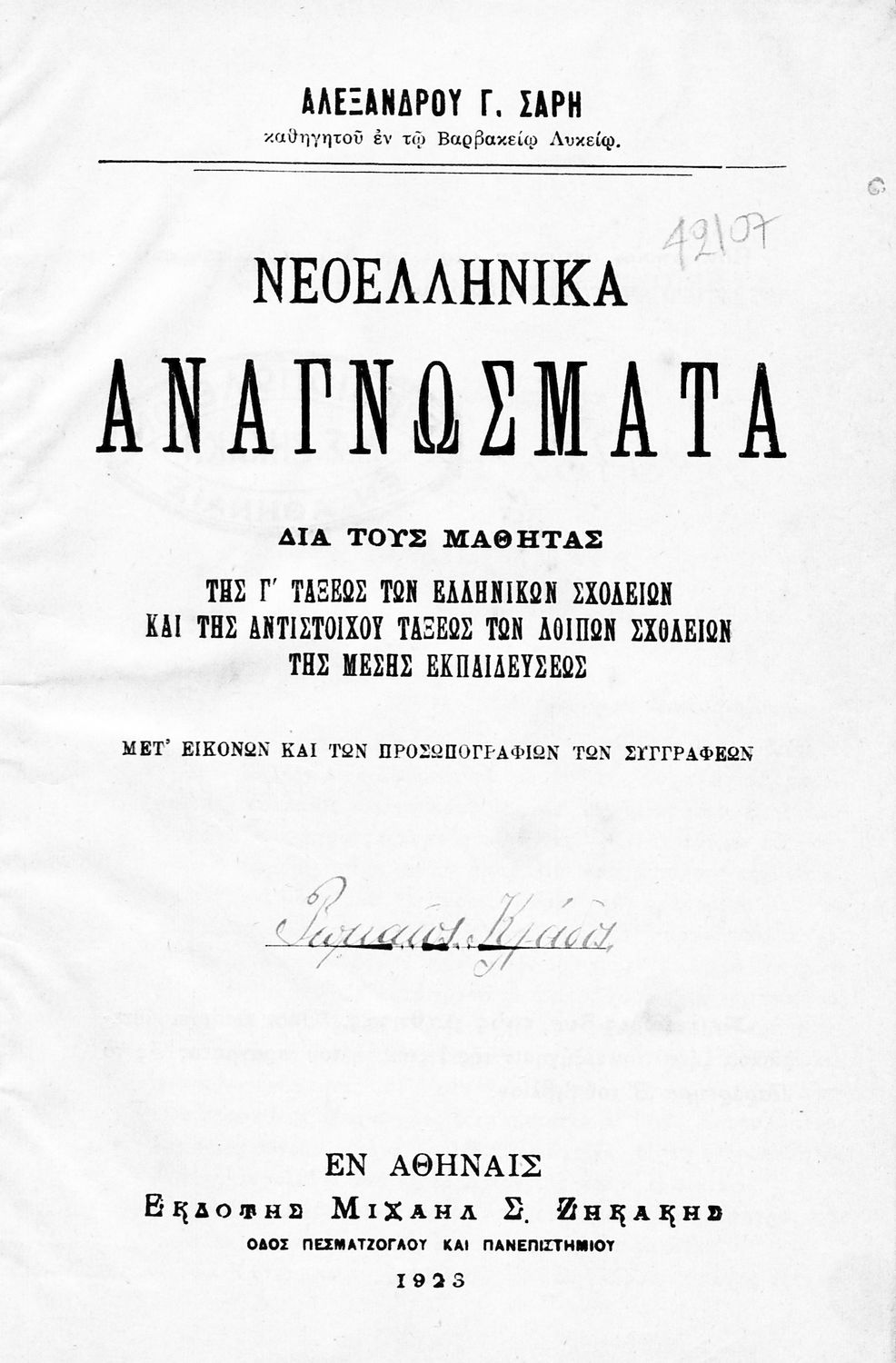 Τίτλος: Νεοελληνικά αναγνώσματα δια τους μαθητάς της Γ΄ τάξεως των Ελληνικών Σχολείων και της αντιστοίχου τάξεως των λοιπών σχολείων της Μέσης εκπαιδεύσεως