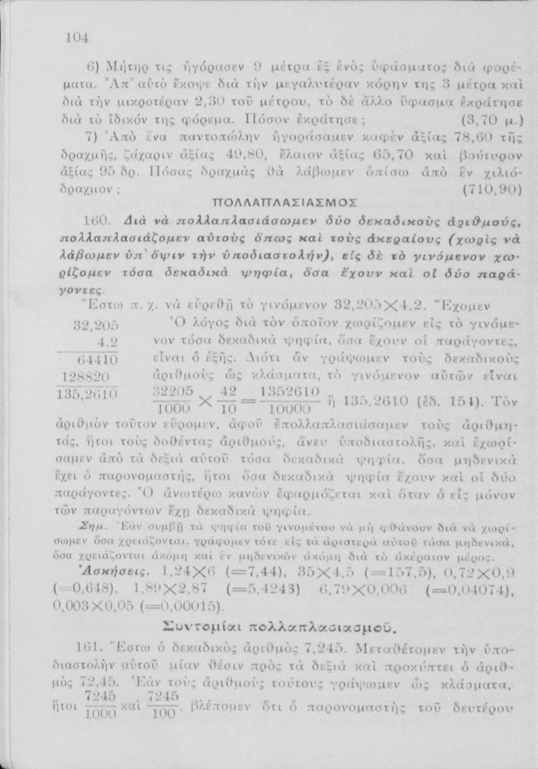 Σχολικό εγχειρίδιο Αριθμητικής για τις Α΄, Β΄, Γ΄ Γυμνασίου και τα Ανώτερα Παρθεναγωγεία που είναι χωρισμένο σε θεωρία και ασκήσεις και εστιάζει στις αριθμητικές πράξεις με κλάσματα και ακέραιους και συμμιγείς αριθμούς.