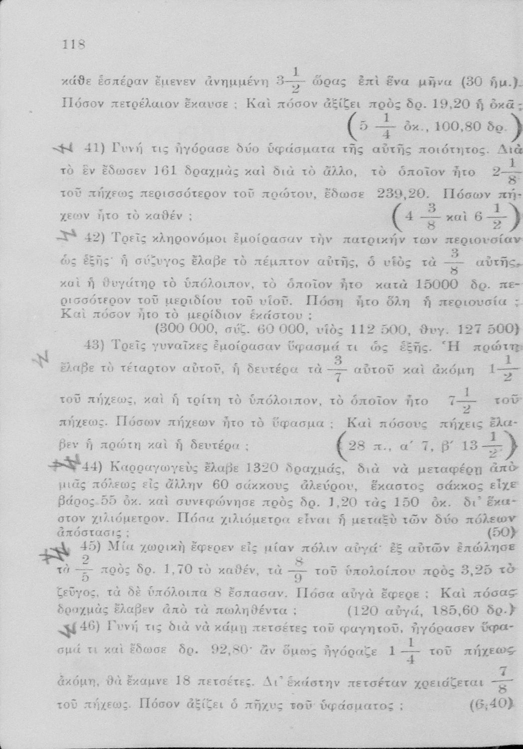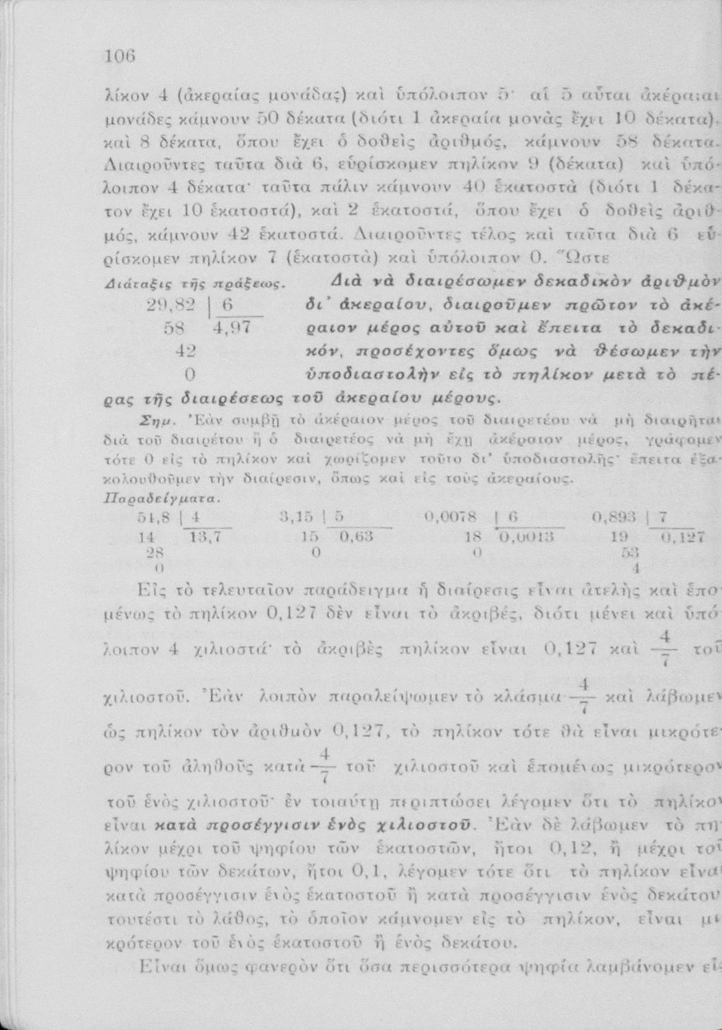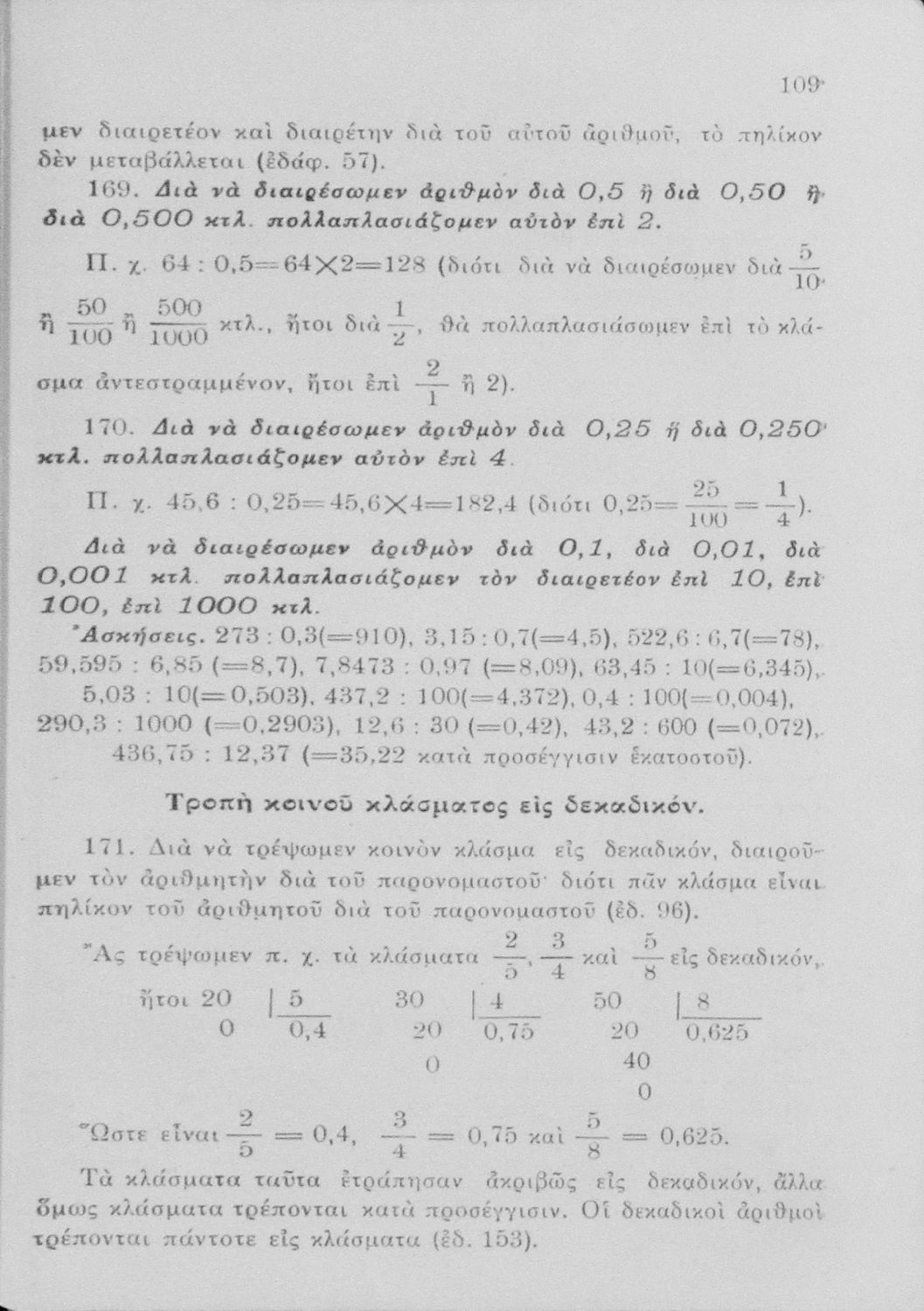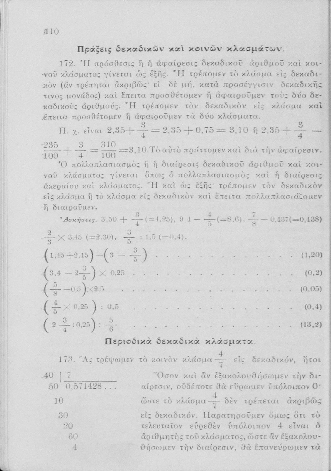 Σχολικό εγχειρίδιο Αριθμητικής για τις Α΄, Β΄, Γ΄ Γυμνασίου και τα Ανώτερα Παρθεναγωγεία που είναι χωρισμένο σε θεωρία και ασκήσεις και εστιάζει στις αριθμητικές πράξεις με κλάσματα και ακέραιους και συμμιγείς
