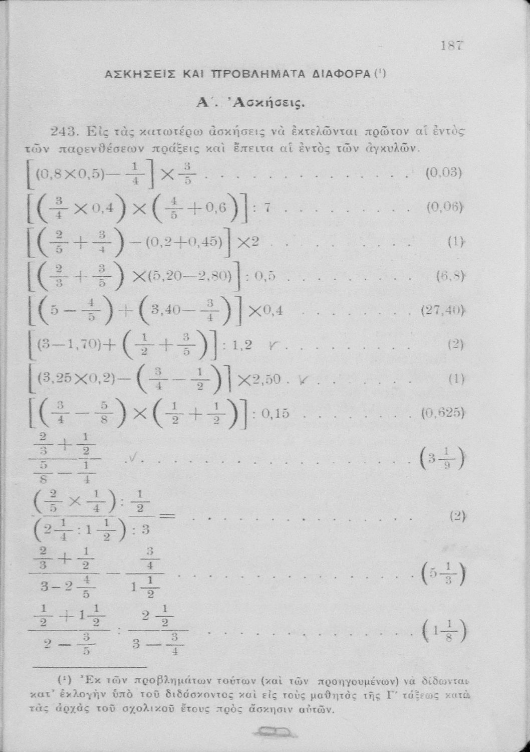 Σχολικό εγχειρίδιο Αριθμητικής για τις Α΄, Β΄, Γ΄ Γυμνασίου και τα Ανώτερα Παρθεναγωγεία που είναι χωρισμένο σε θεωρία και ασκήσεις και εστιάζει στις αριθμητικές πράξεις με κλάσματα και ακέραιους και συμμιγείς αριθμούς.
