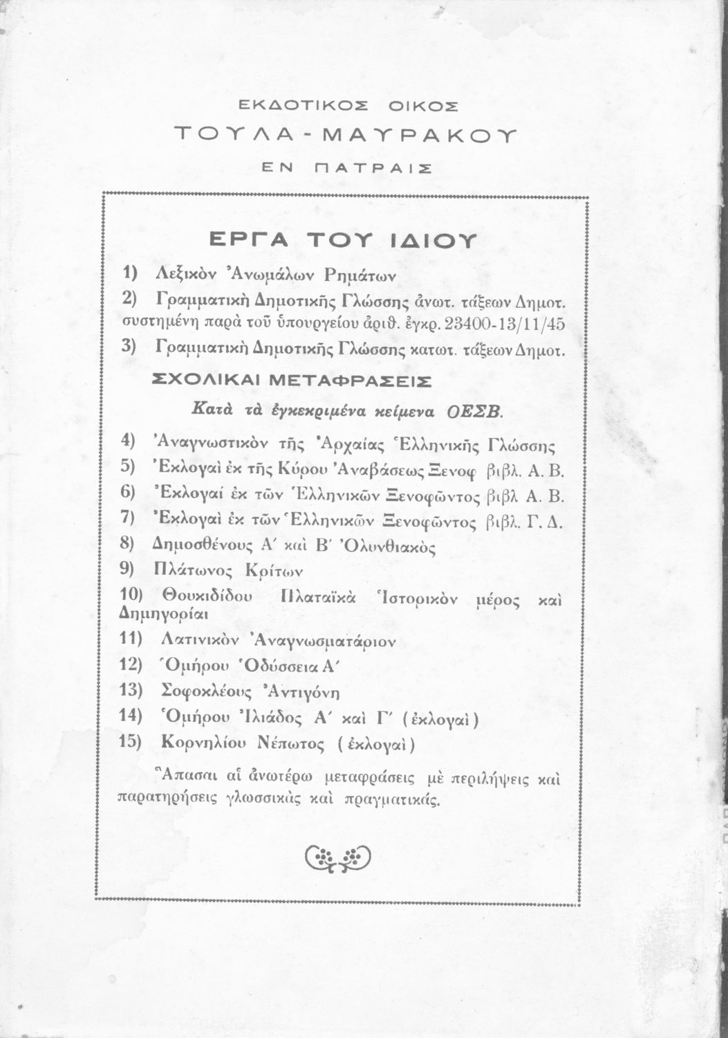 Σχολικό εγχειρίδιο Γλώσσας για τις Ε΄ και ΣΤ΄ Δημοτικού που αποτελεί σύνοψη της γραμματική της δημοτικής του Μ. Τριανταφυλλίδη που συνέταξε ο Κ. Μπότσογλου, διευθυντής του Ινστιτούτου Νεοελληνικών Σπουδών ...