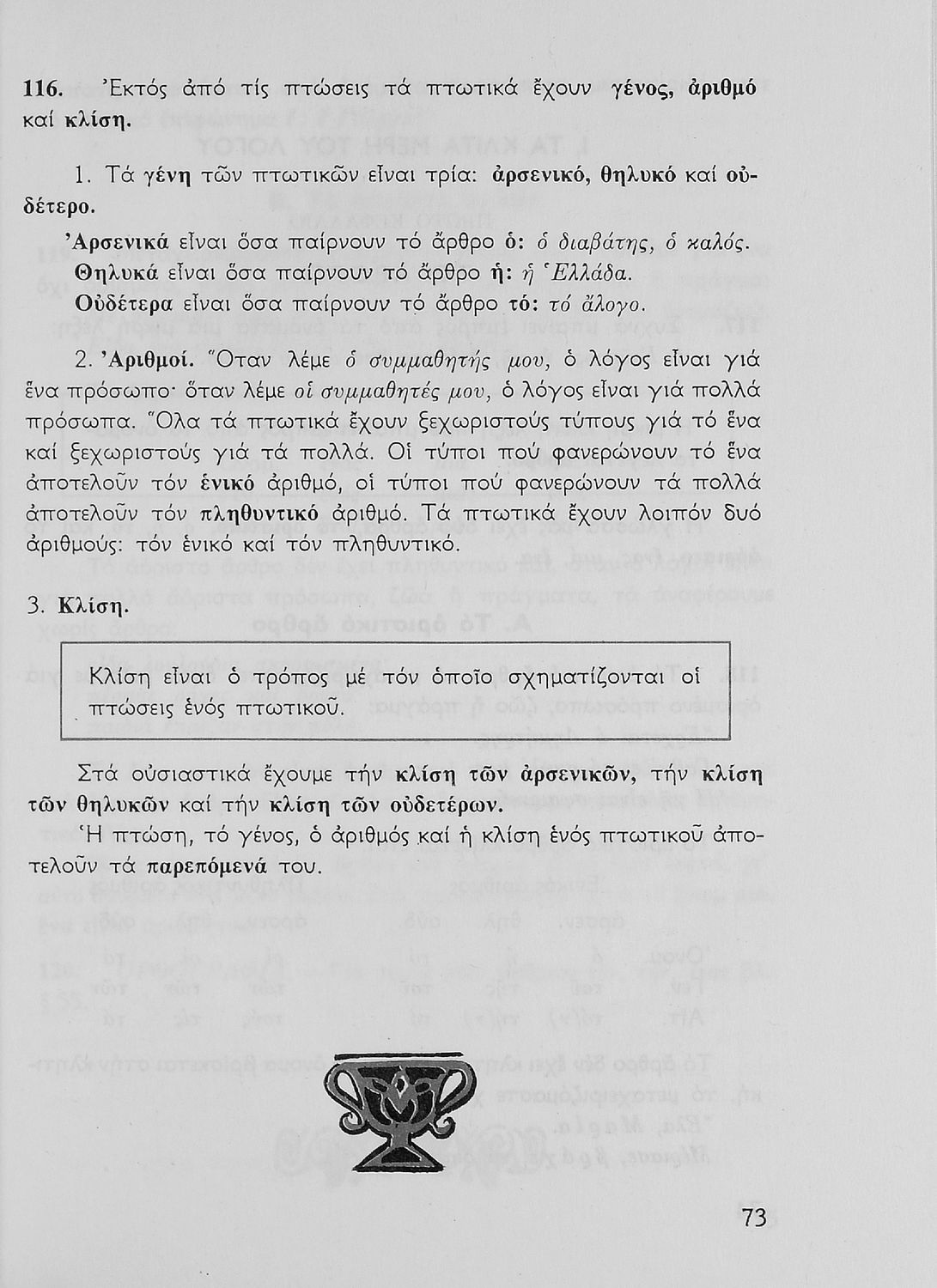 Σχολικό εγχειρίδιο Γλώσσας και Νέων Ελληνικών που περιέχει τους κανόνες γραμματικής της νεοελληνικής, κείμενα και ασκήσεις για τη διδασκαλία της γραμματικής, ορθογραφικό οδηγό και κατάλογο ανώμαλων ρημάτων.