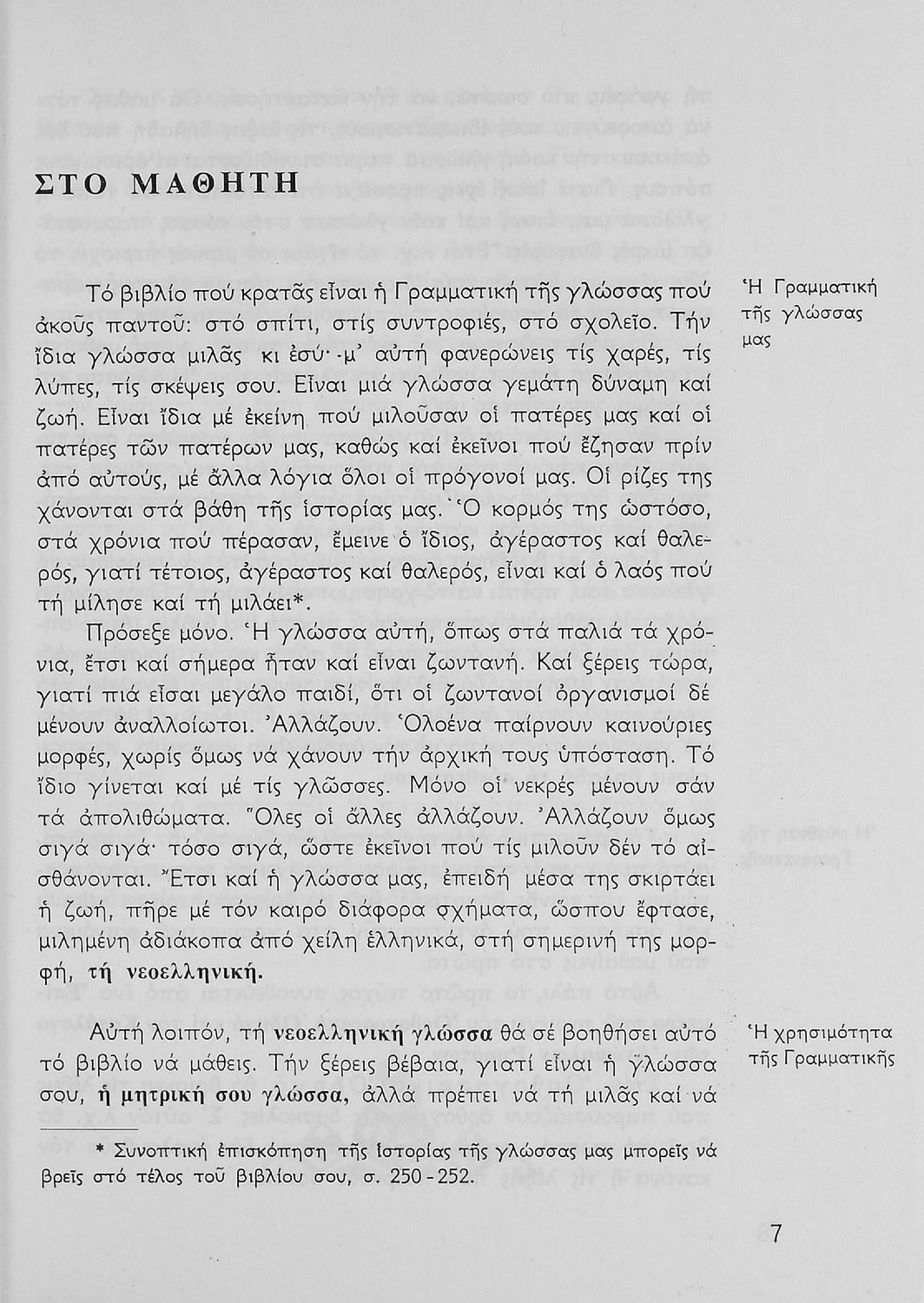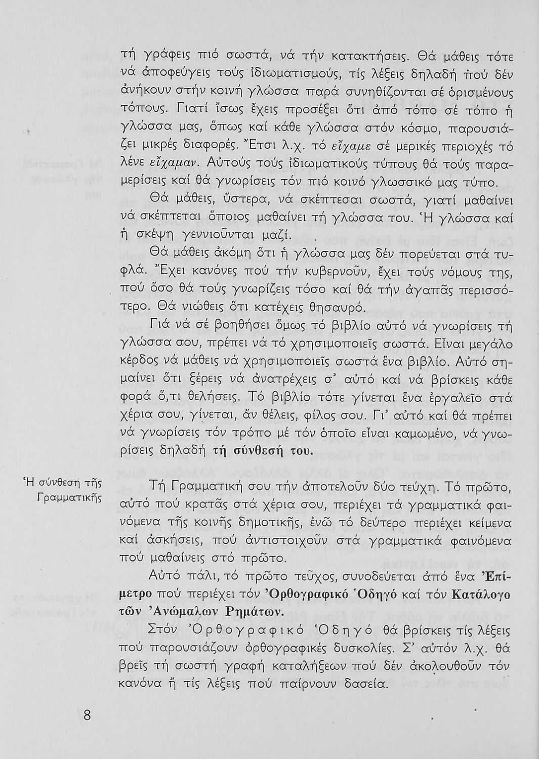 Παρουσίαση περιεχομένου: Σχολικό εγχειρίδιο Γραμματικής που αποτελεί αναπροσαρμογή του βιβλίου του Μανόλη Τριανταφυλλίδη στη σχολική πραγματικότητα. Το σχολικό εγχειρίδιο αποτελούσε βοήθημα για μαθητές και εκπαιδευτικούς στο γλωσσικό μάθημα.