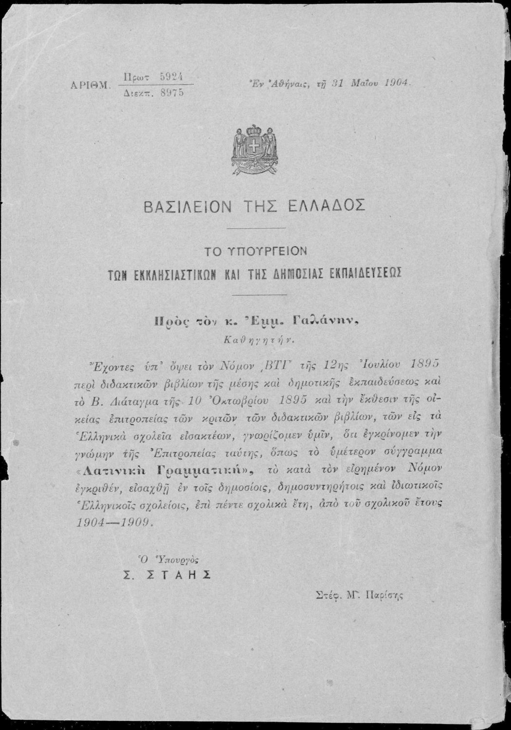 Εκδότης: Βιβλιοπωλείο Αποστολόπουλος Έτος έκδοσης: 1904 Τόπος έκδοσης: Αθήνα Υπουργική απόφαση / Σύμβαση: 5924/31-5-1904 Έτος έγκρισης: 1904 |