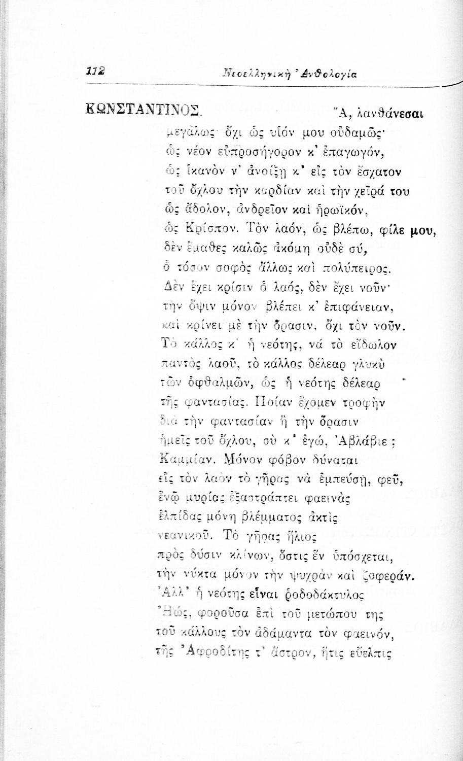Σχολικό εγχειρίδιο Νέων Ελληνικών για τους μαθητές των Διδασκαλείων. Περιλαμβάνει ποιήματα Ελλήνων λογοτεχνών. Στο τέλος του βιβλίου υπάρχουν βιογραφίες των ποιητών.